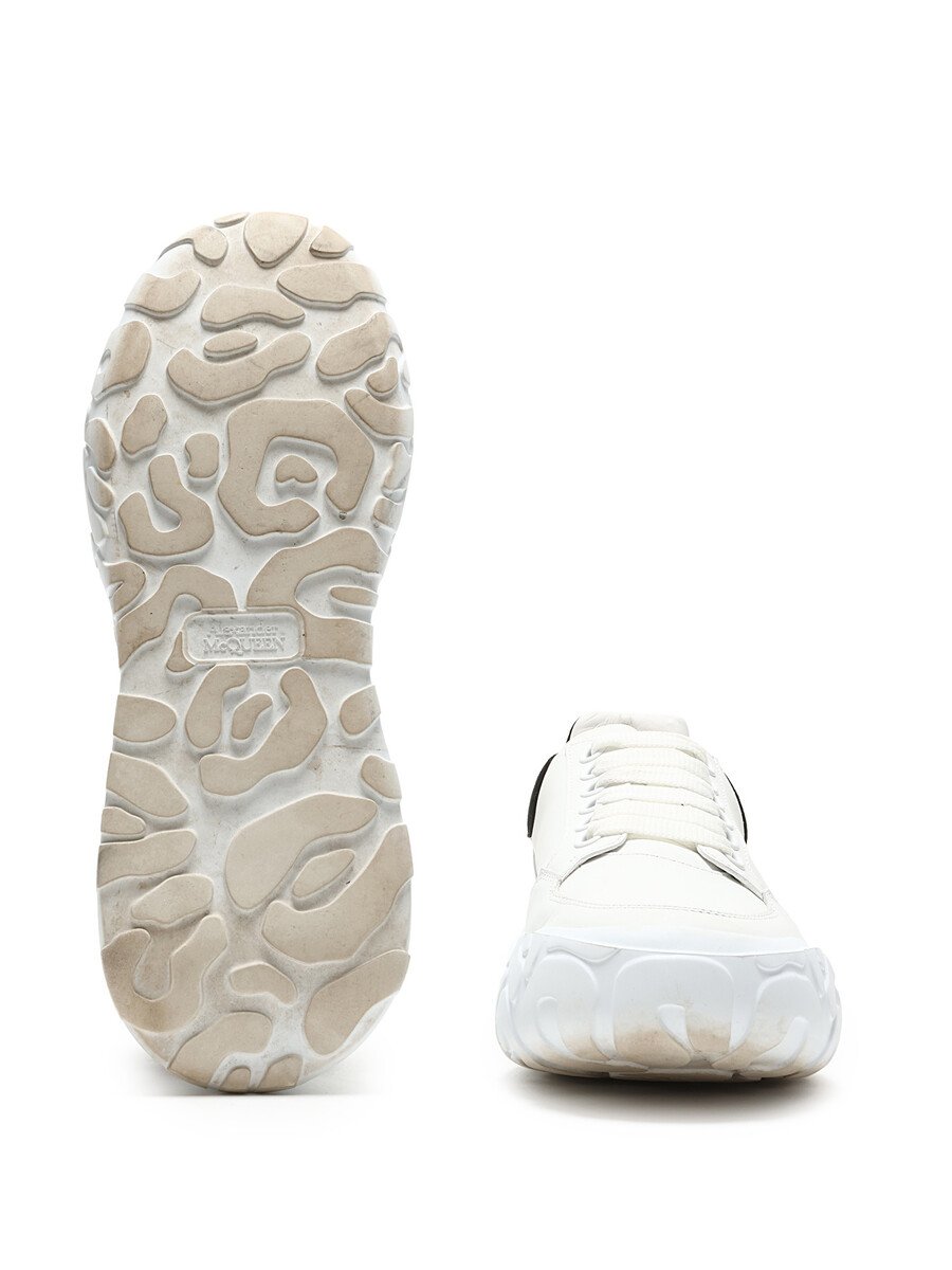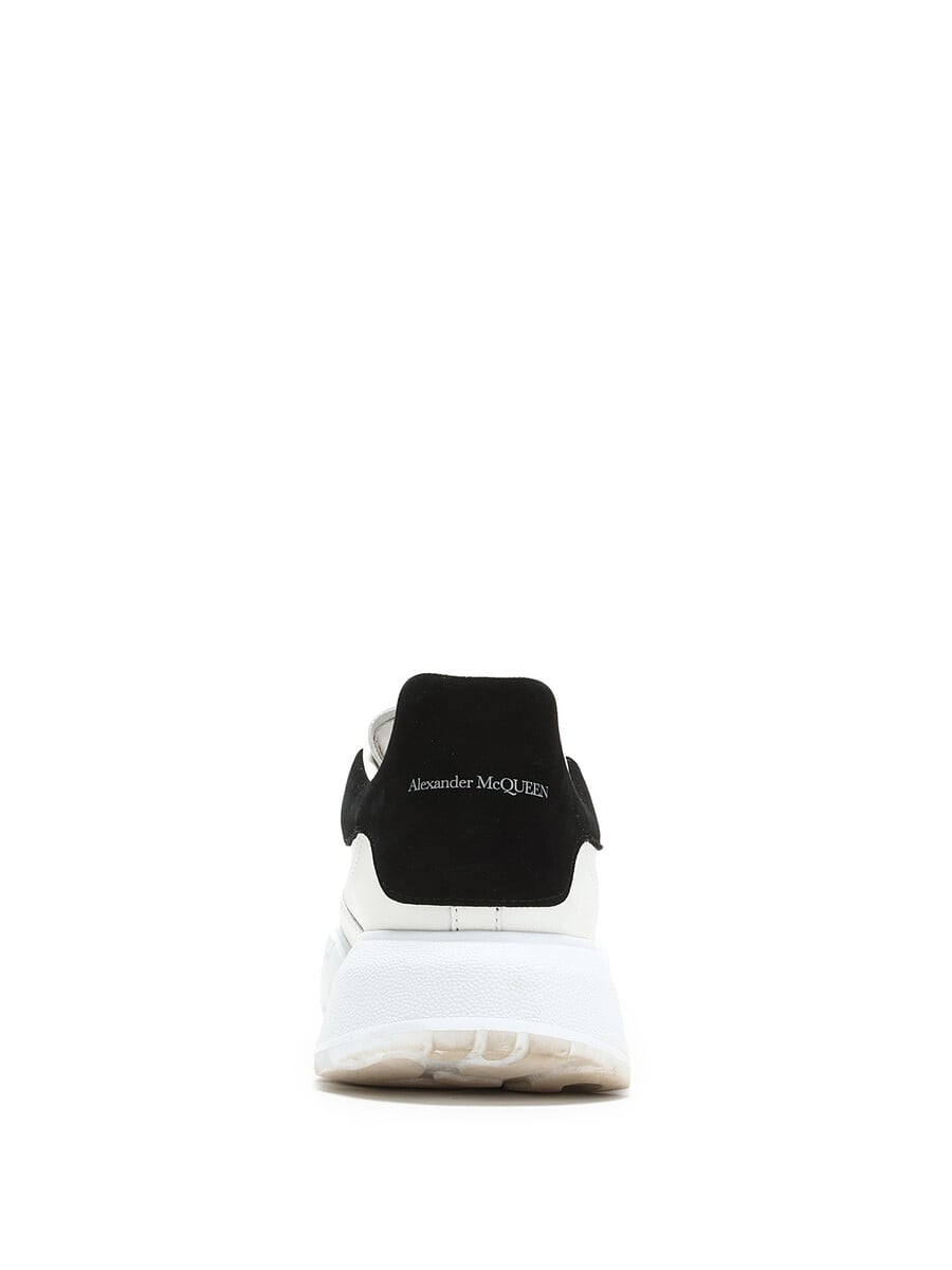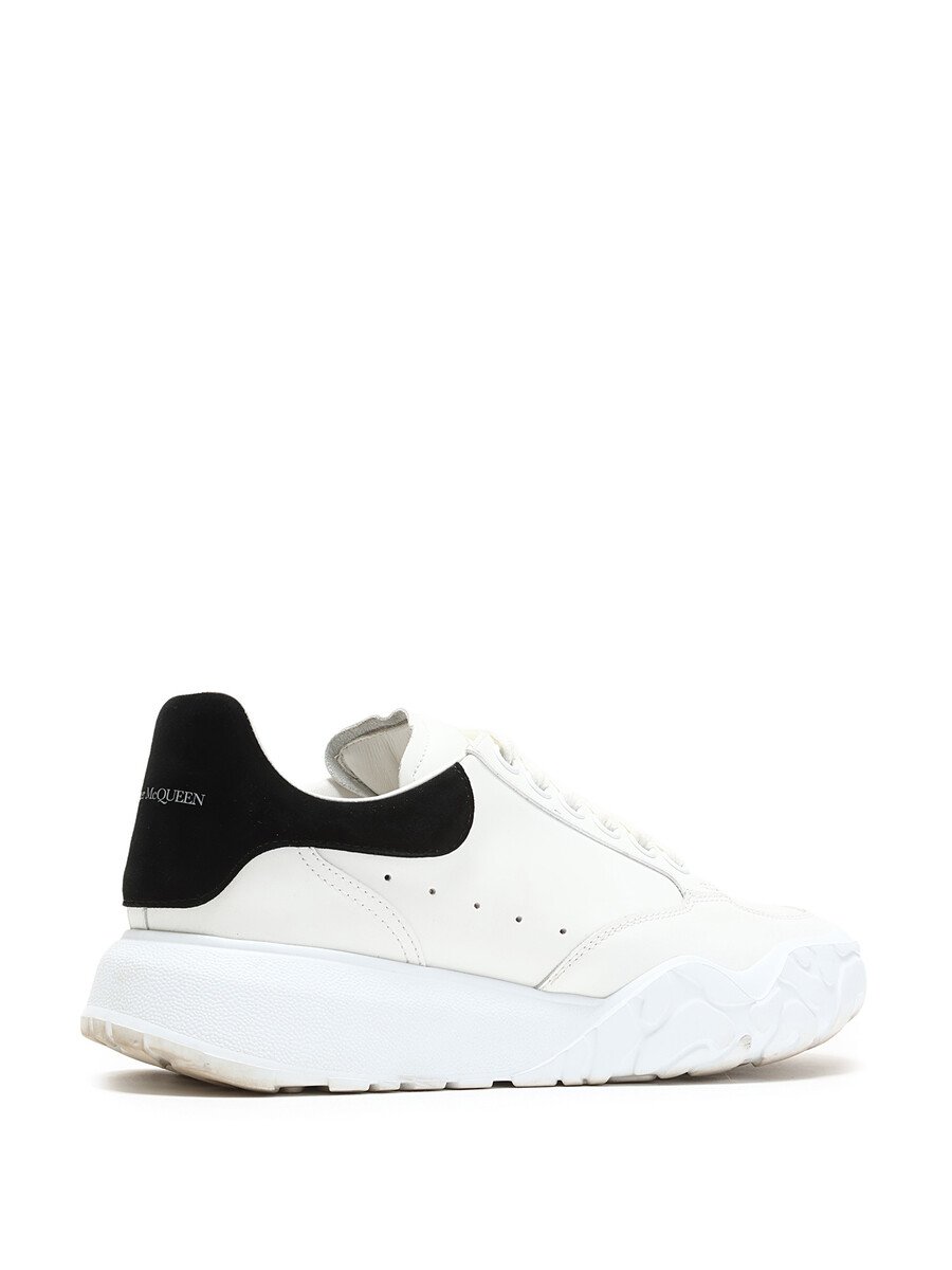 Low-top espadrilles crafted from white and black leather and suede. Features round closed toe and lace-up closure. Serrated rubber sole.