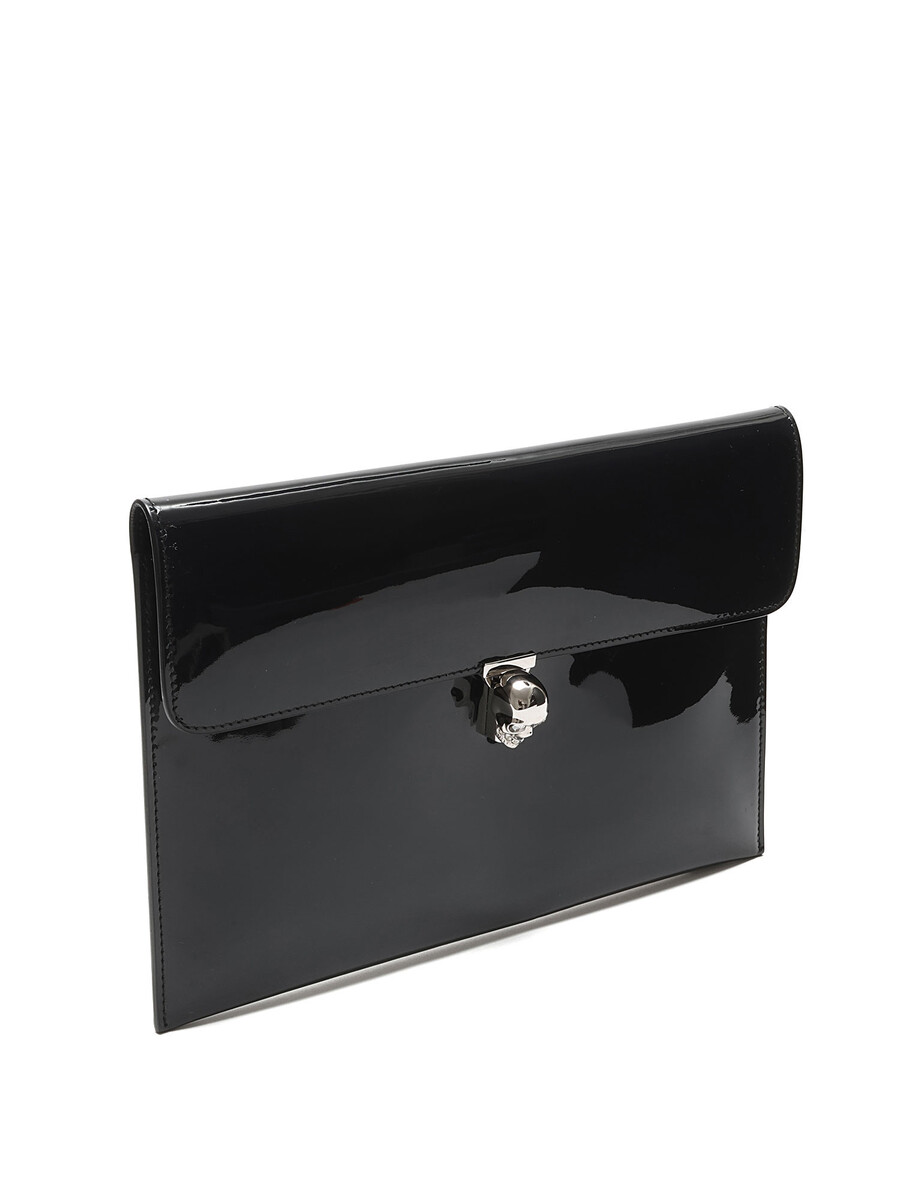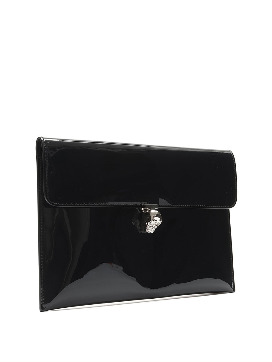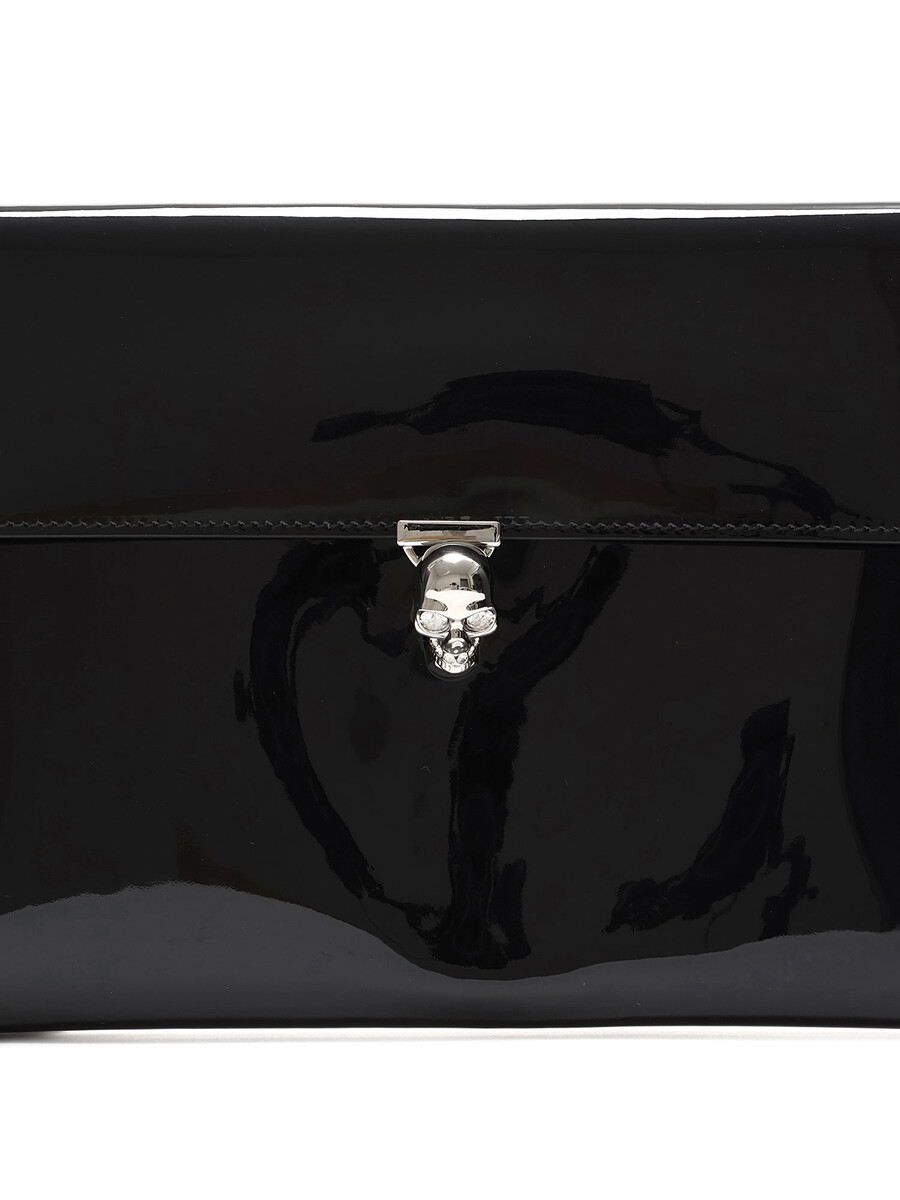Patent leather clutch with a skull-shaped turn-lock closure. Silver-tone metal hardware. Lined interior.