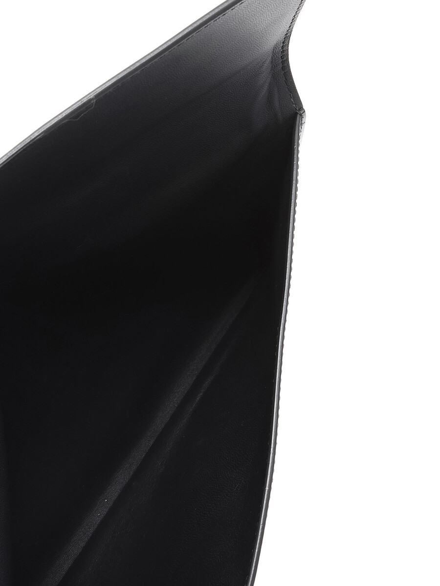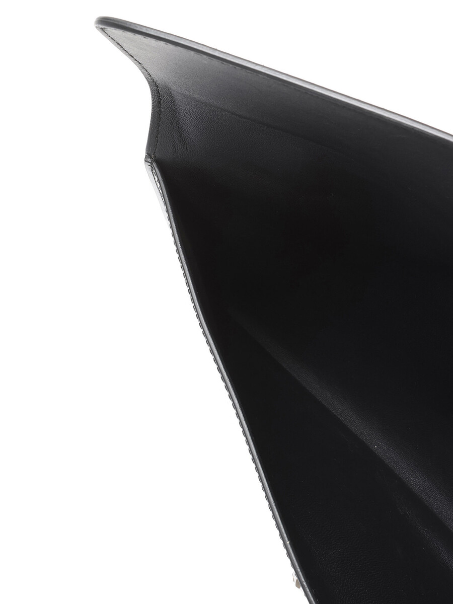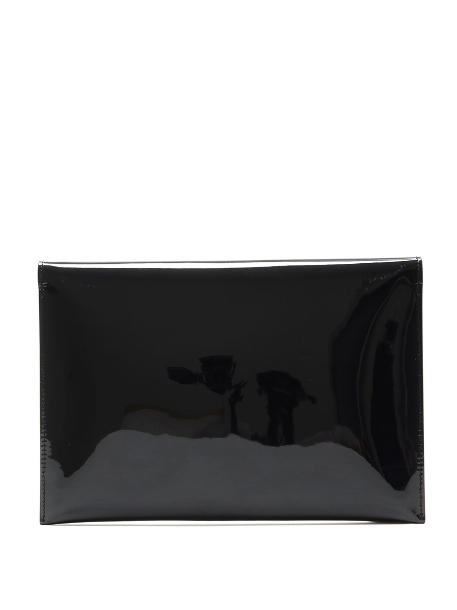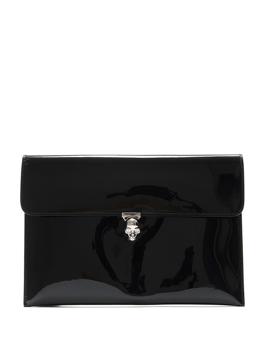 Patent leather clutch with a skull-shaped turn-lock closure. Silver-tone metal hardware. Lined interior.