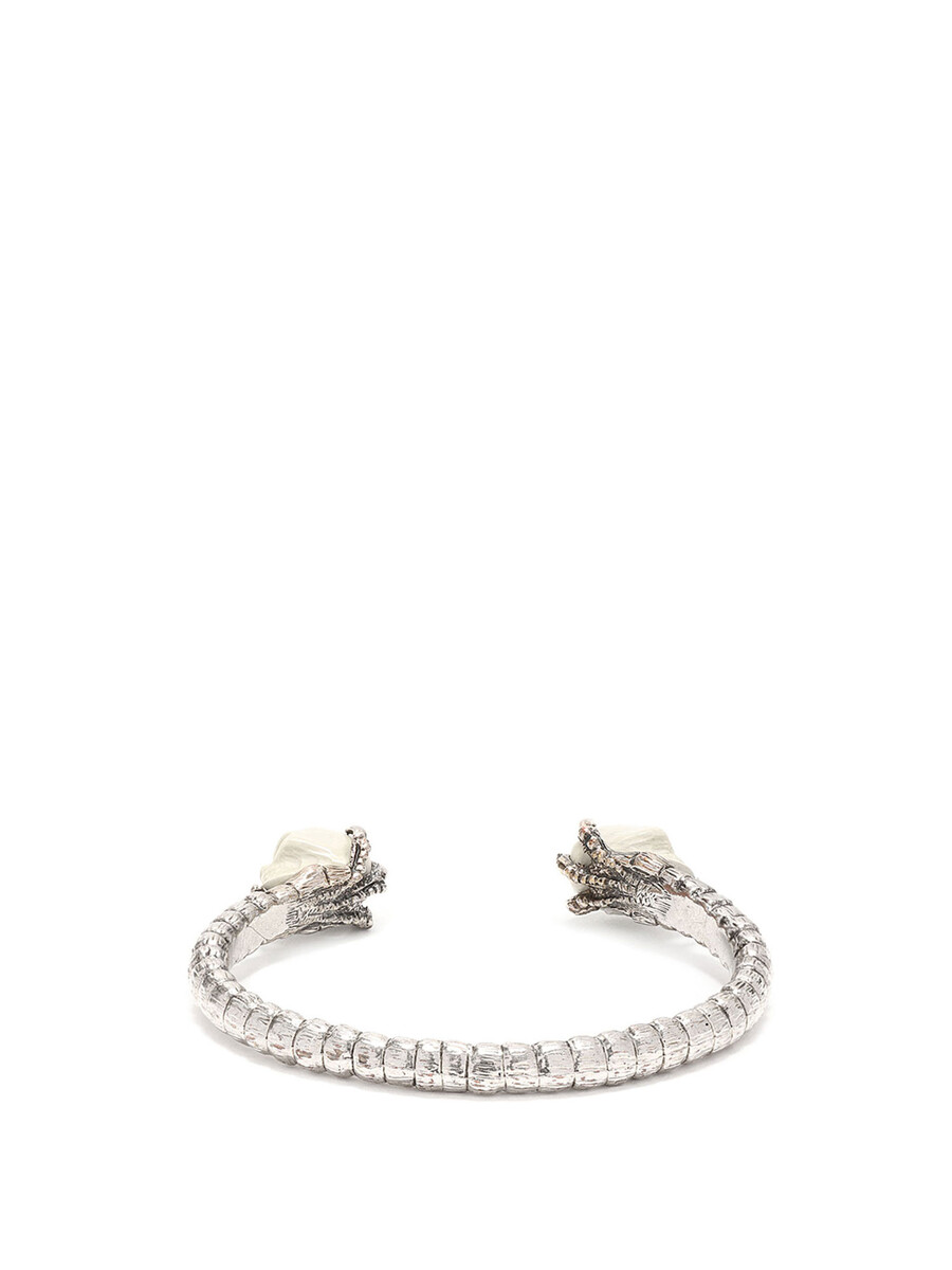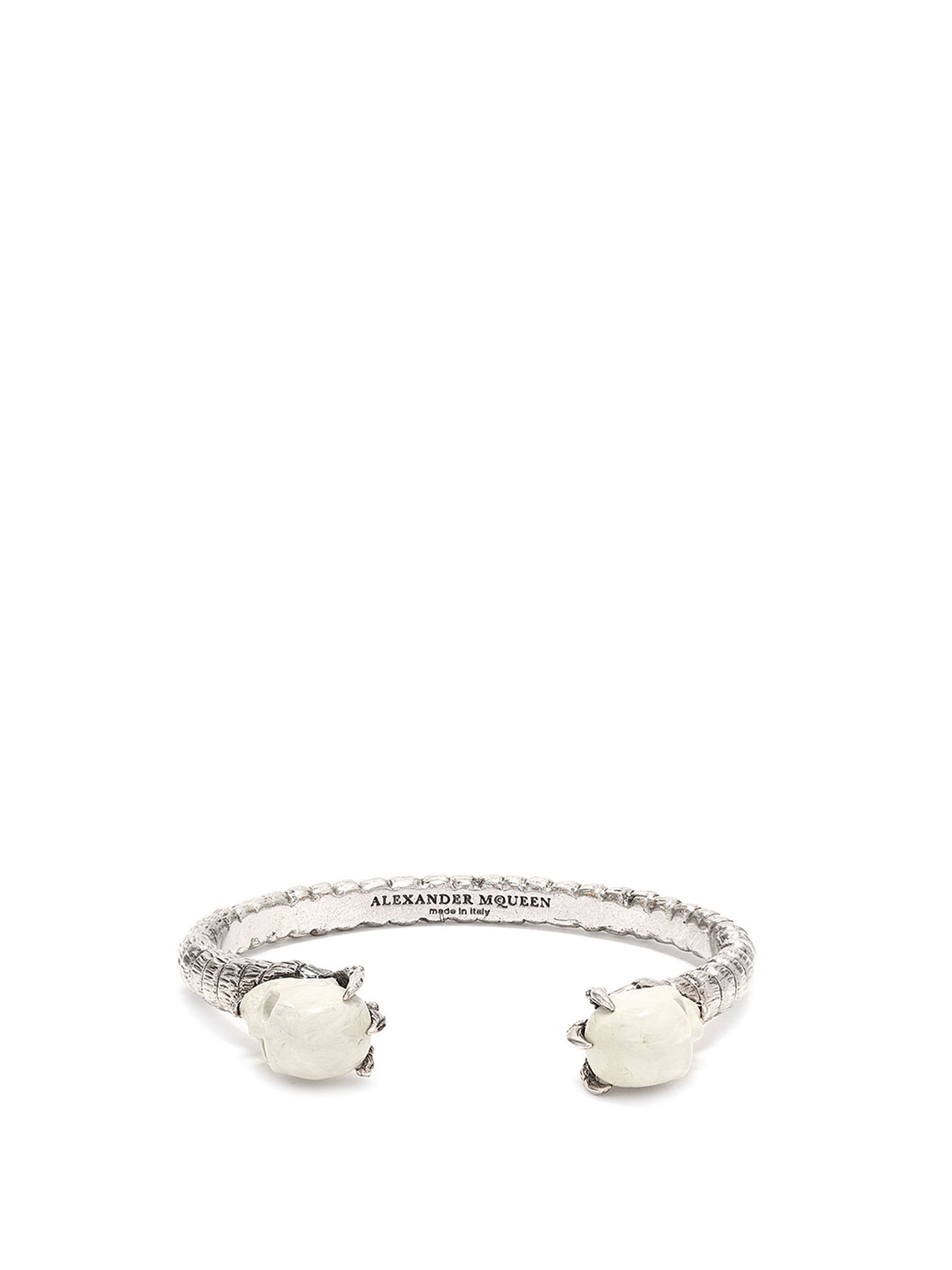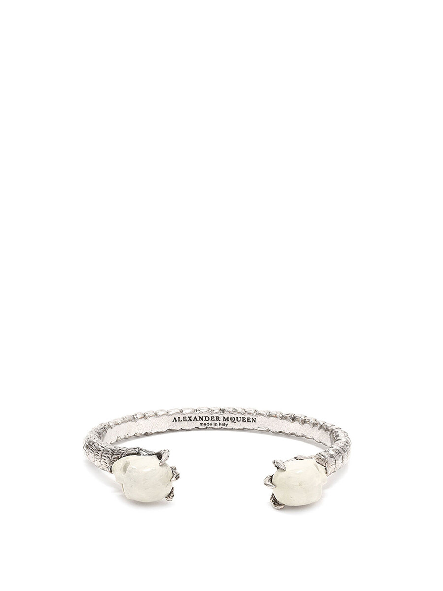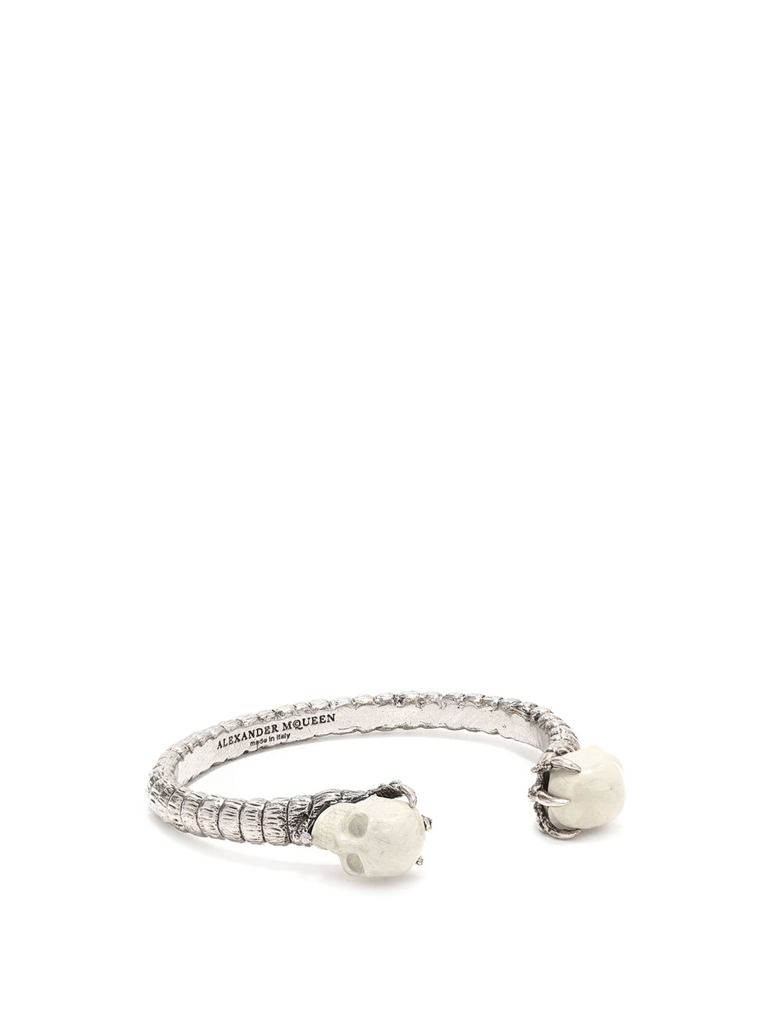Silver-tone metal cuff bracelet featuring skulls at the ends.