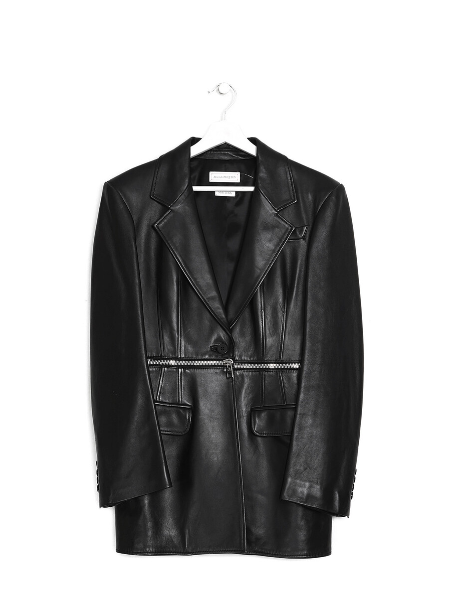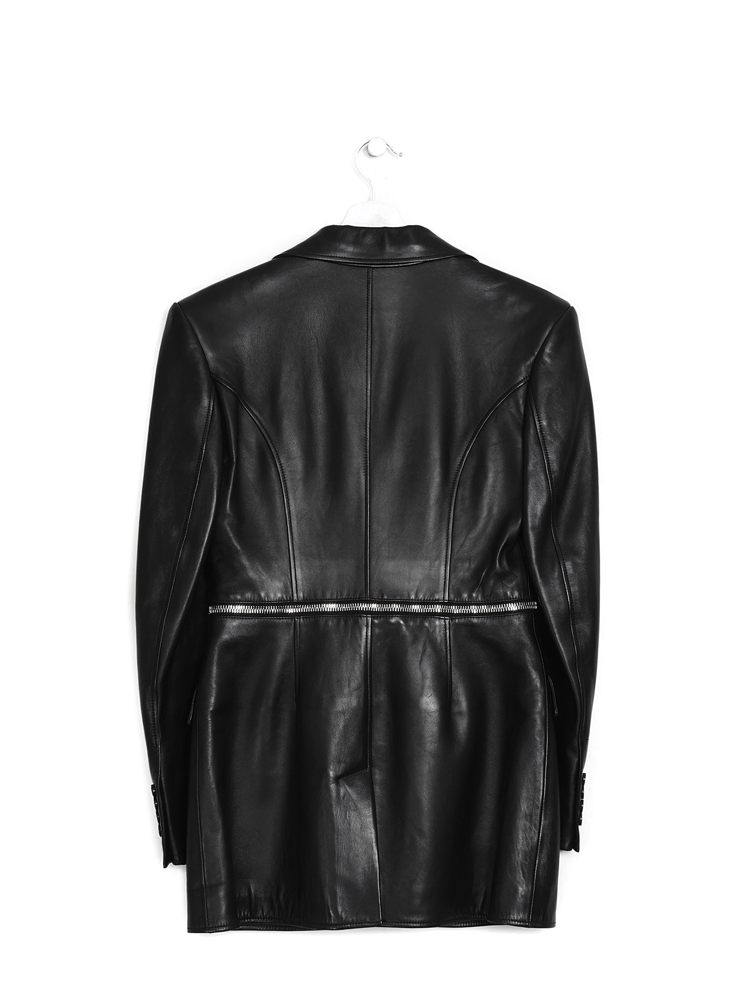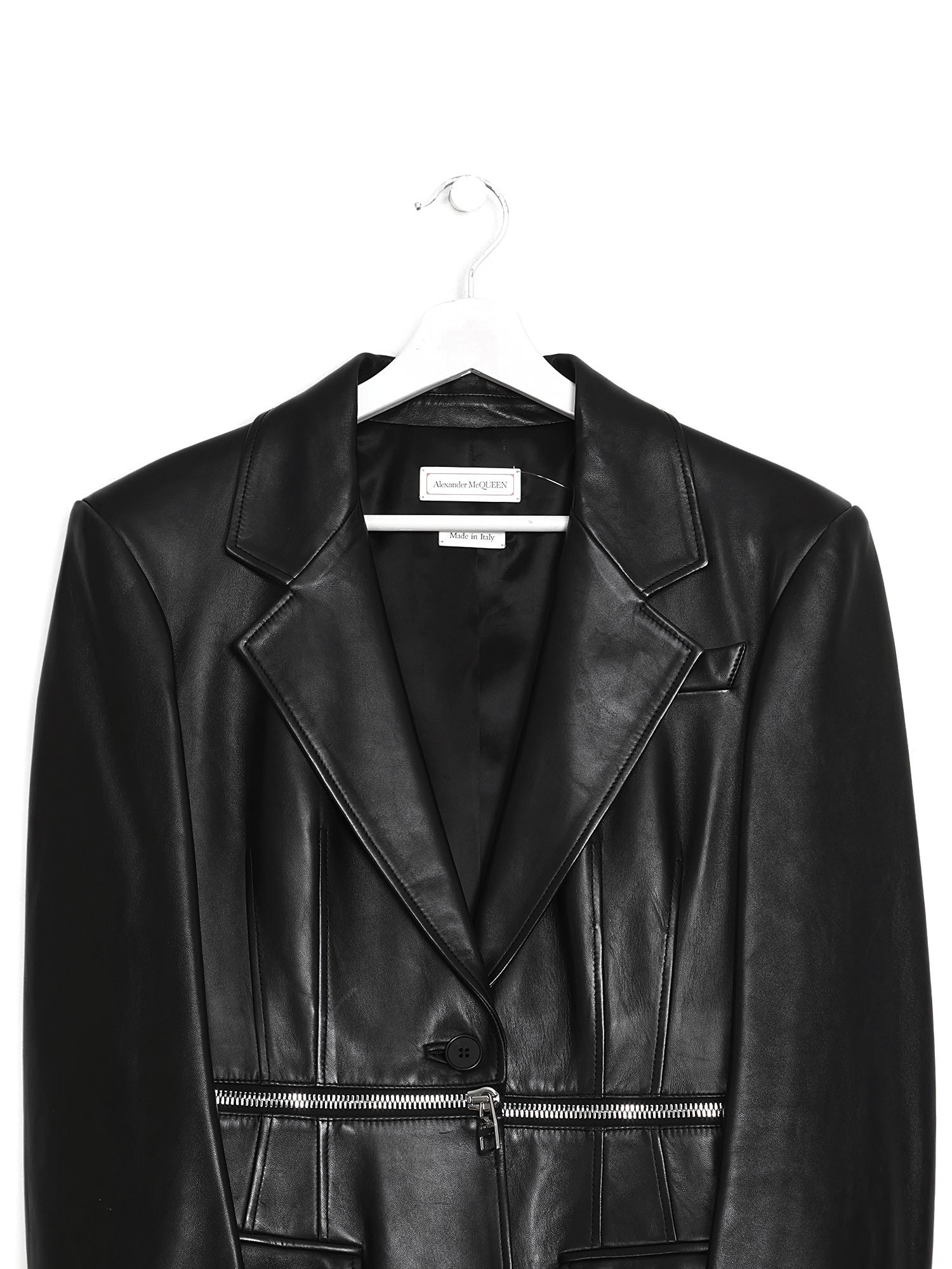 Long sleeve leather blazer in black. Front button closure. Notched lapel collar. Flap pockets at the front.