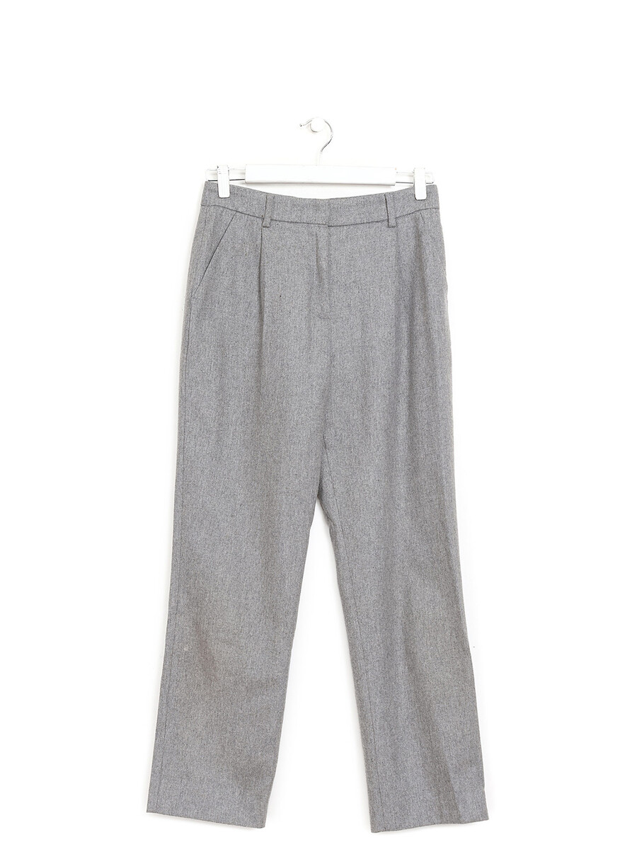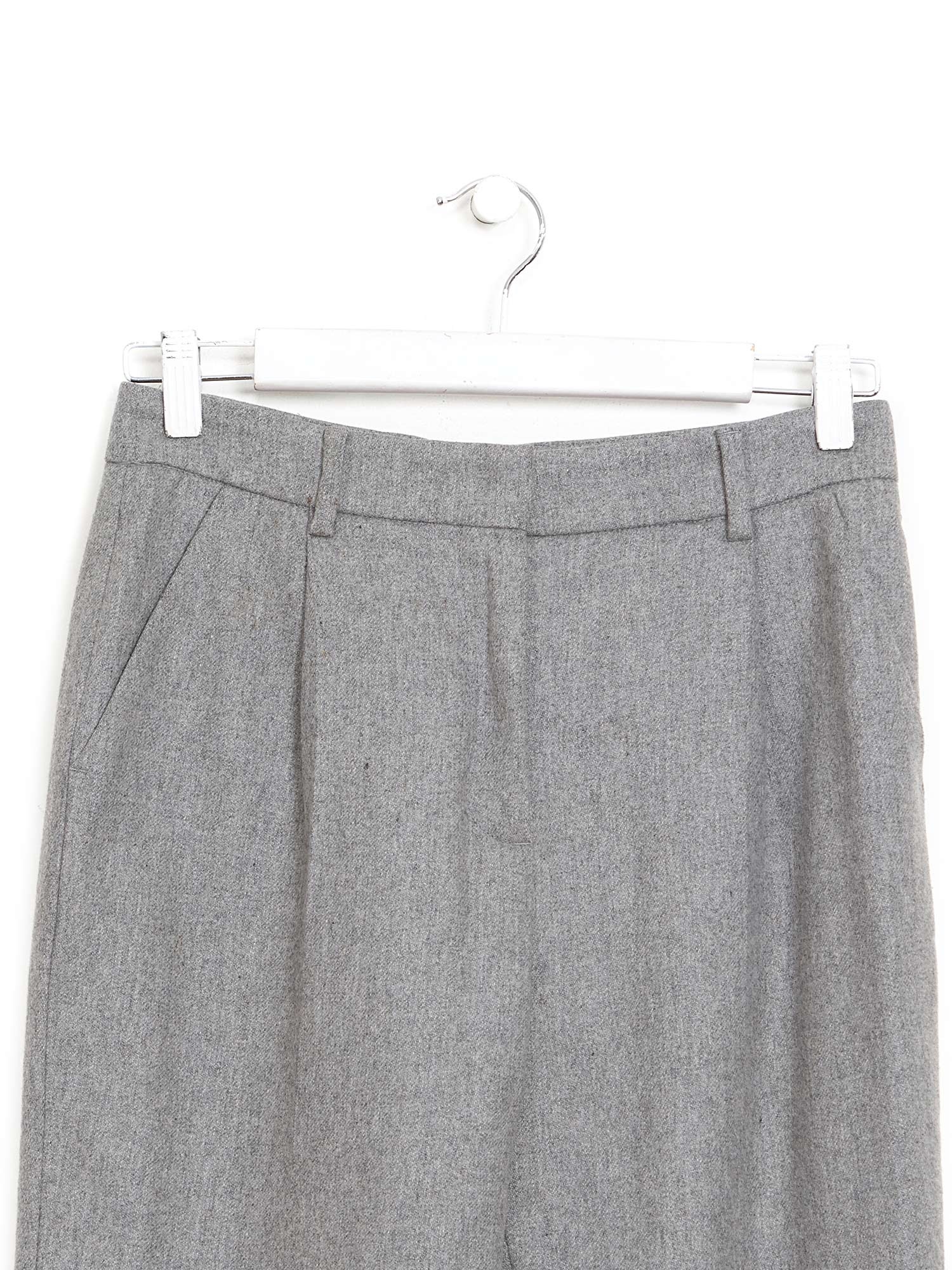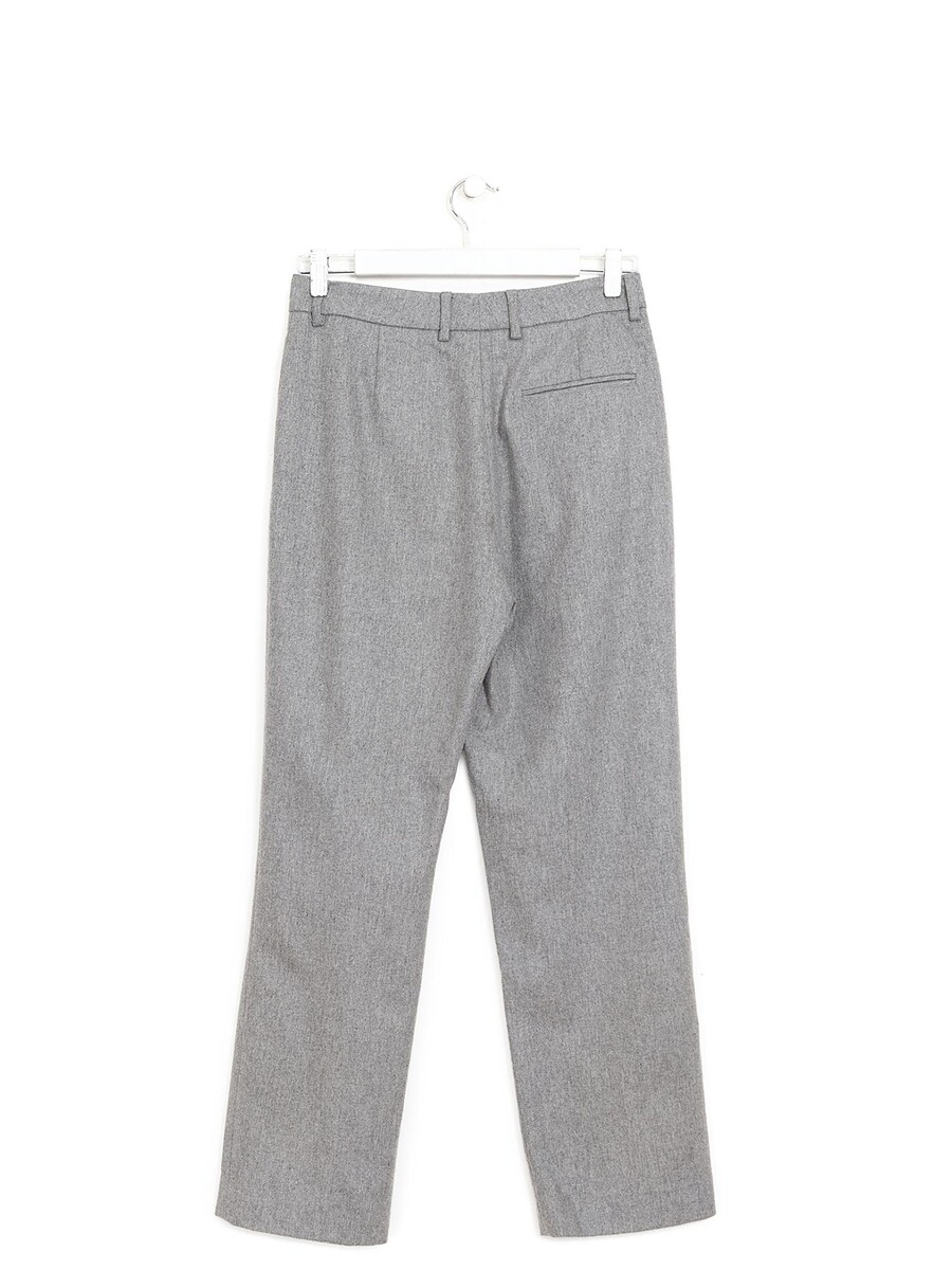 Slim leg trousers in gray. Front zipper closure with tab pull. Welt pockets at the back. Crafted from a soft wool blend.