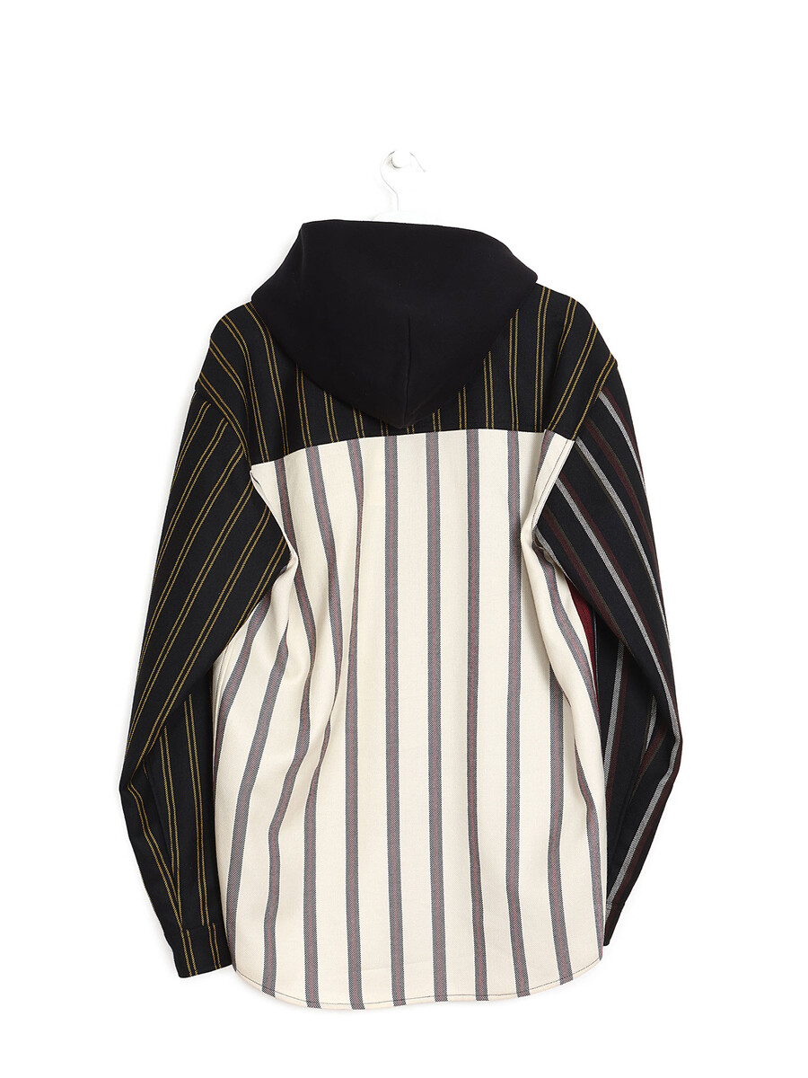 Long sleeve shirt in multi-colored stripes. Button front closure. Hood detail.