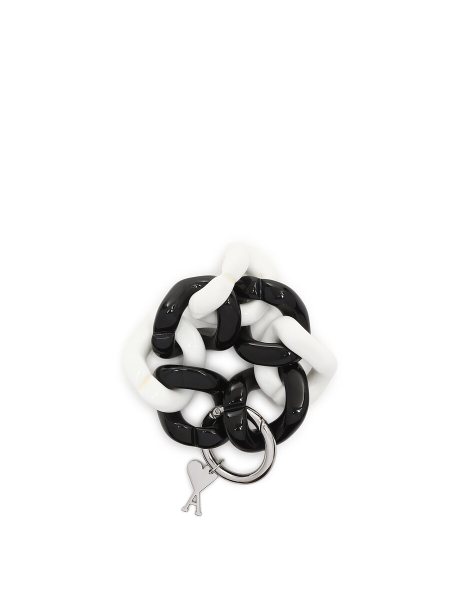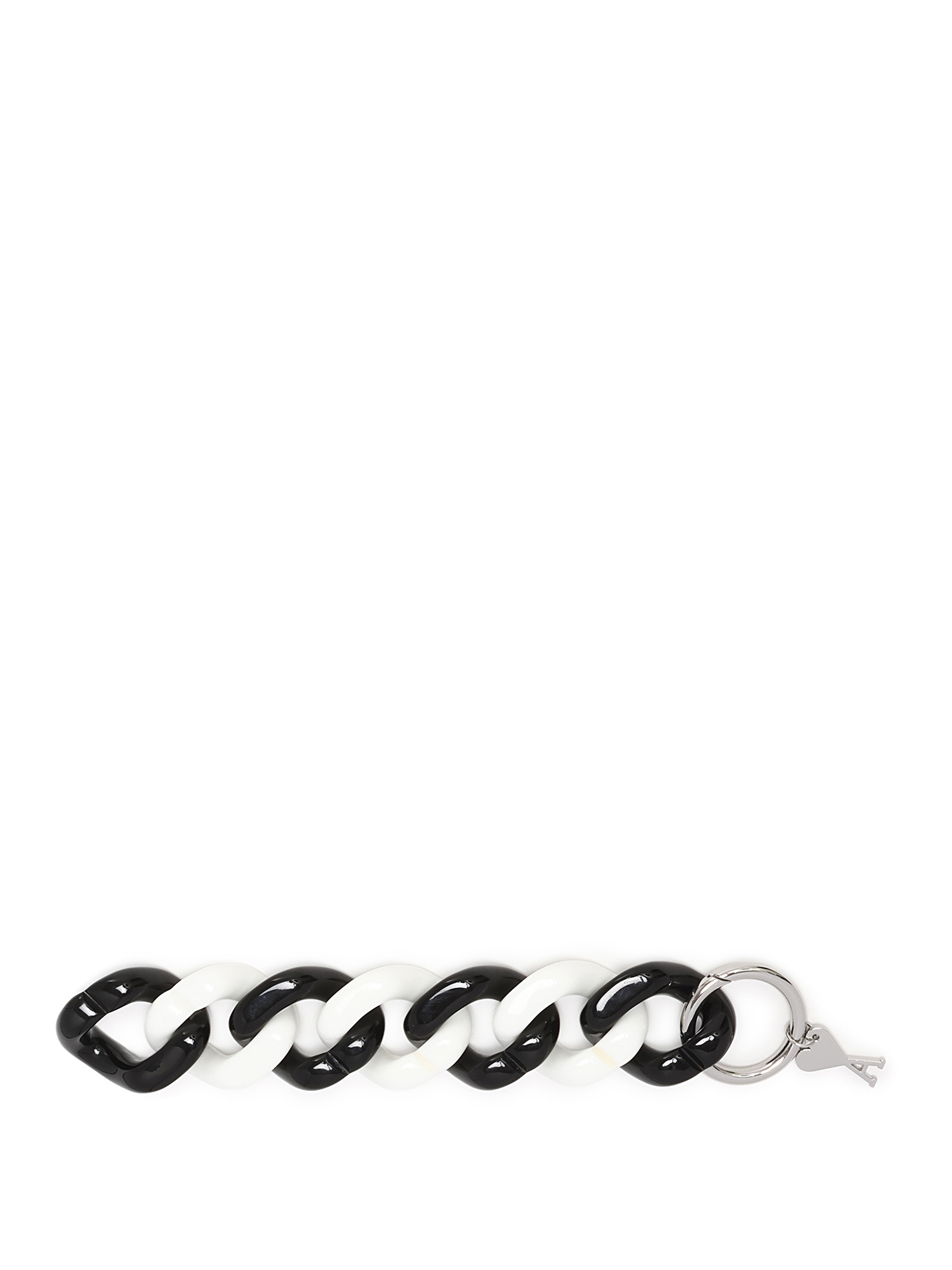 Chunky acetate link bracelet in black and white. Silver-tone round clasp. Heart-shaped charm. Includes box.