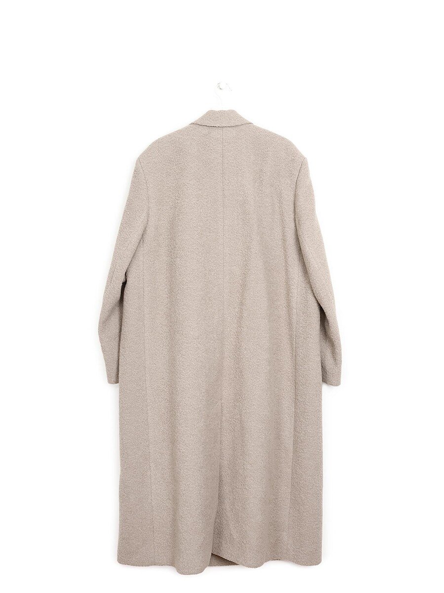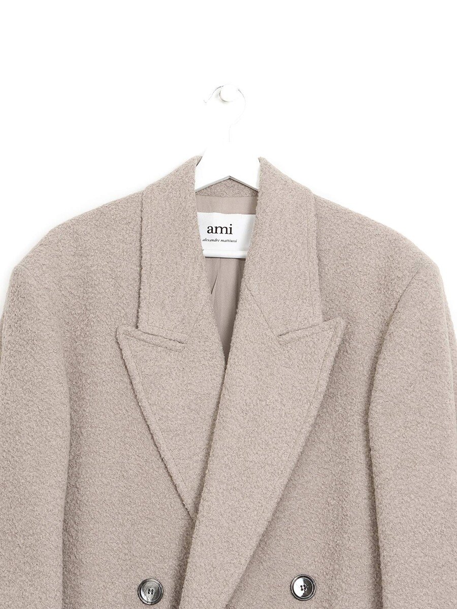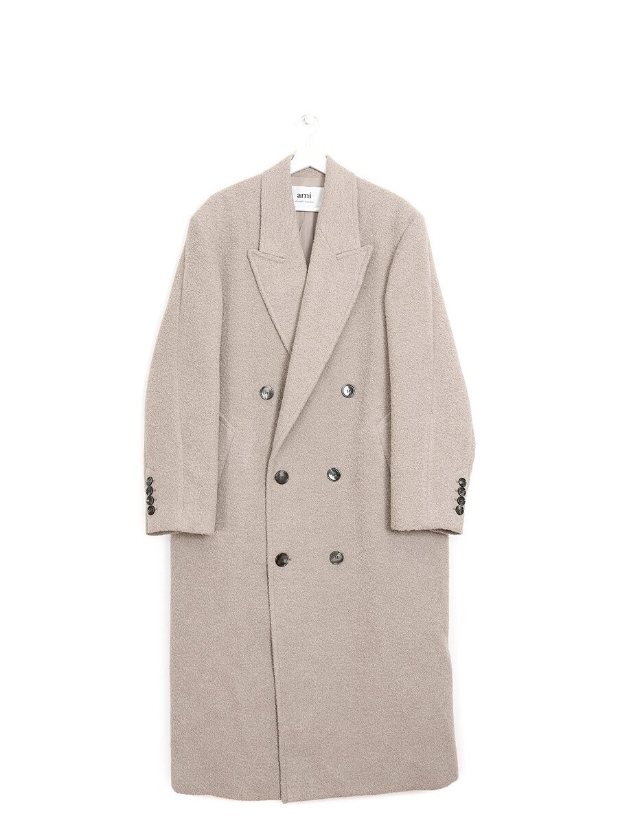 Double-breasted wool coat in beige. Features a button front closure and lapel notch collar. Patch pockets with flaps.