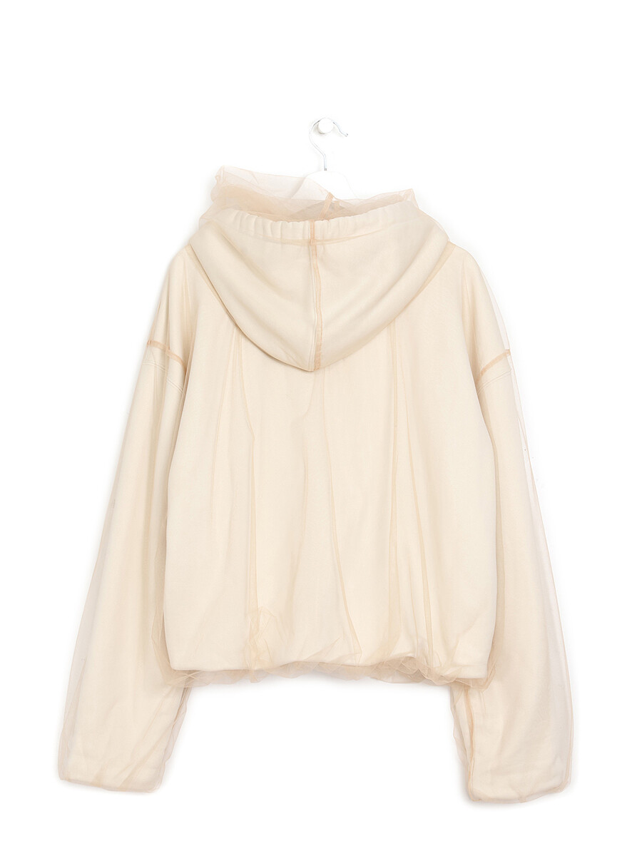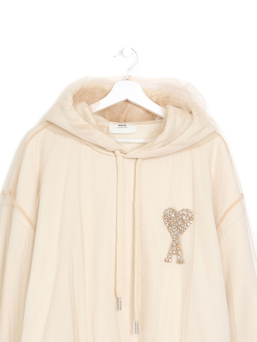 Beige hoodie featuring a strass-incrusted heart appliqué at the chest with a mesh outer layer.