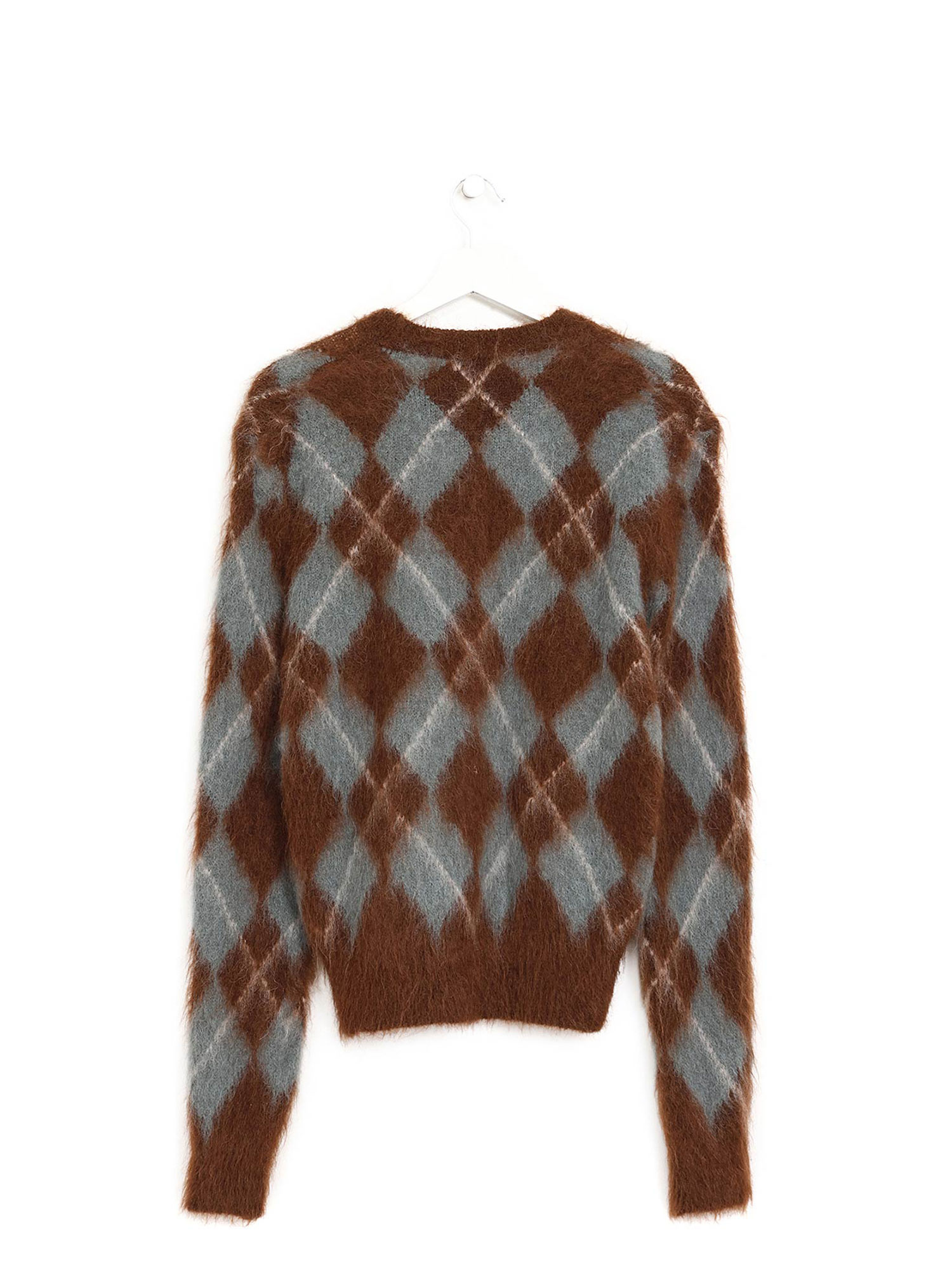 Long sleeve mohair sweater featuring a classic argyle pattern.