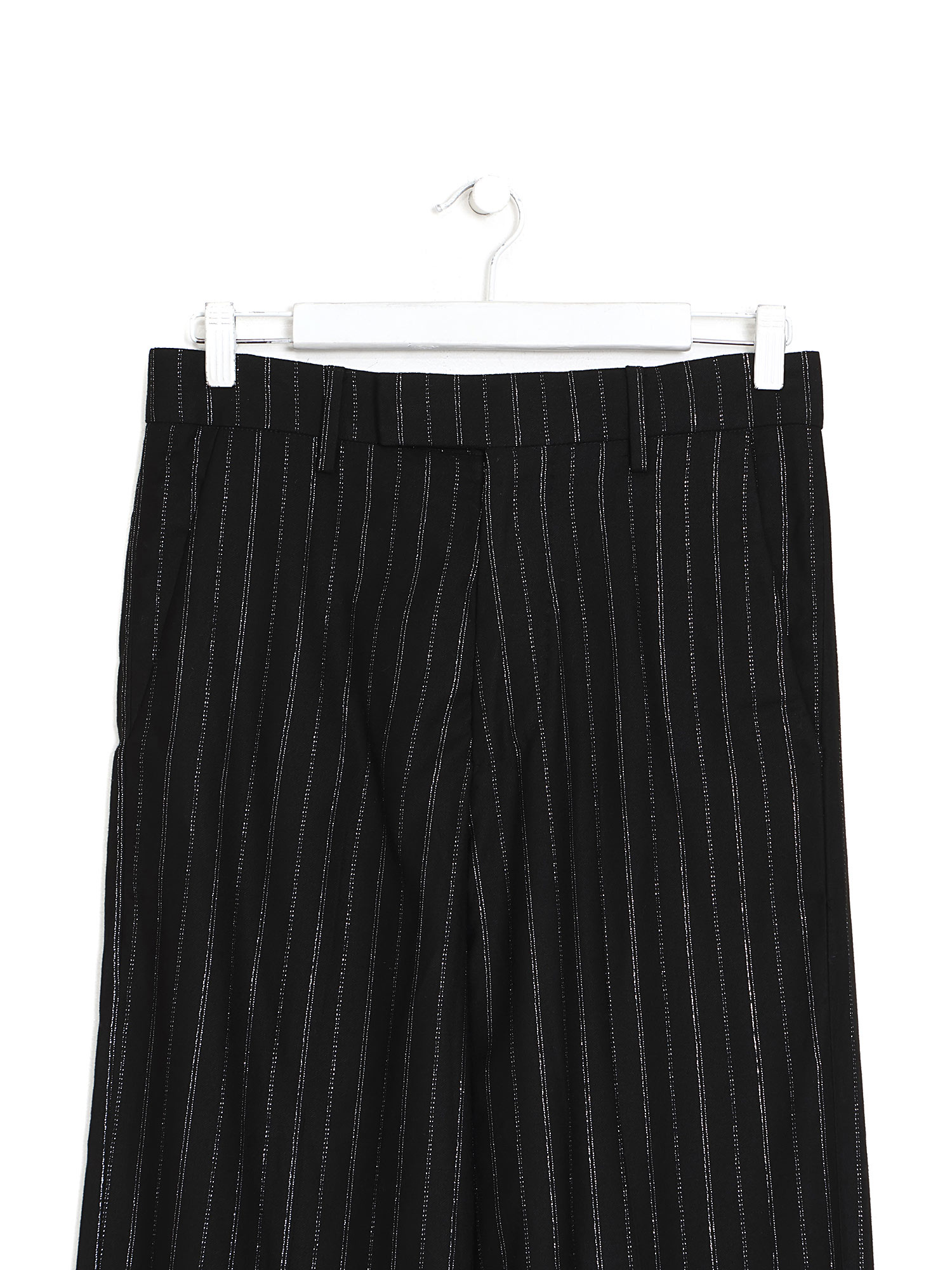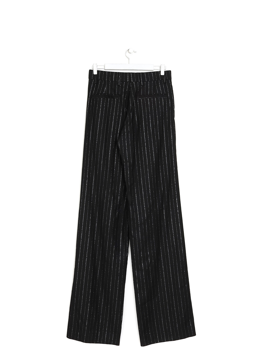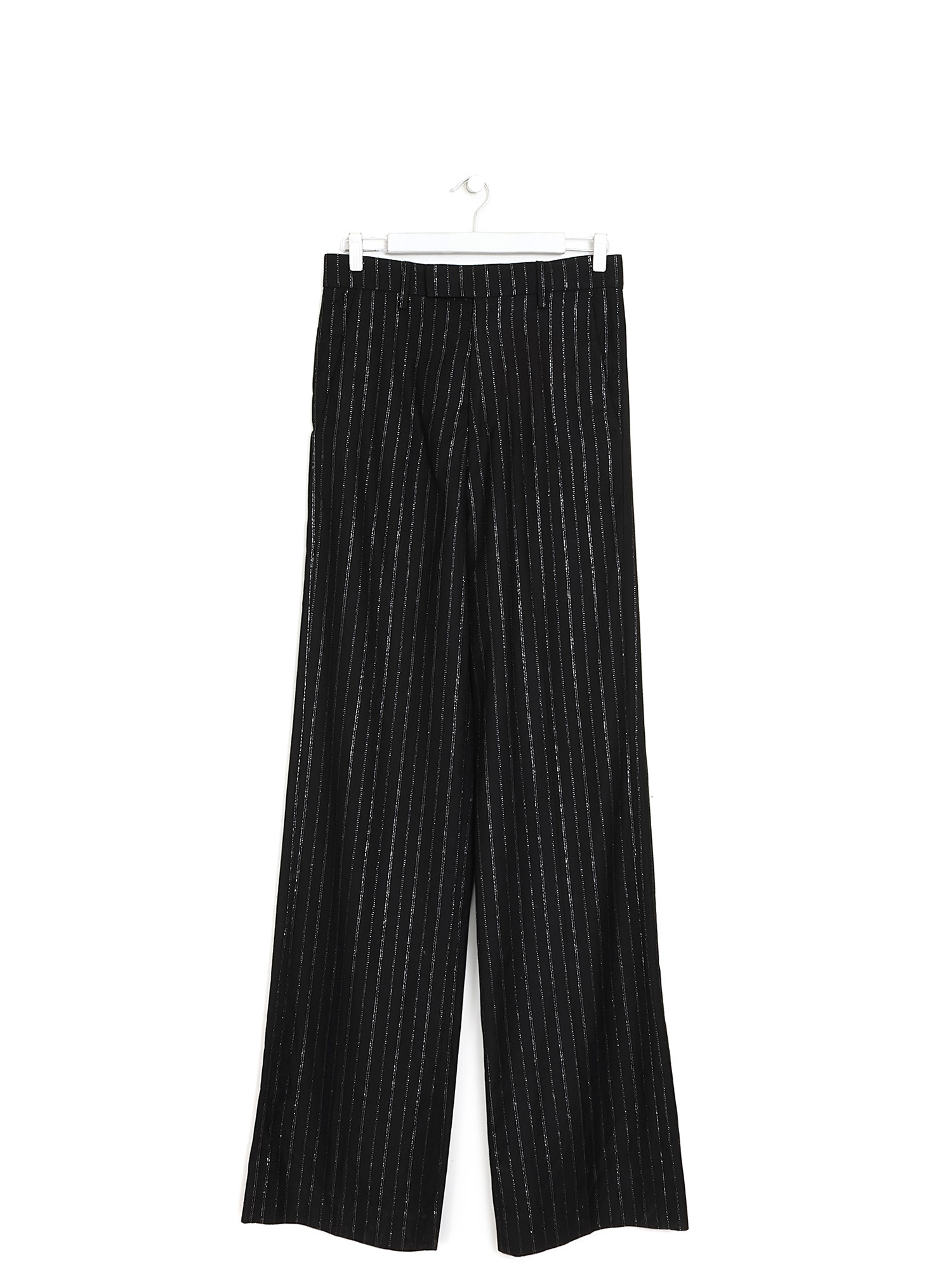 Wide-leg trousers in black featuring metallic silver pinstripes. Button closure at waist, belt loops, and welt pockets at the back.