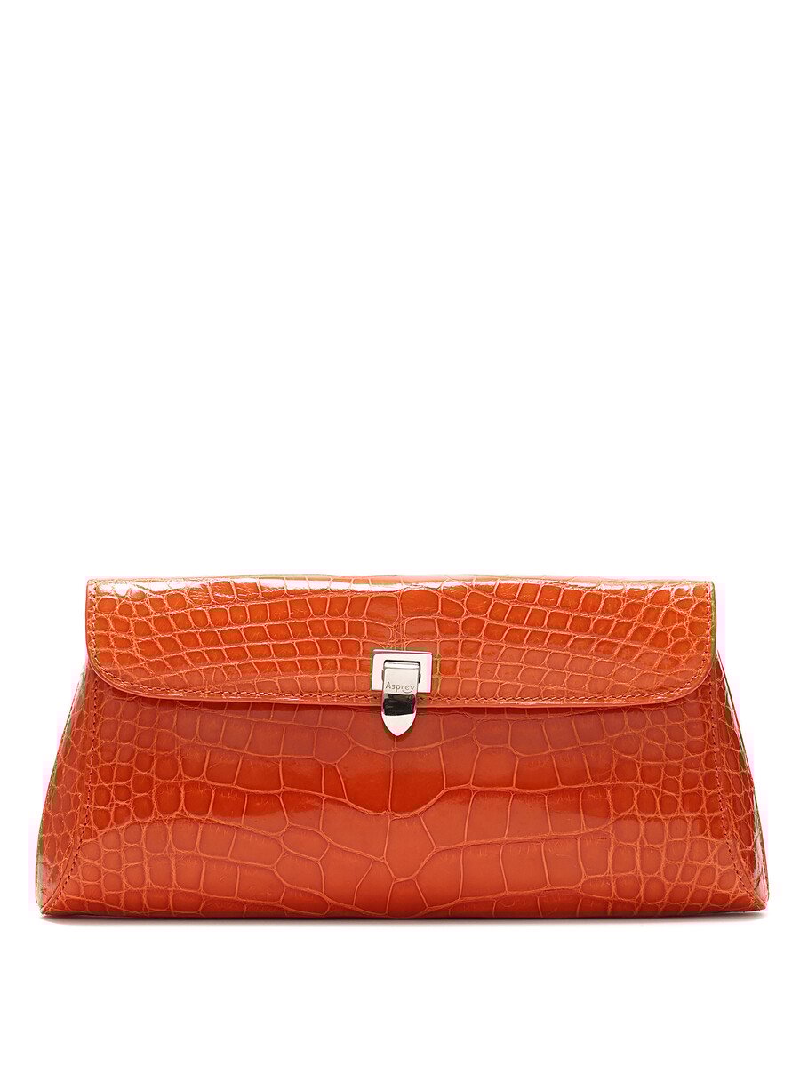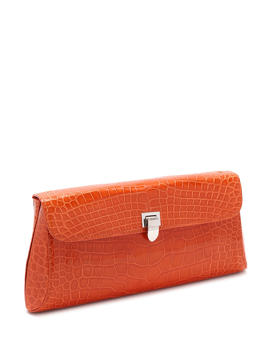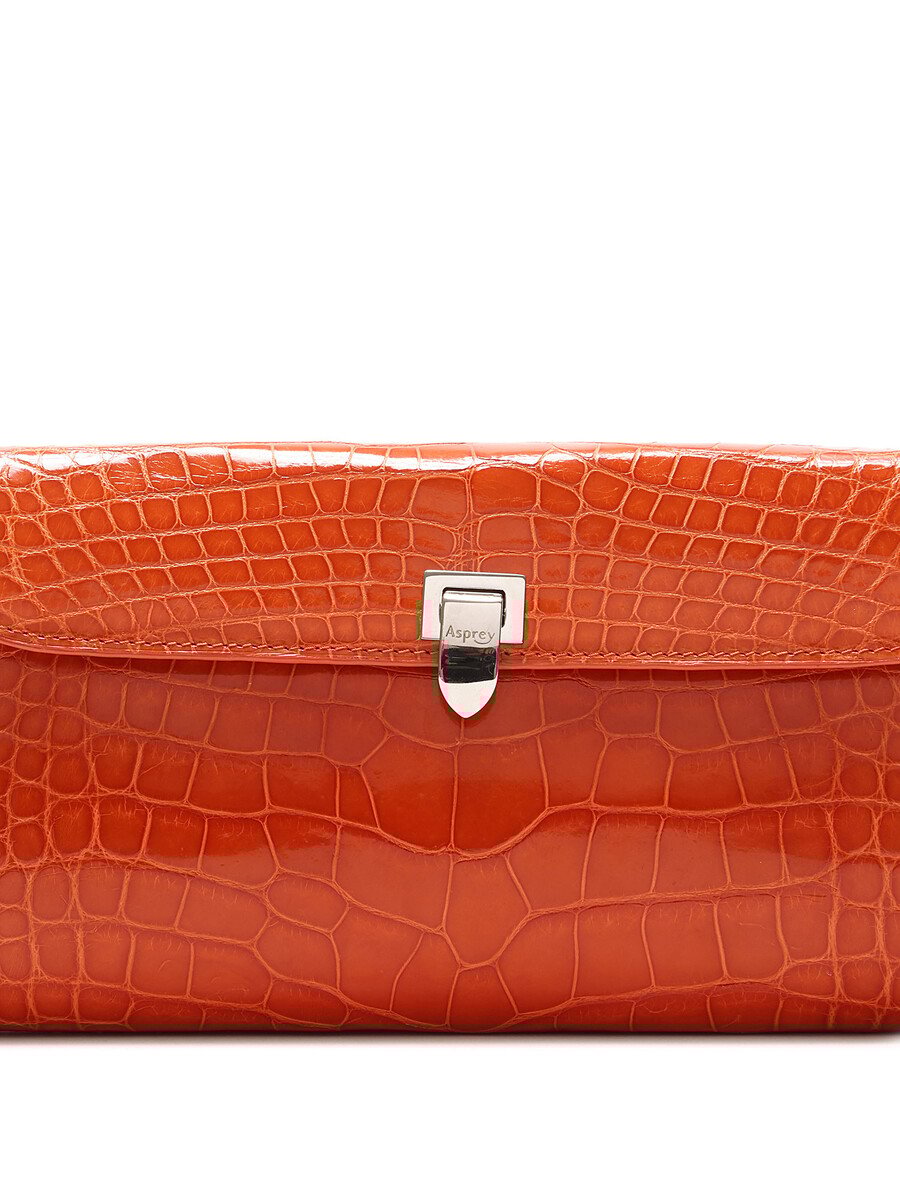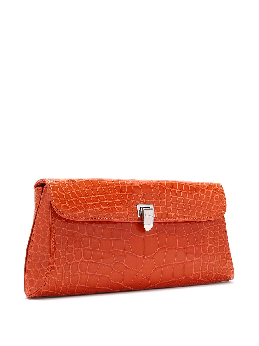 Crocodile effect leather clutch featuring a turn-lock closure. Detachable shoulder strap with silver-tone hardware. Compact size for essentials.