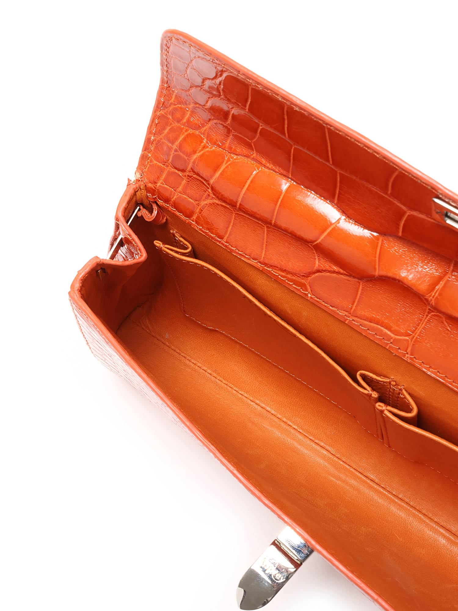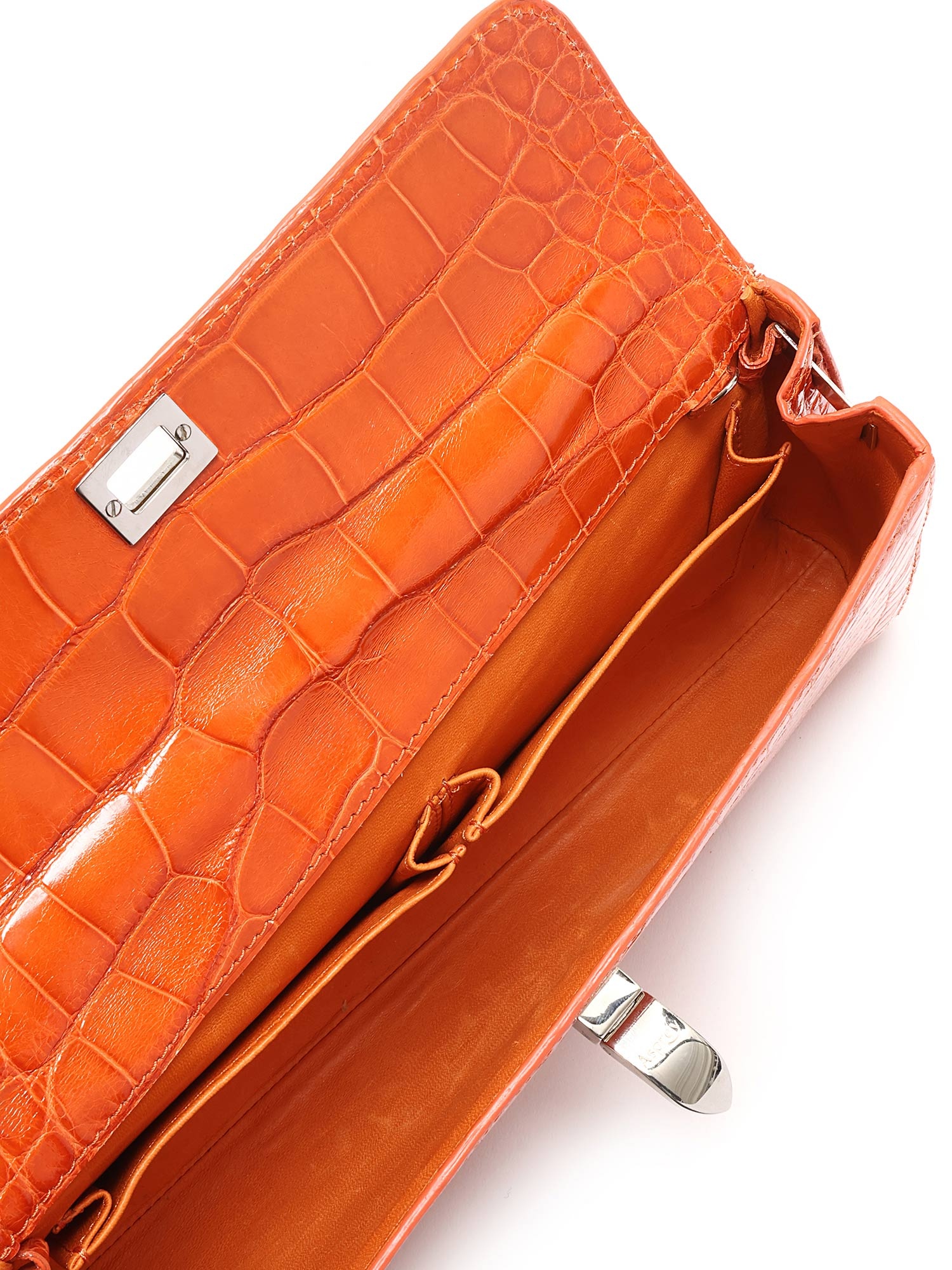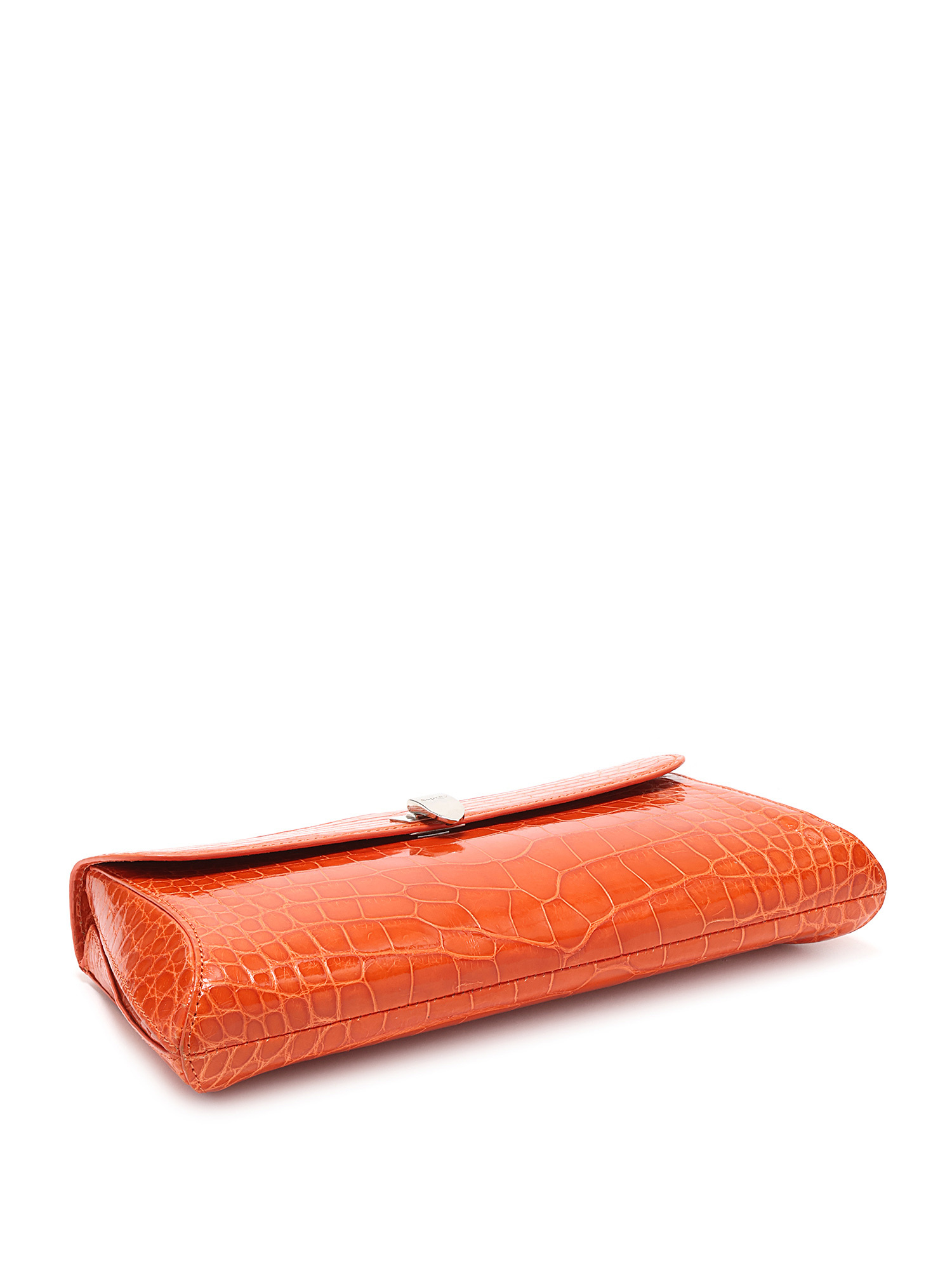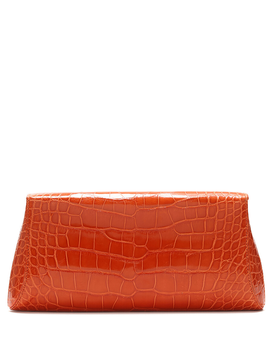 Crocodile effect leather clutch featuring a turn-lock closure. Detachable shoulder strap with silver-tone hardware. Compact size for essentials.