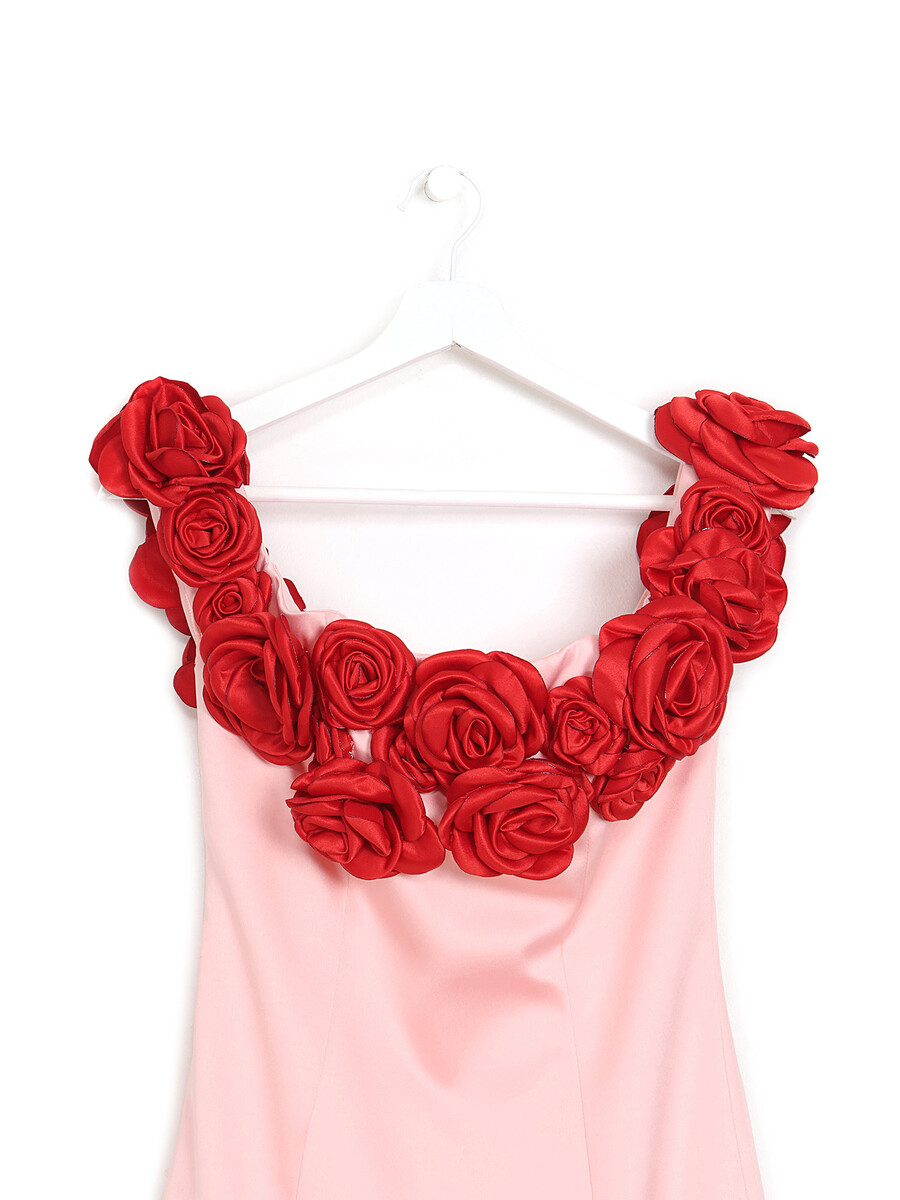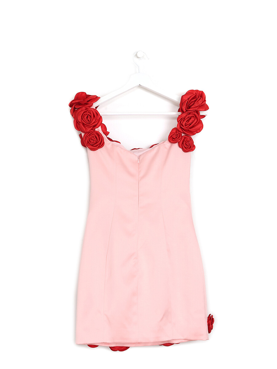 Sleeveless mini dress in pink with floral appliqué details. Round collar.