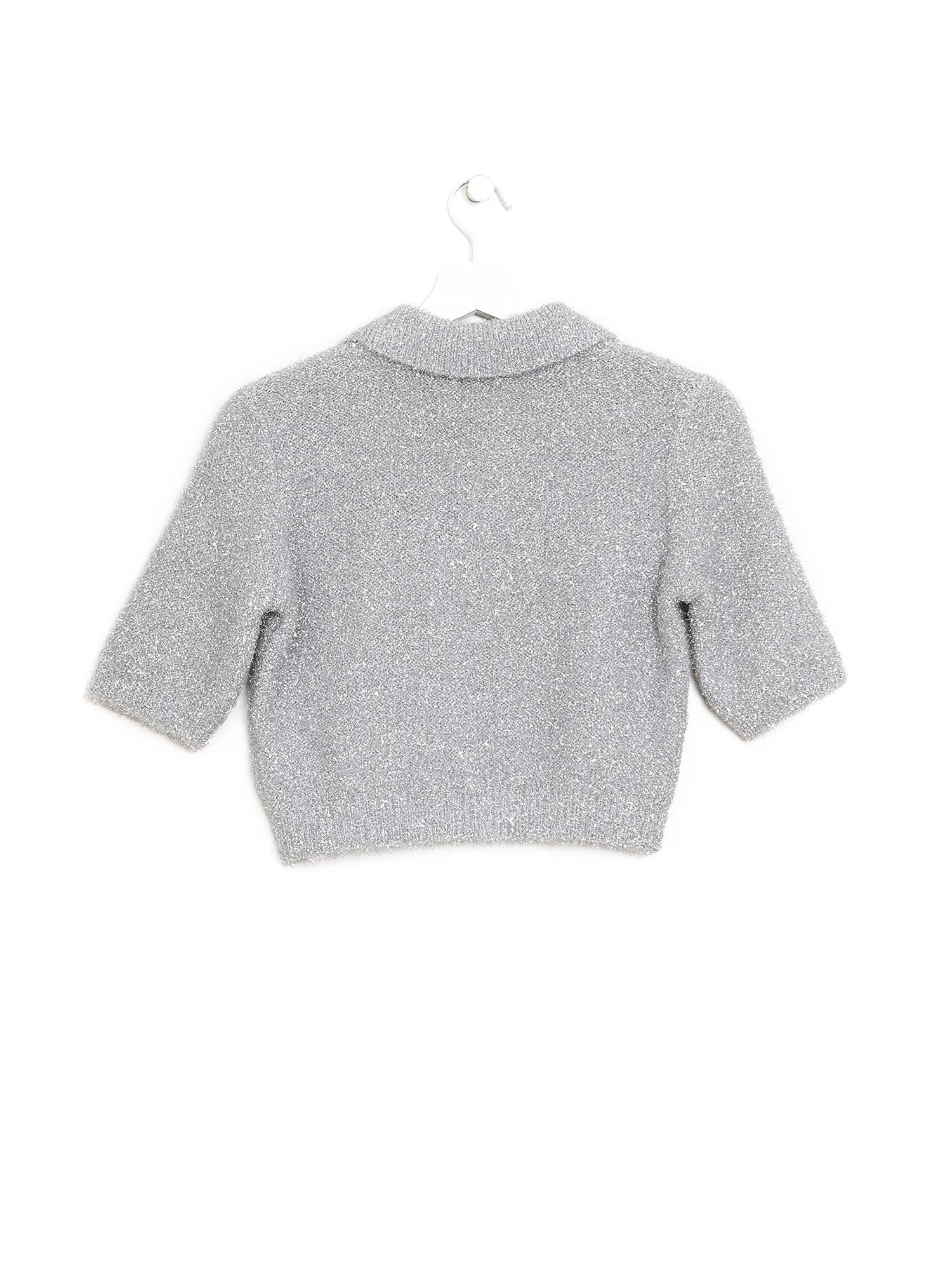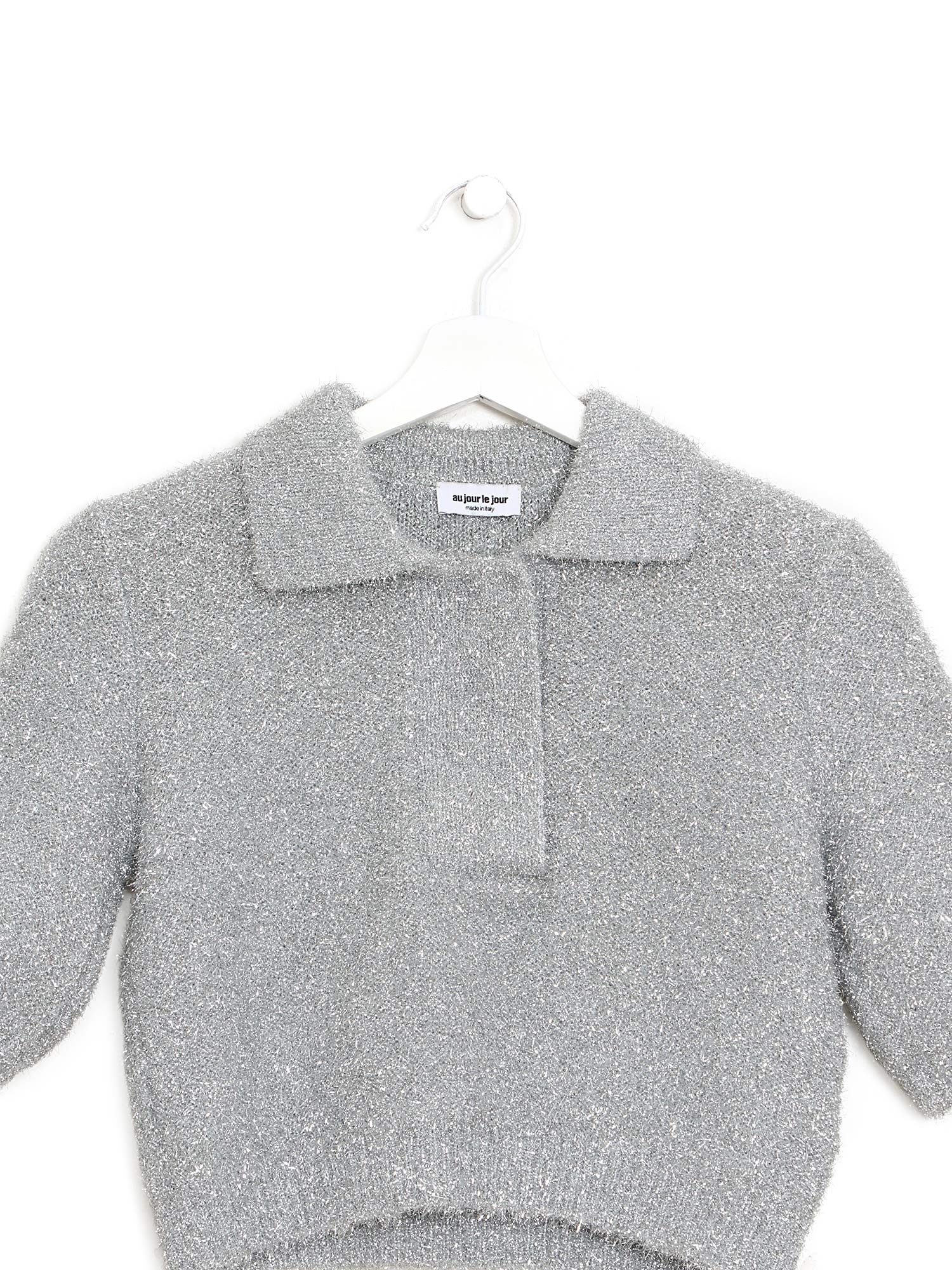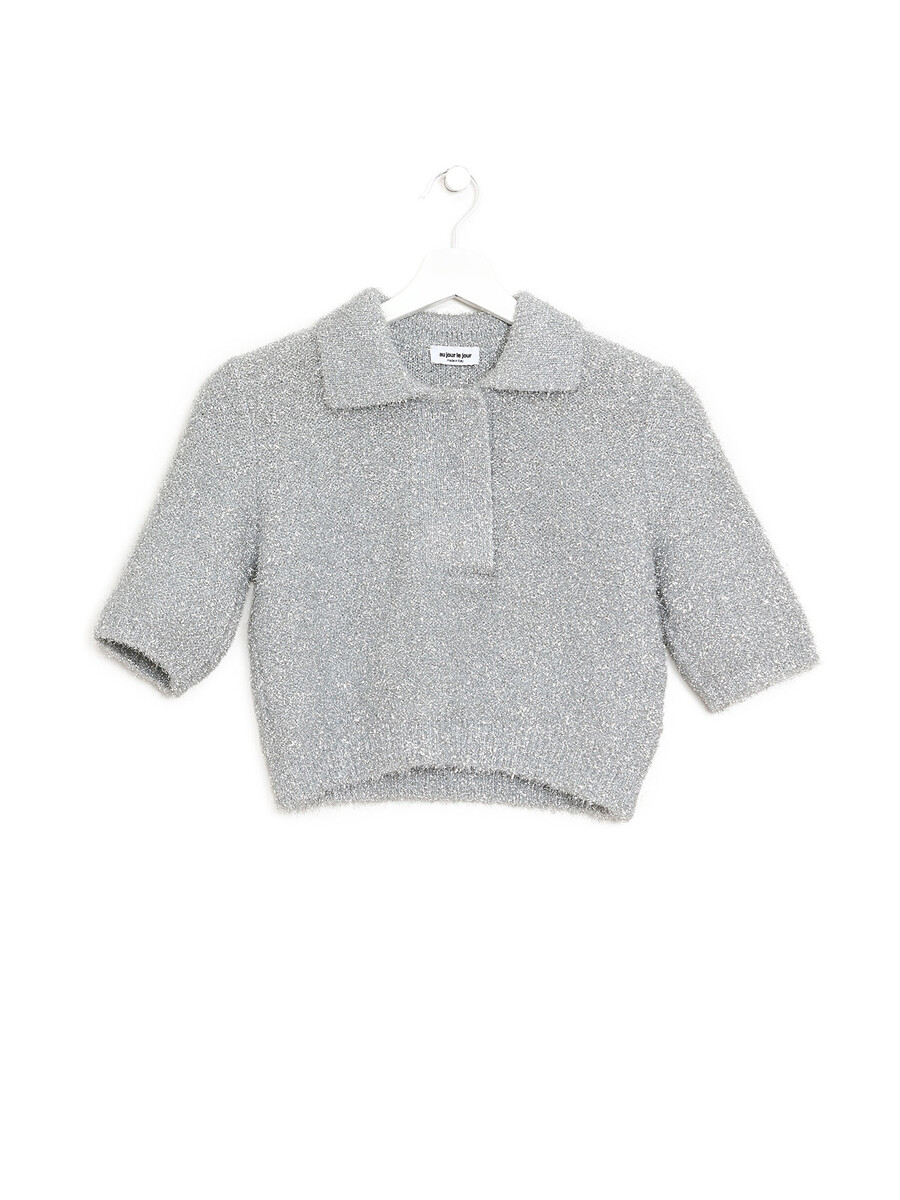 Shiny knit polo shirt in gray. Collared design with button placket. Lightweight and slightly sheer.