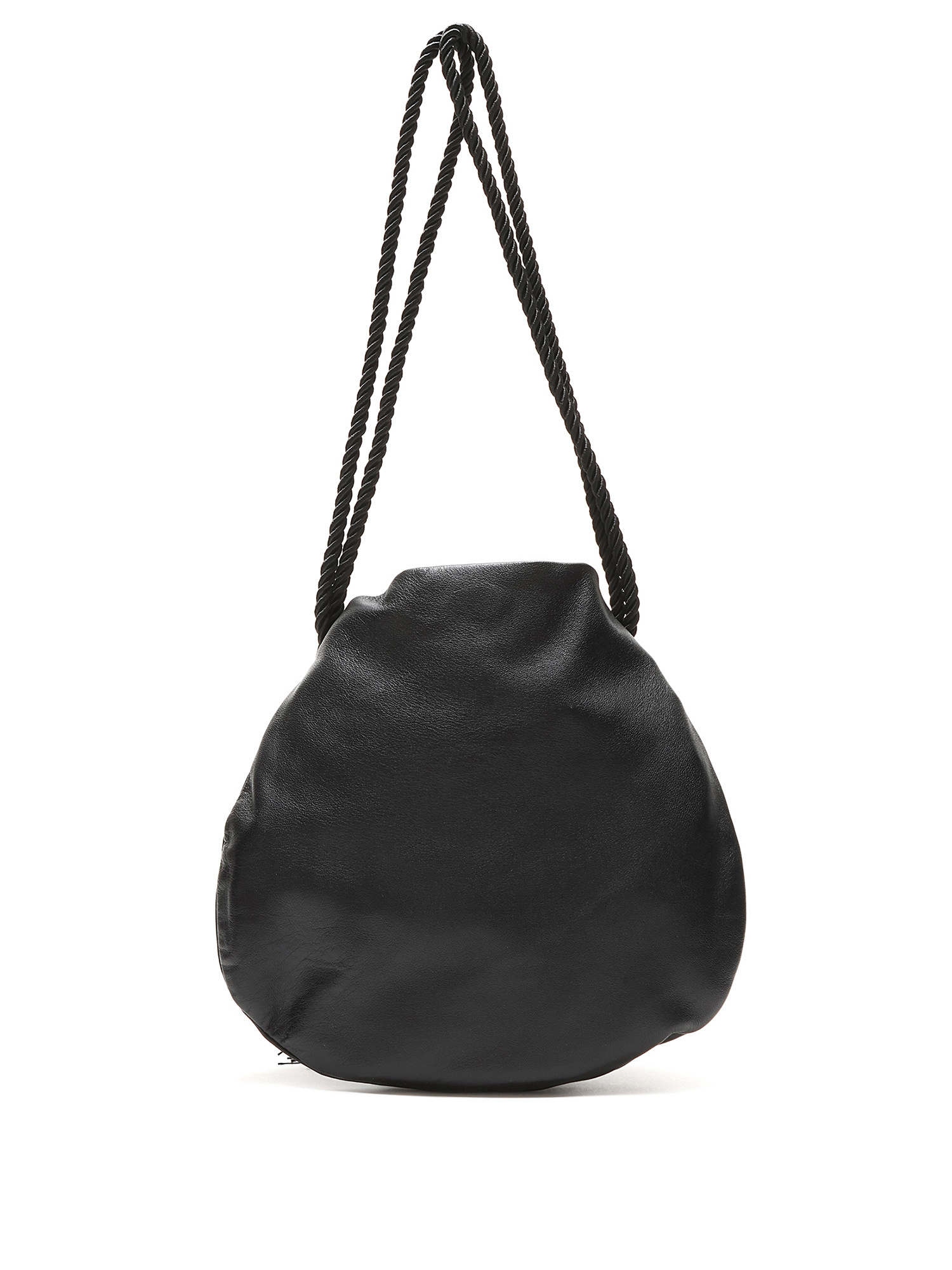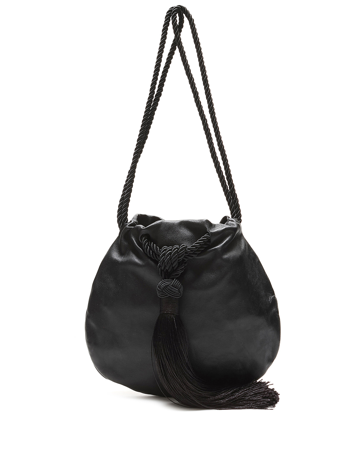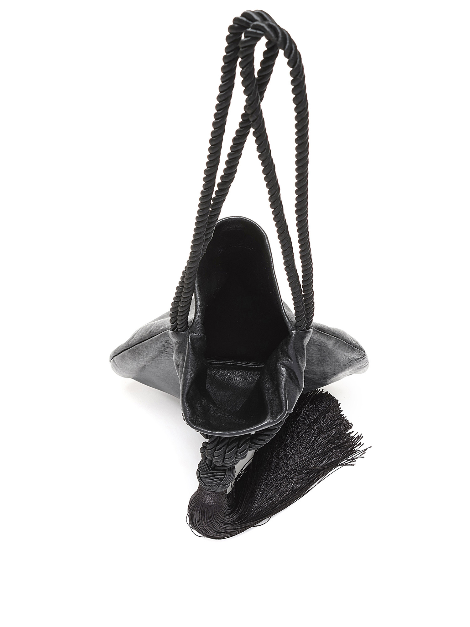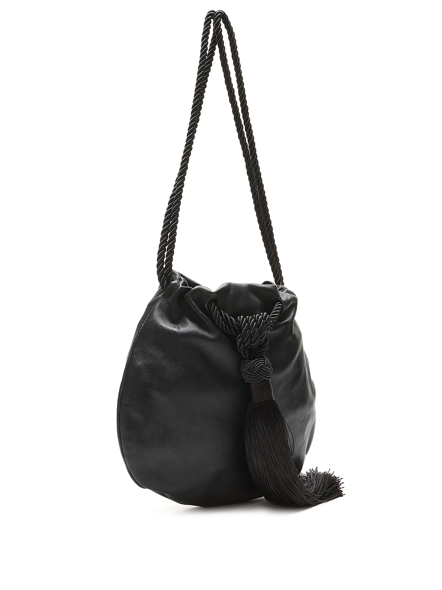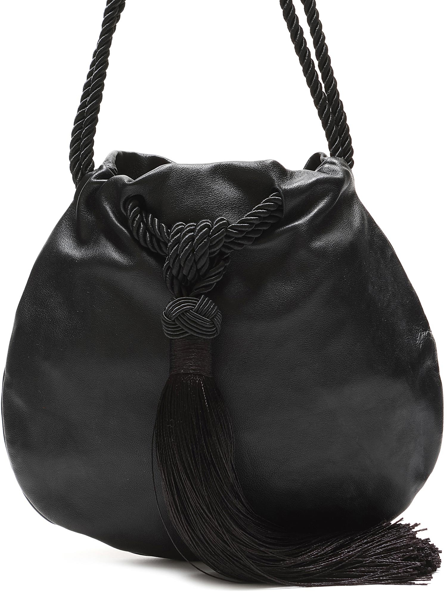 Minimalist black leather drawstring bag with braided shoulder straps and tassel detailing. Tonal stitching throughout.