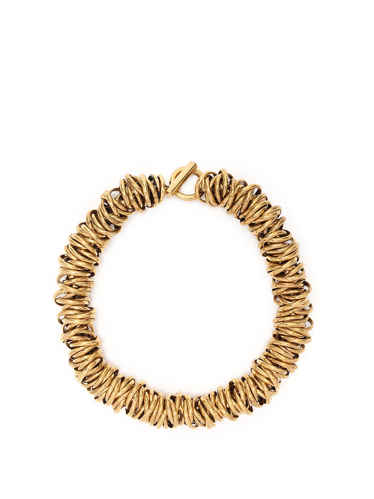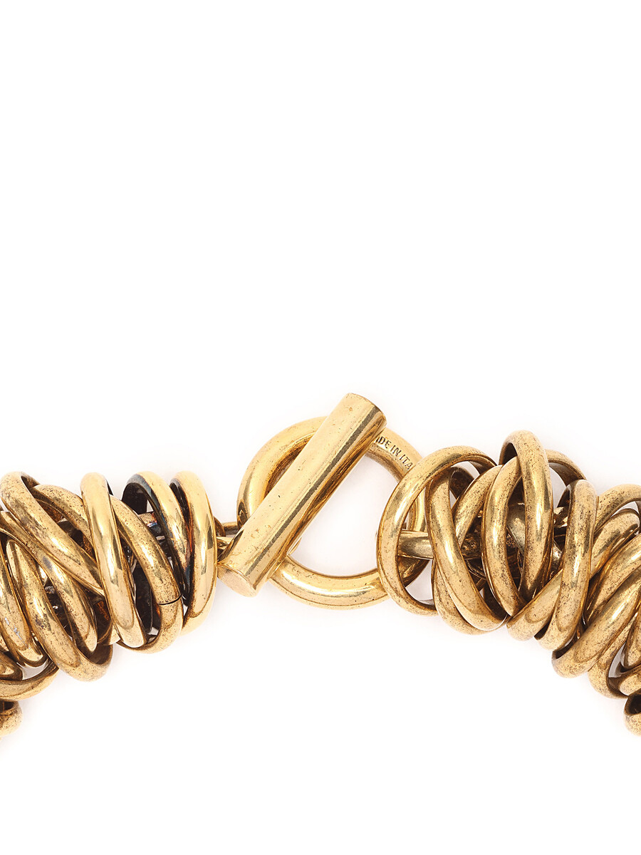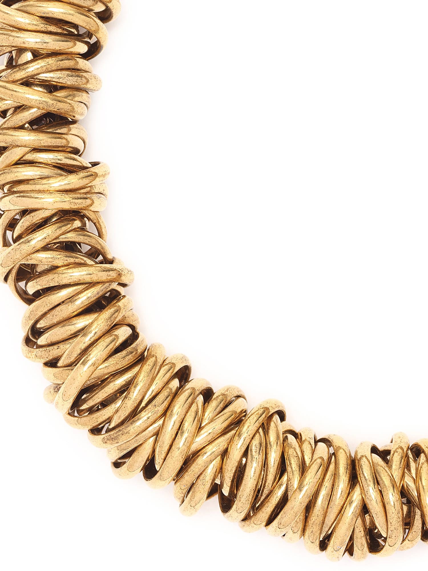Thick gold-tone necklace featuring spiral pattern and ring clasp closure. Comes with a box.
