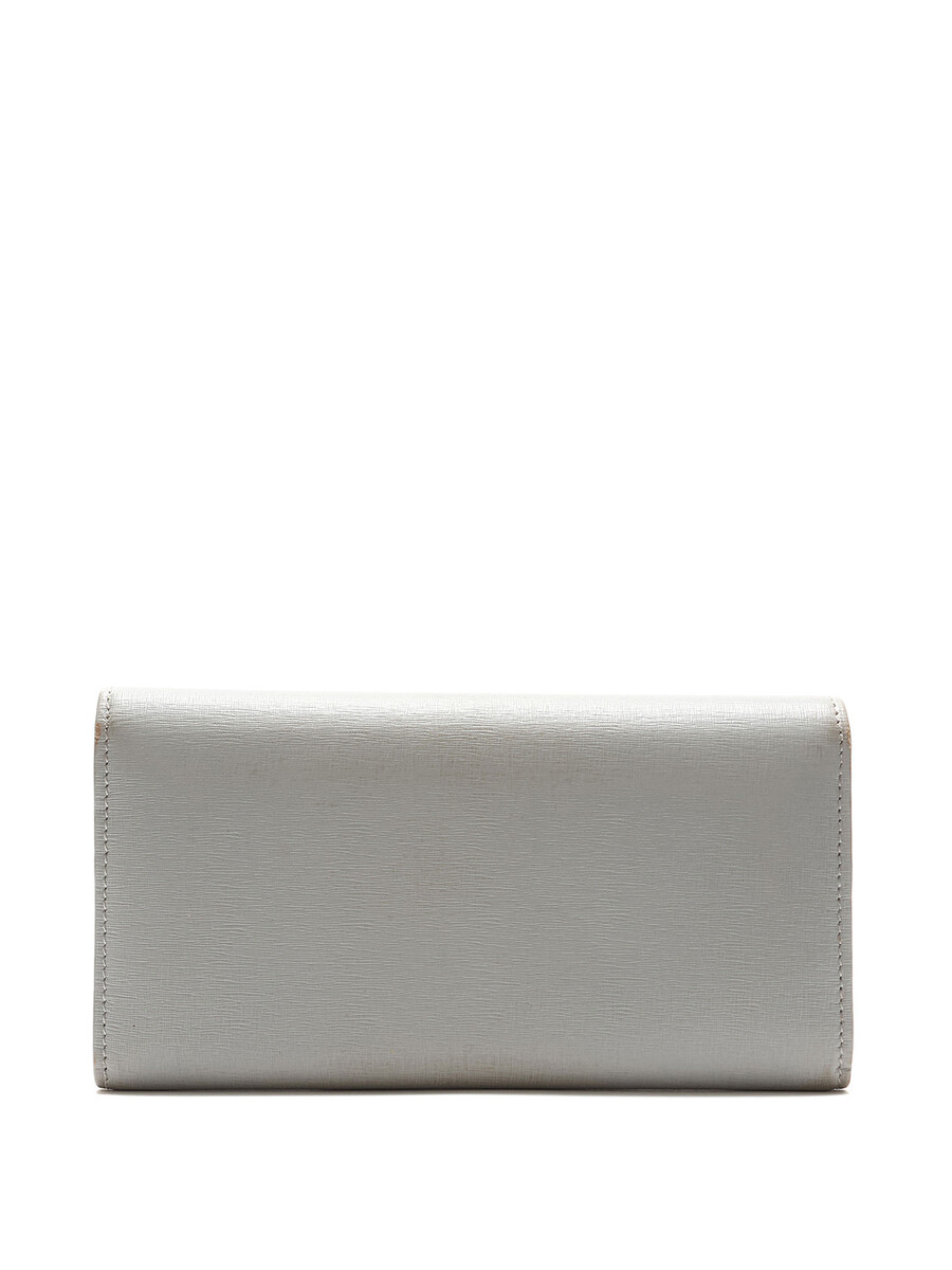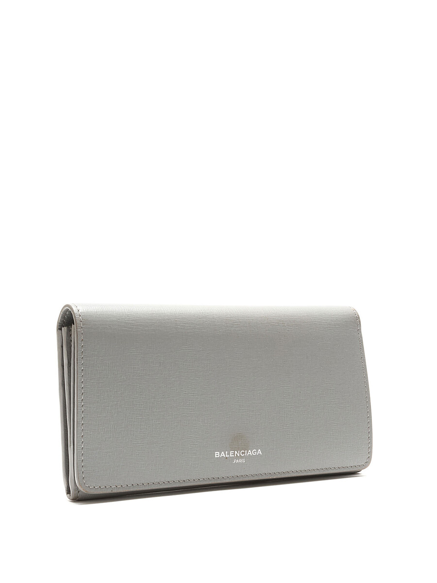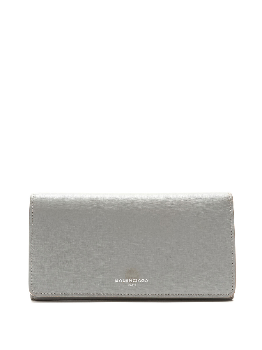 Grained leather wallet in grey featuring an embossed brand logo. Press-stud closure, zip pocket, and multiple card slots. Silver-tone hardware.