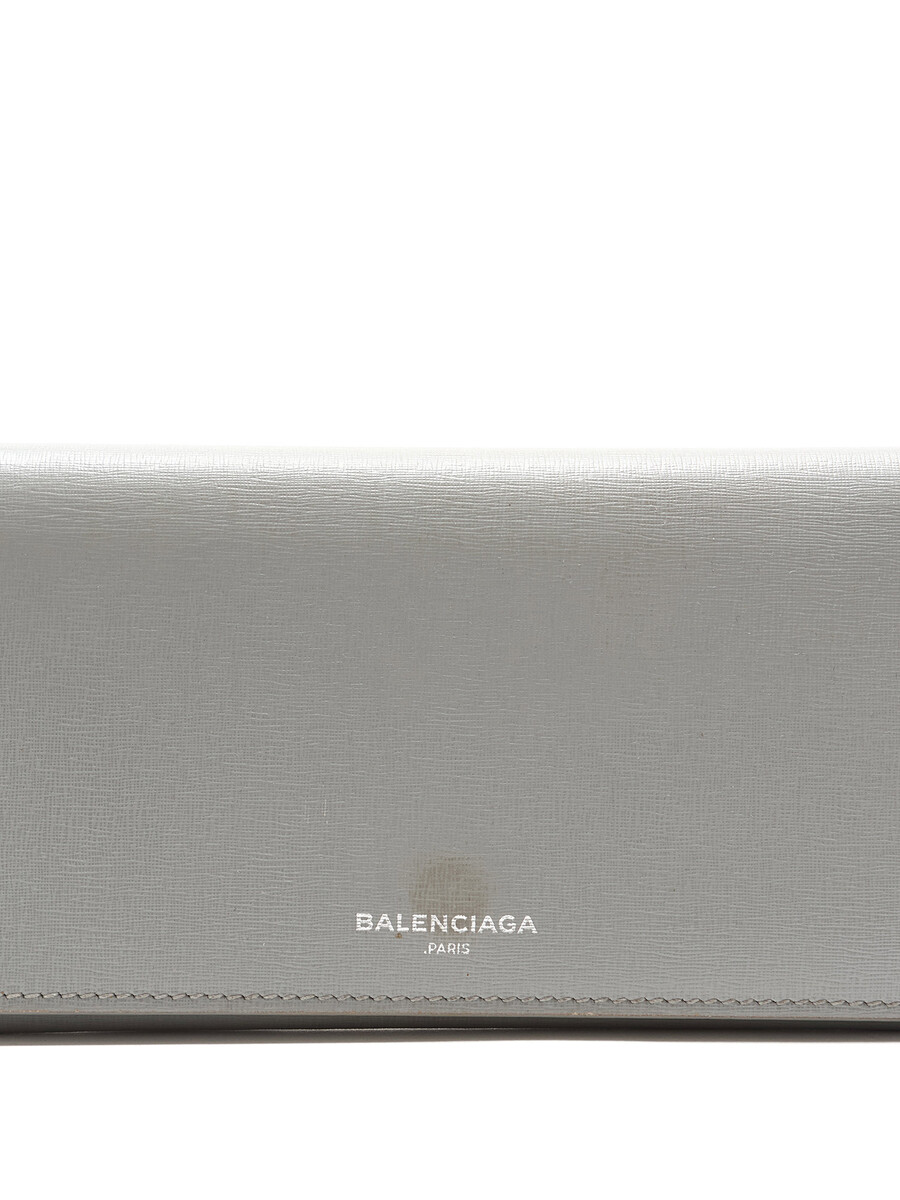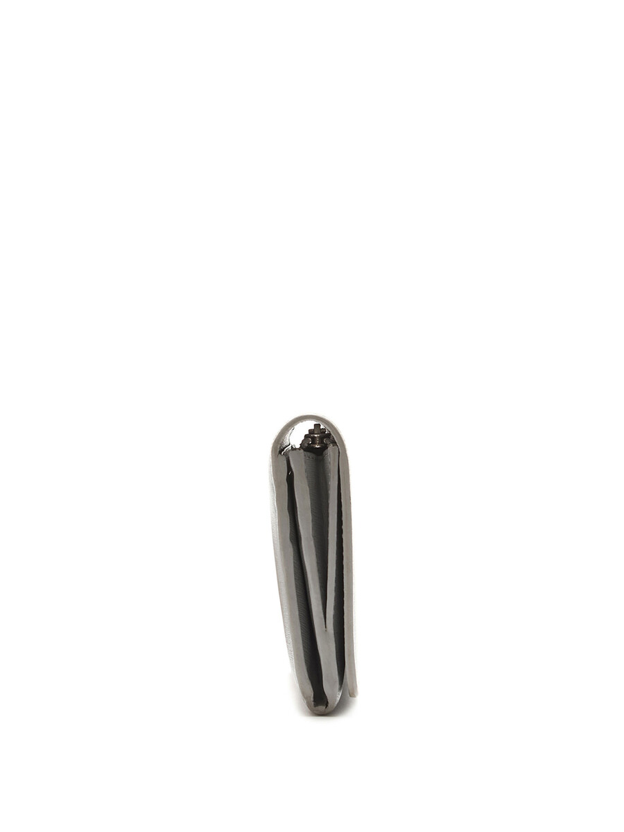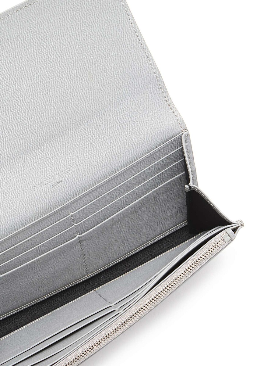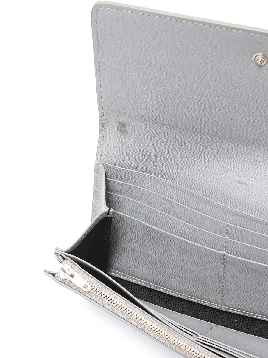 Grained leather wallet in grey featuring an embossed brand logo. Press-stud closure, zip pocket, and multiple card slots. Silver-tone hardware.