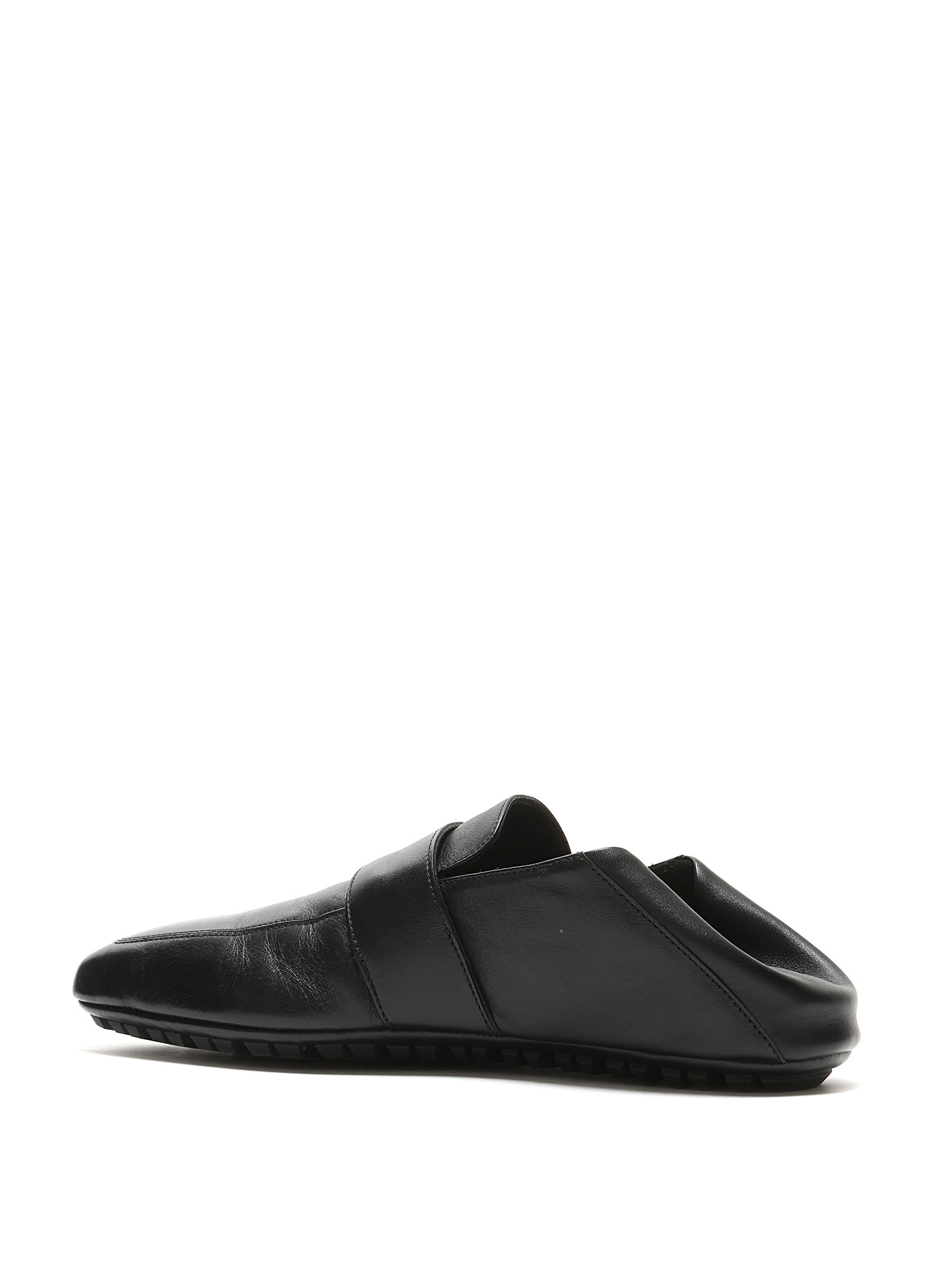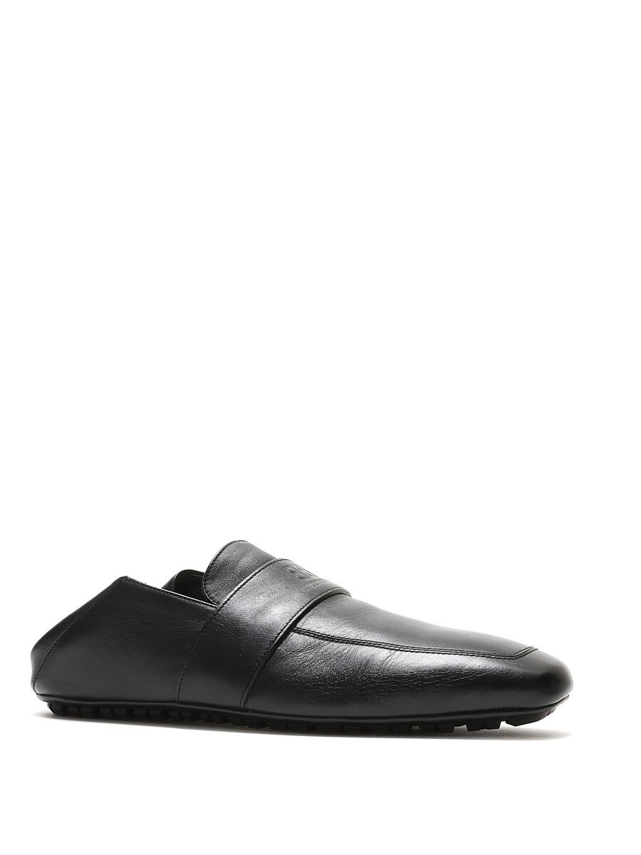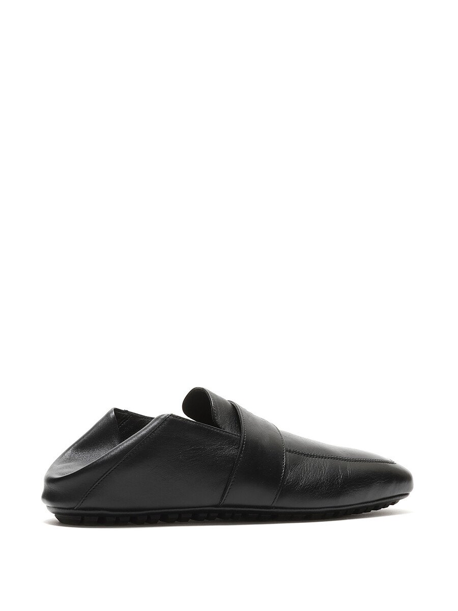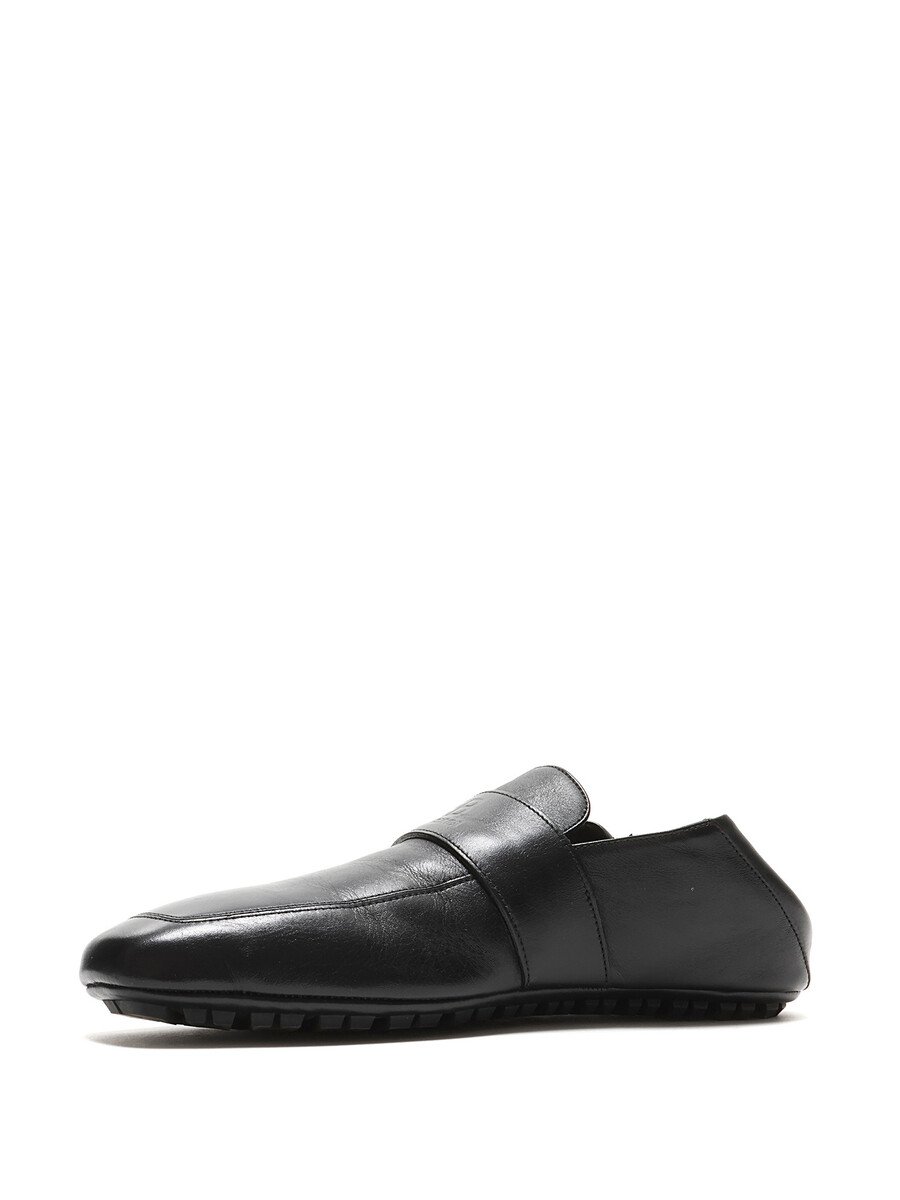 Grained leather slip-on loafers in black with a square toe design. Features a rubber lug sole for traction and durability.