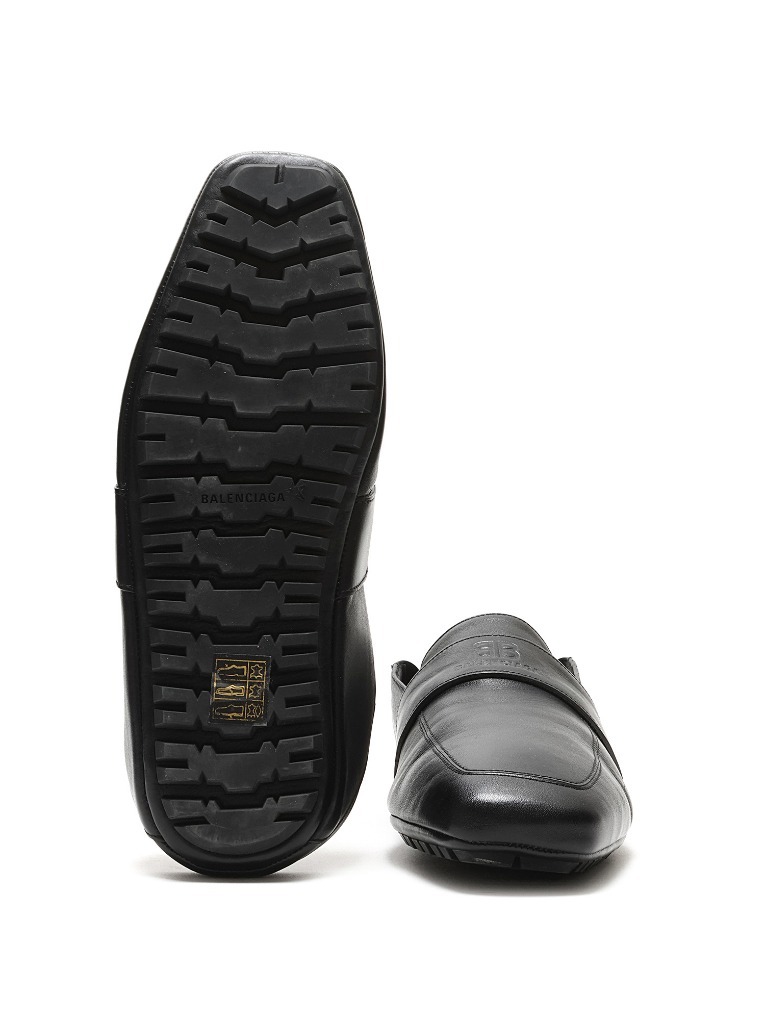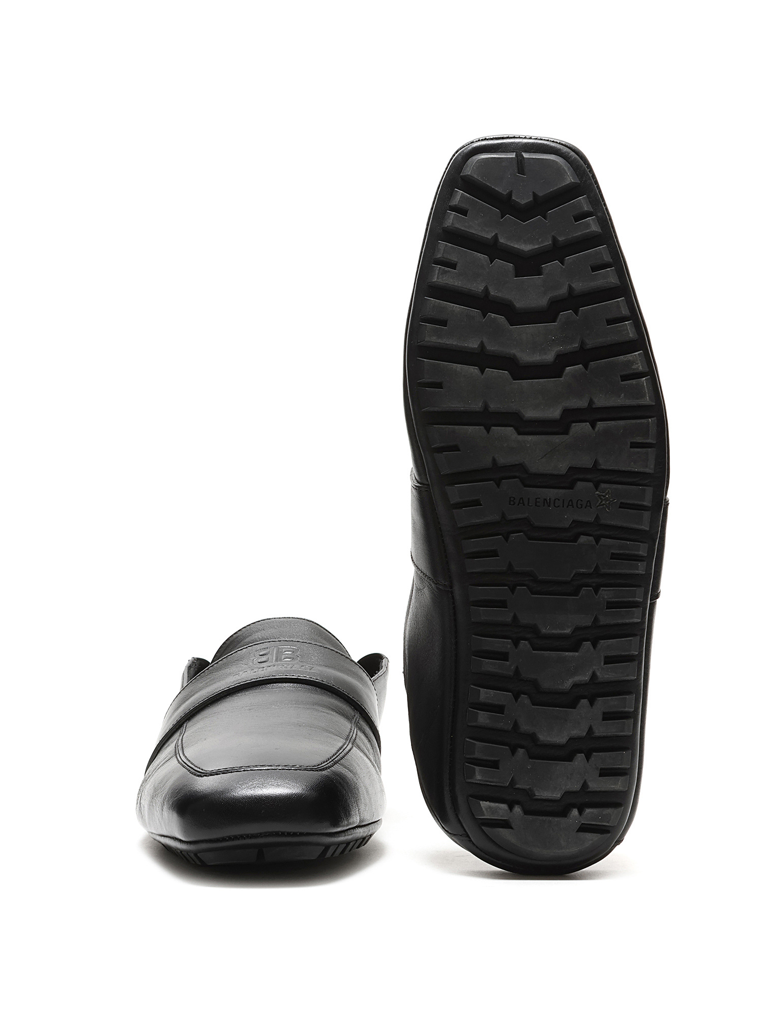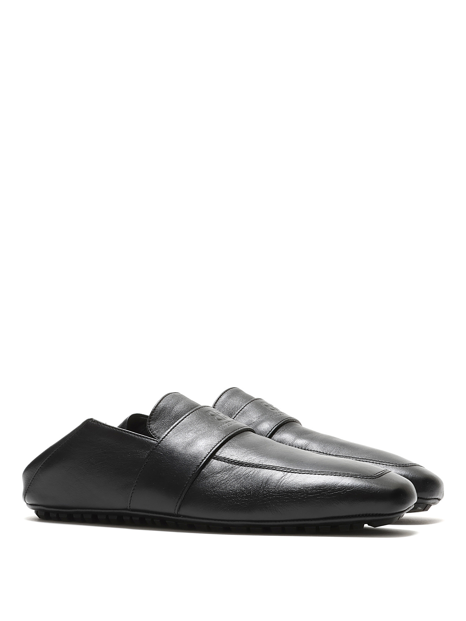 Grained leather slip-on loafers in black with a square toe design. Features a rubber lug sole for traction and durability.