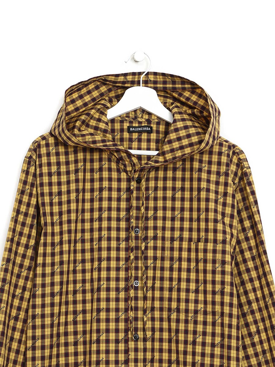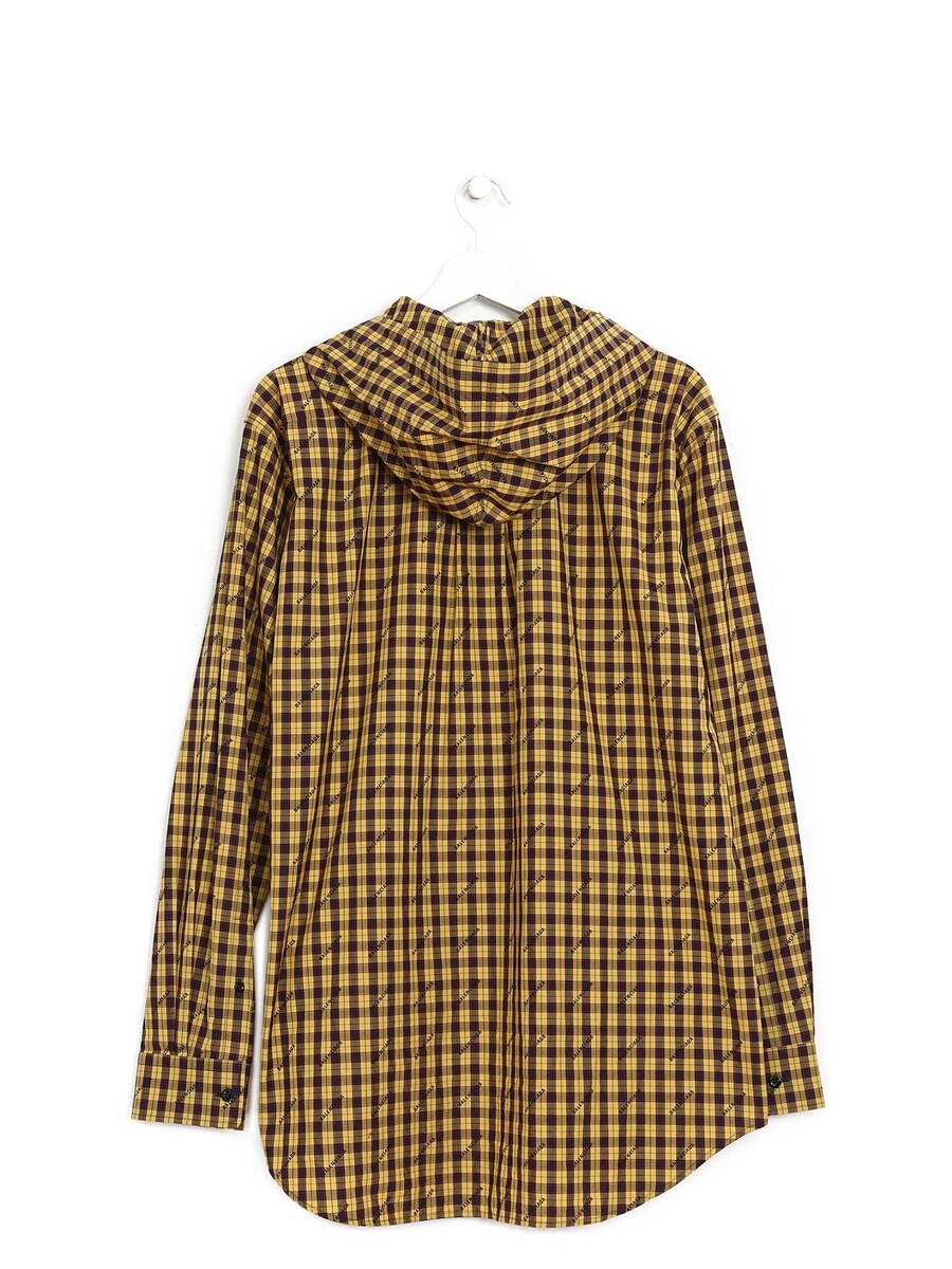 Plaid shirt with a hood in shades of yellow, red, and blue. Button closure. Shirt collar.