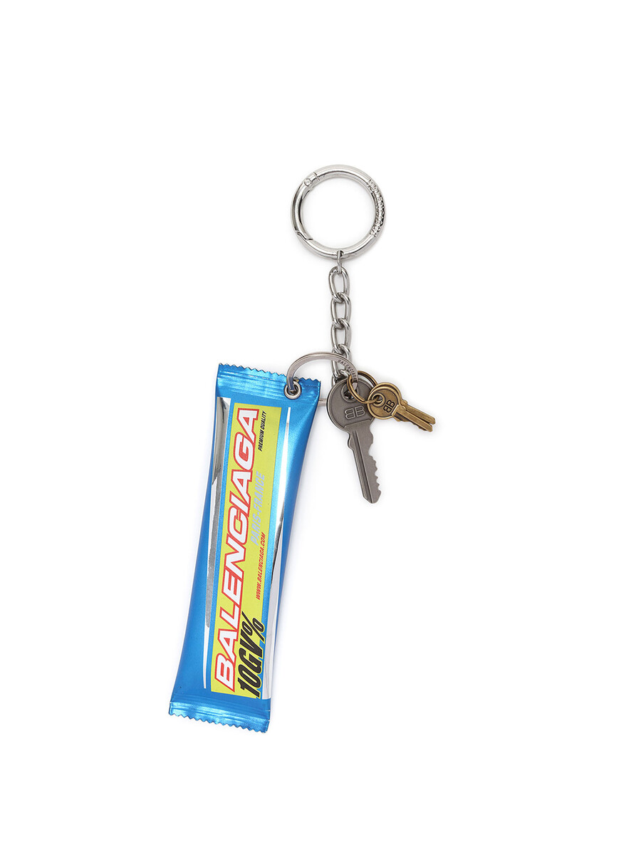 Keyring featuring a Balenciaga logo in a playful candy wrapper design in blue with yellow and red accents. Silver-tone metal keyring.