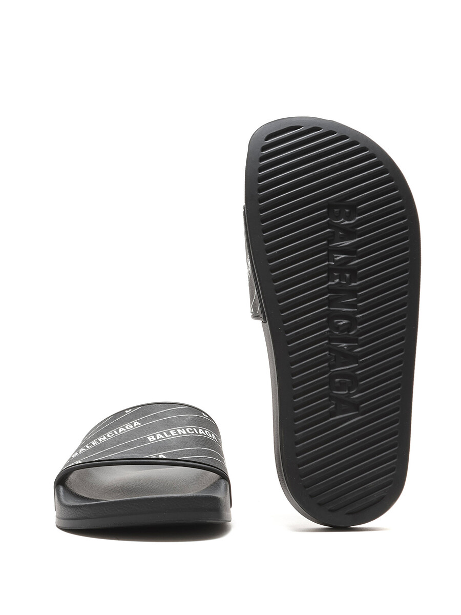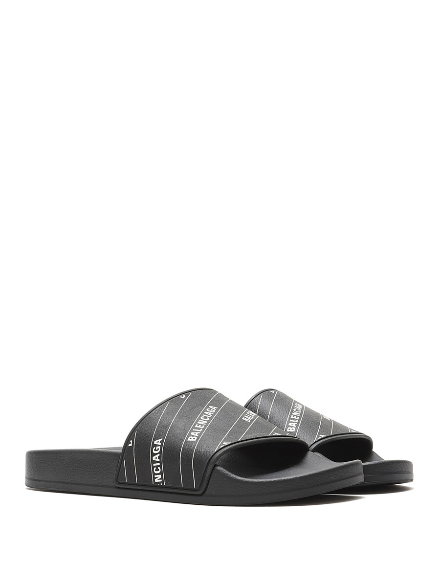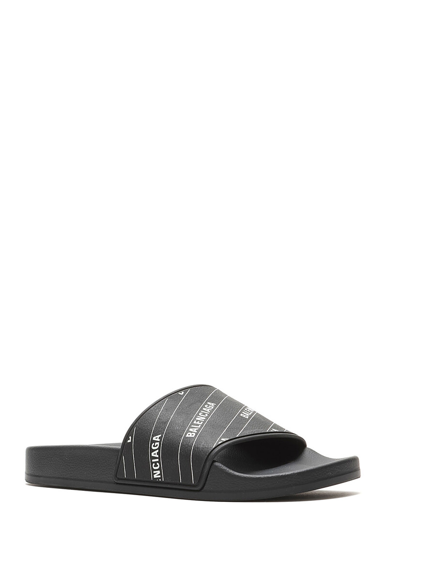Rubber slip-on sandals in black and white featuring logo motif. Open-toe style. Rubber sole. With box.
