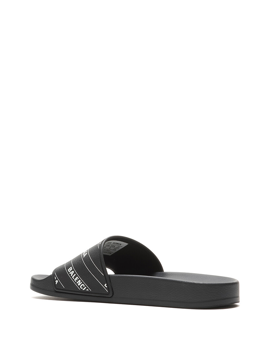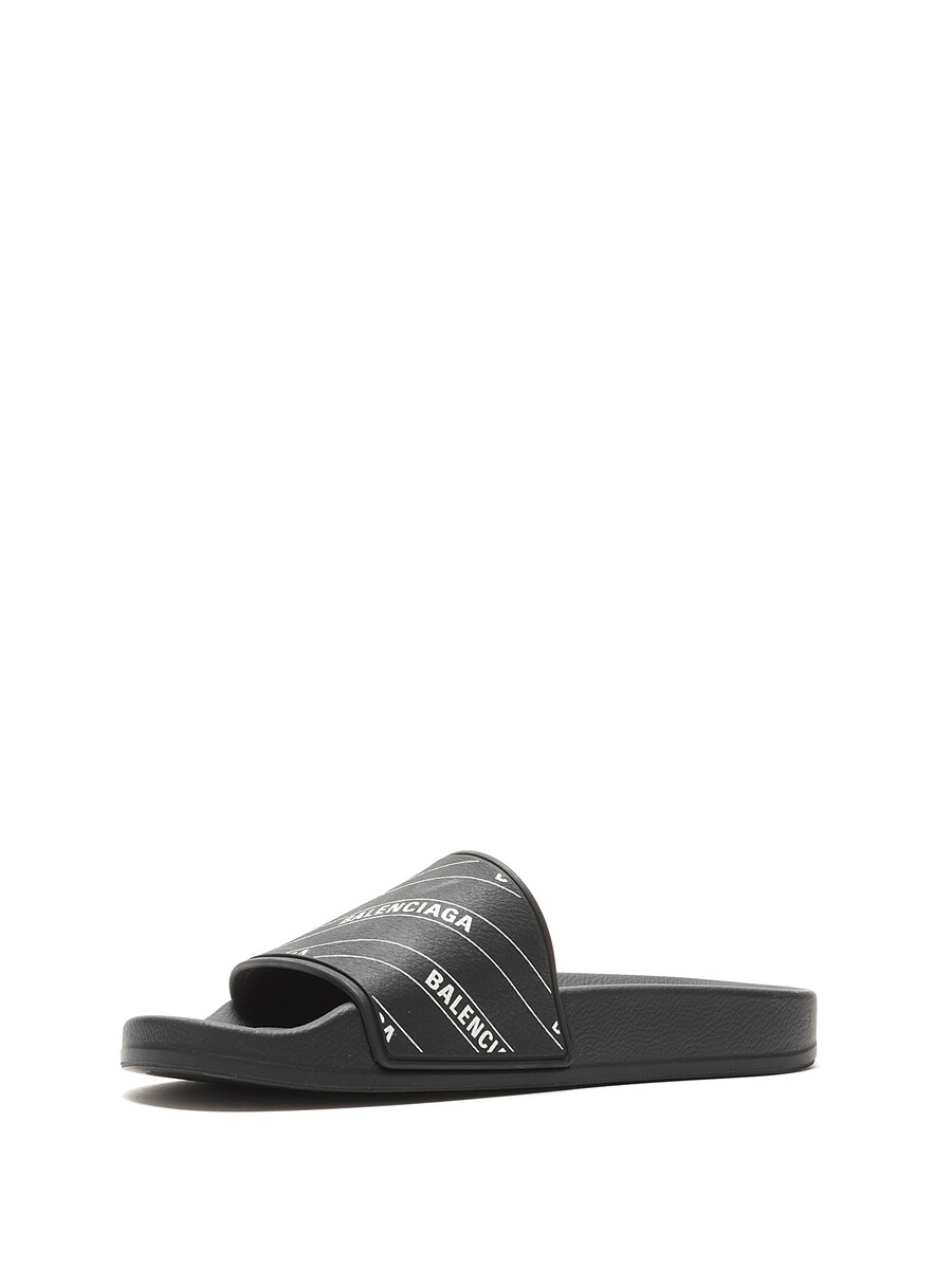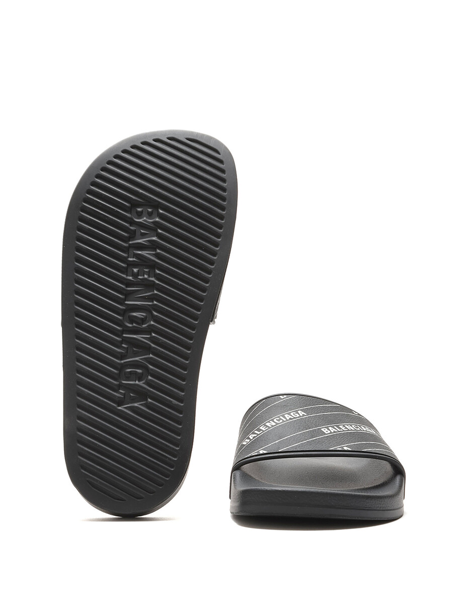 Rubber slip-on sandals in black and white featuring logo motif. Open-toe style. Rubber sole. With box.