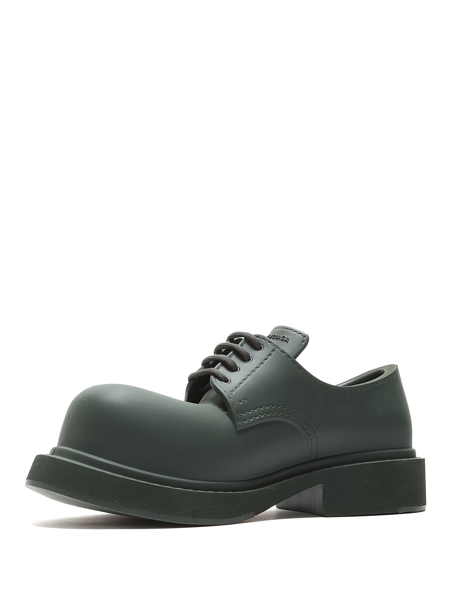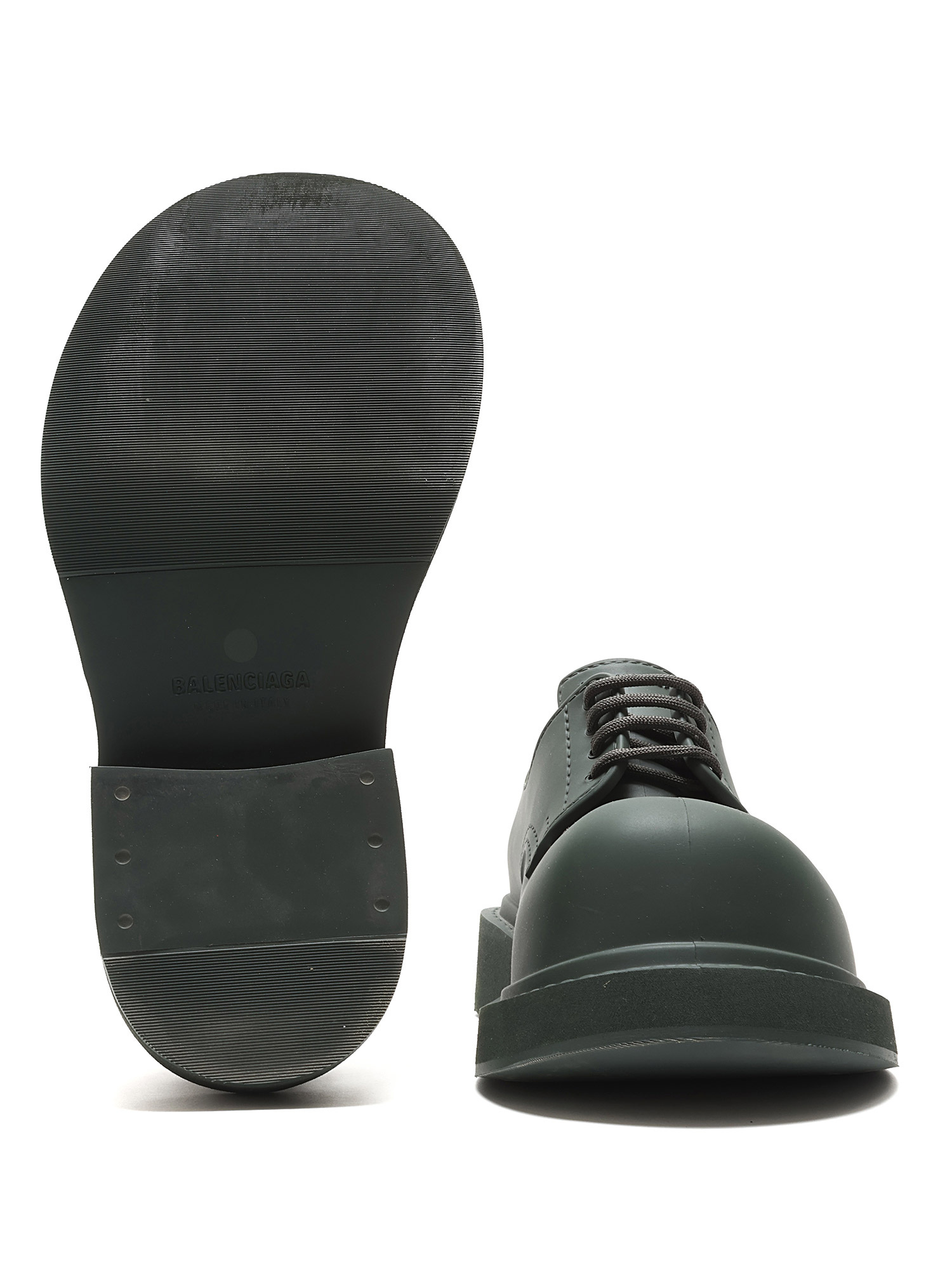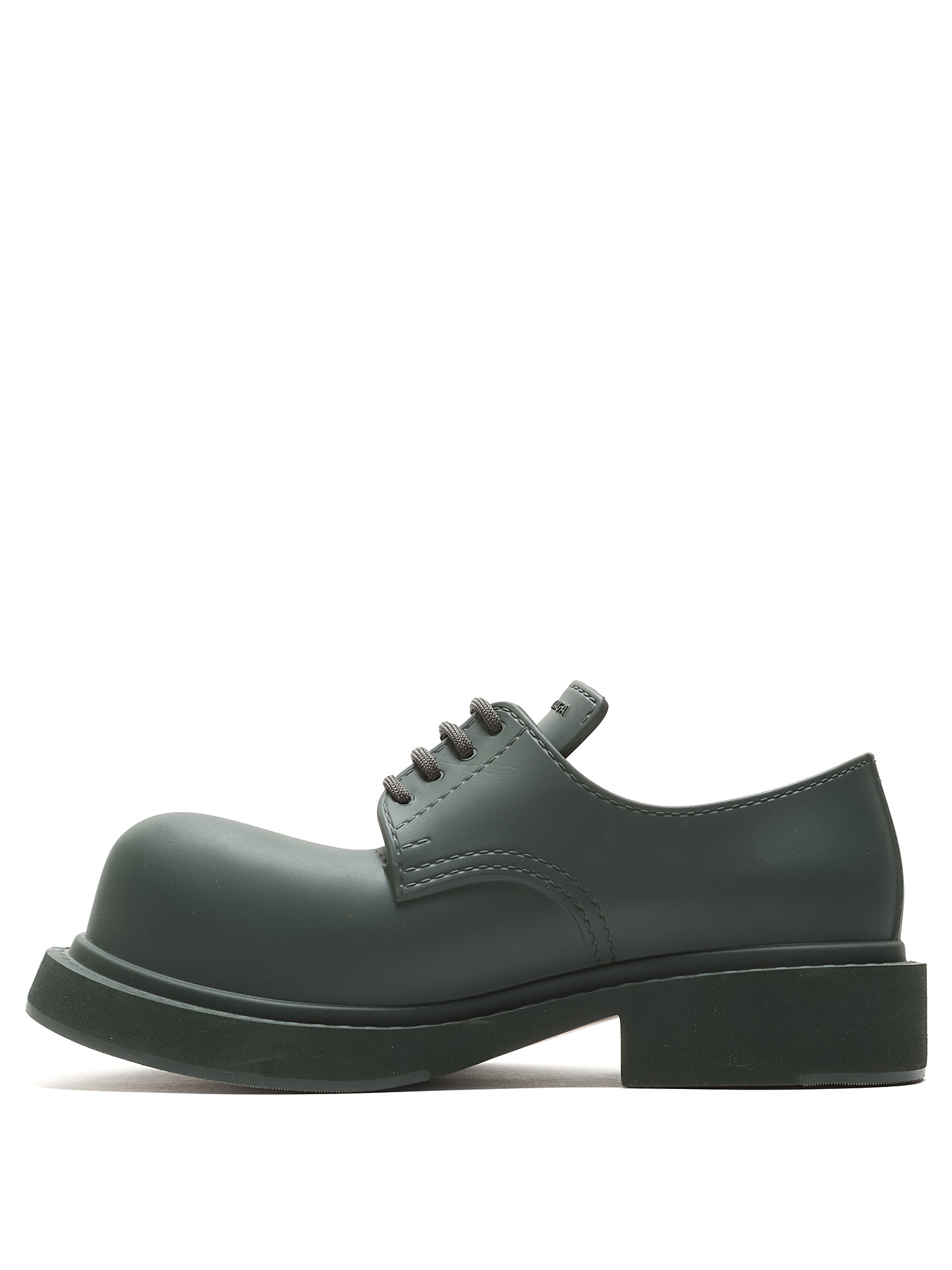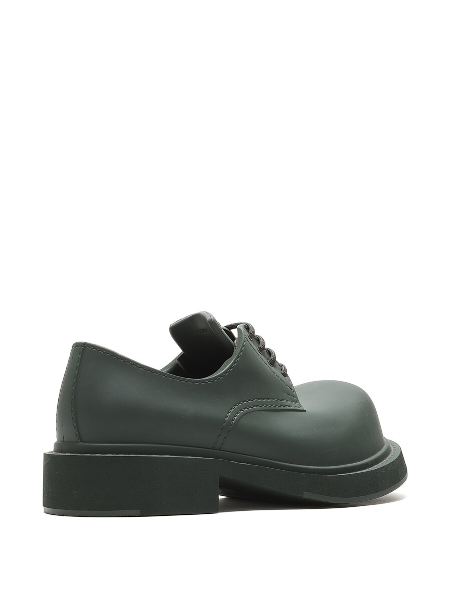 Oversized rubber derby shoes in deep green. Lace-up closure. Round toe. Rubber sole.