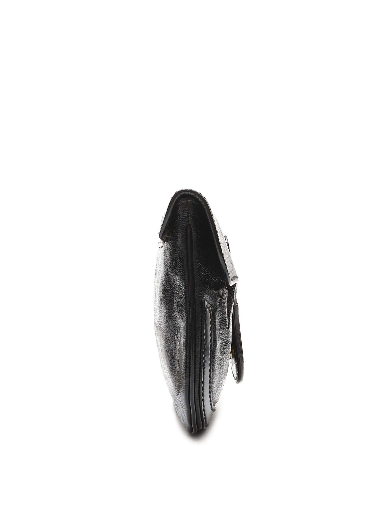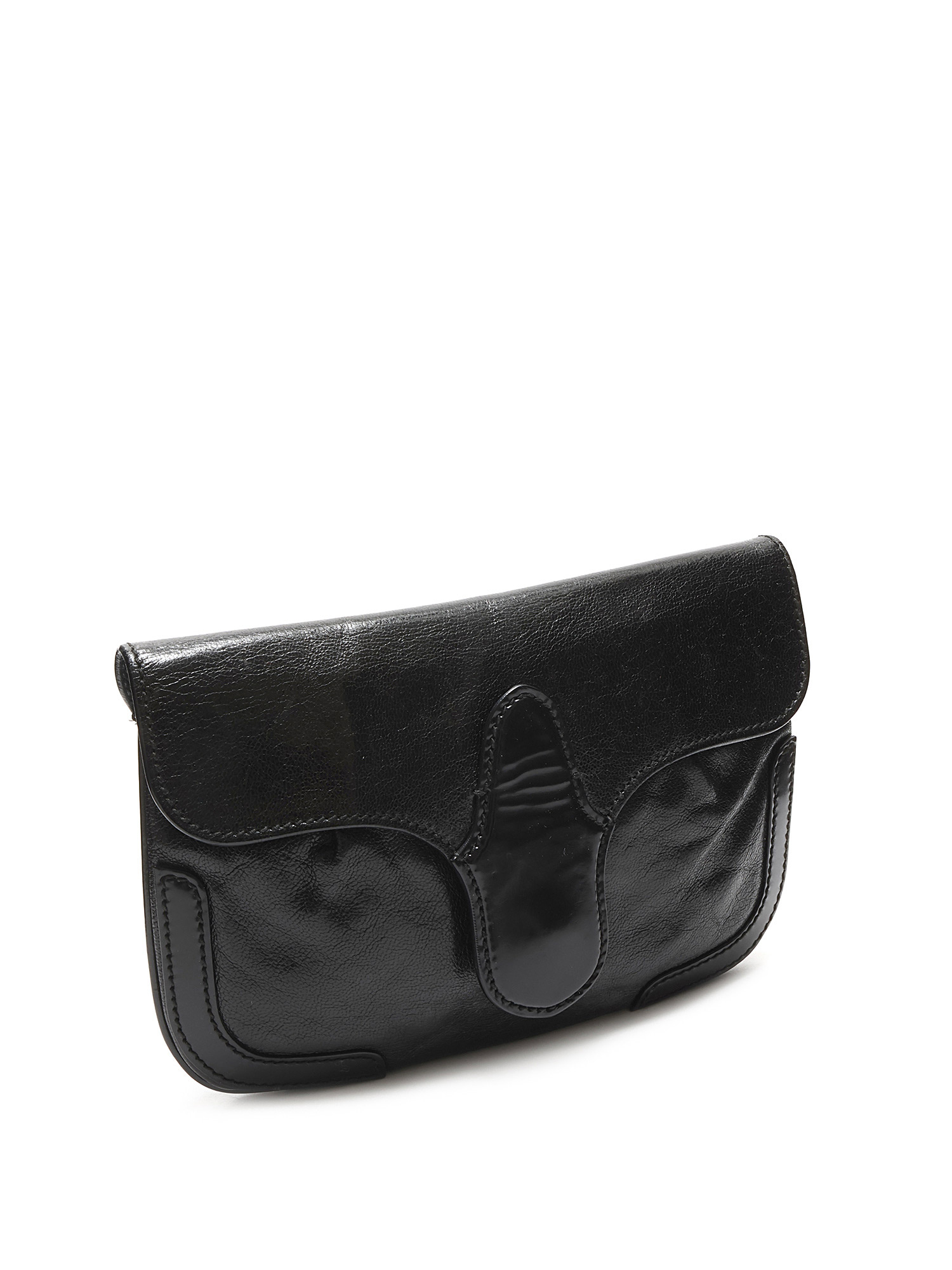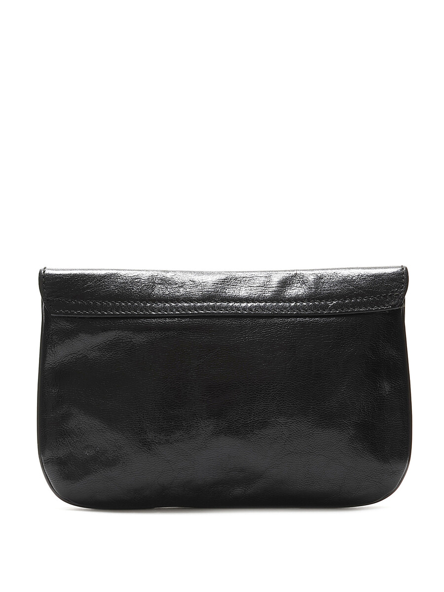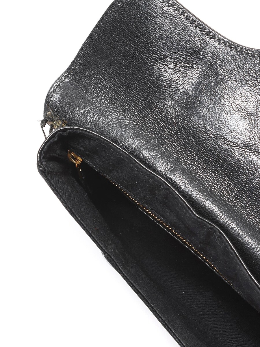 Black leather clutch with a single flap and snap closure. Features gold-tone hardware and includes a mirror.