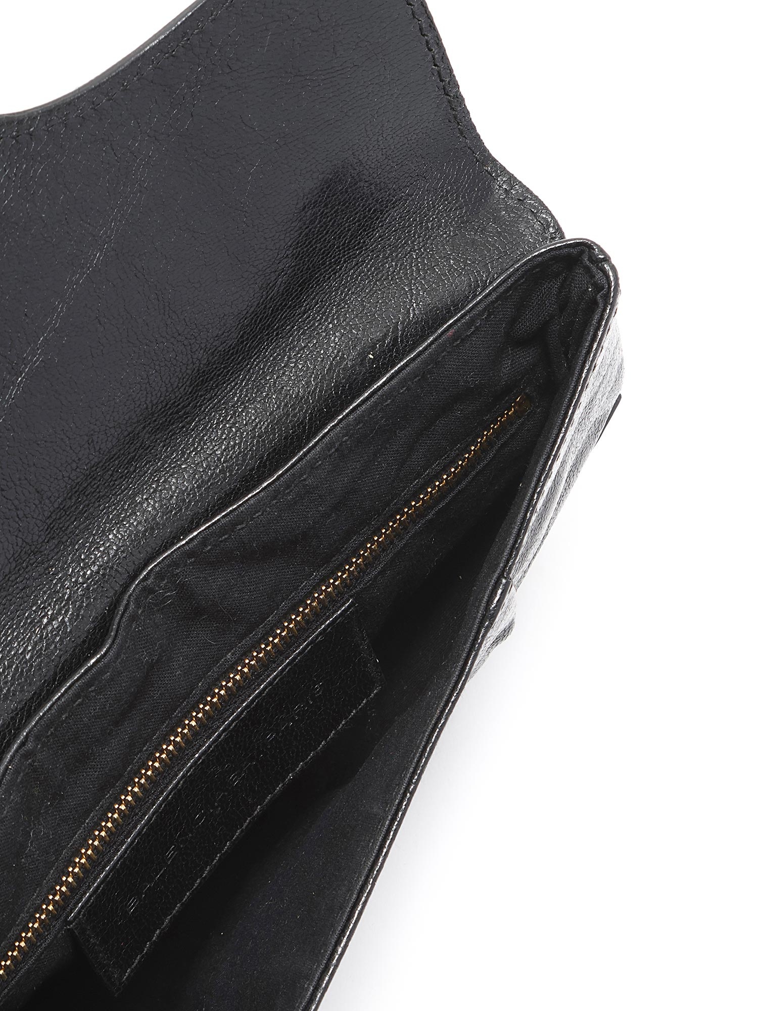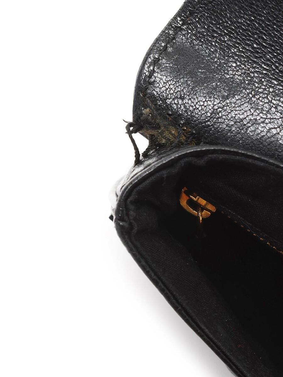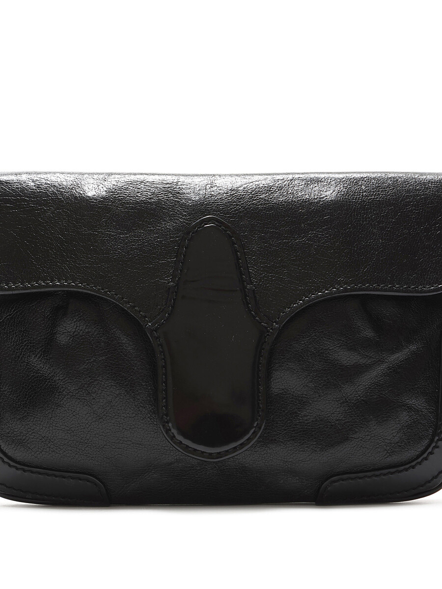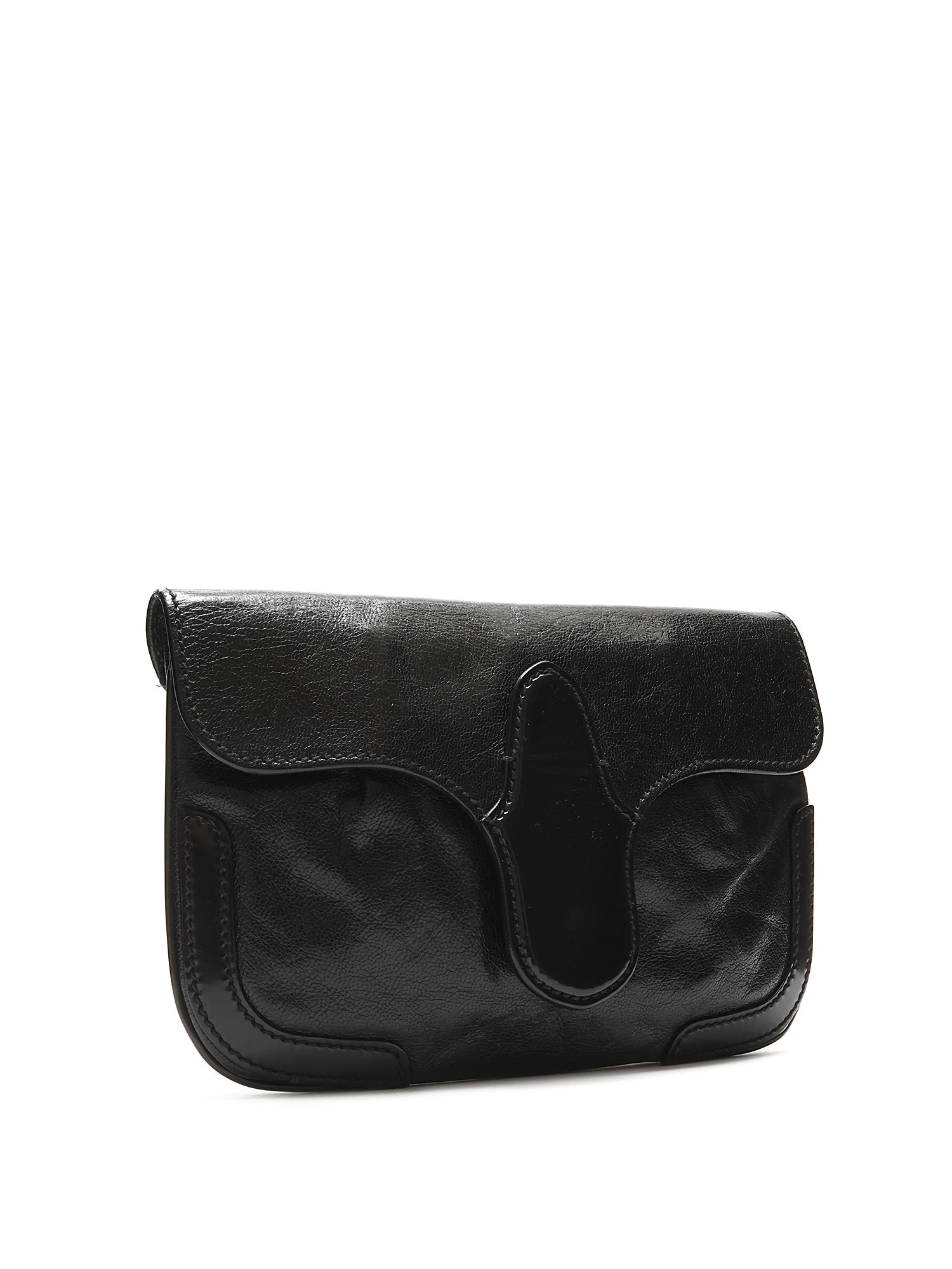 Black leather clutch with a single flap and snap closure. Features gold-tone hardware and includes a mirror.