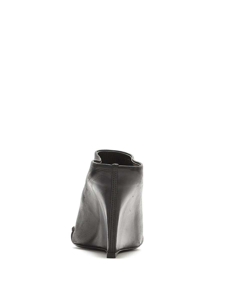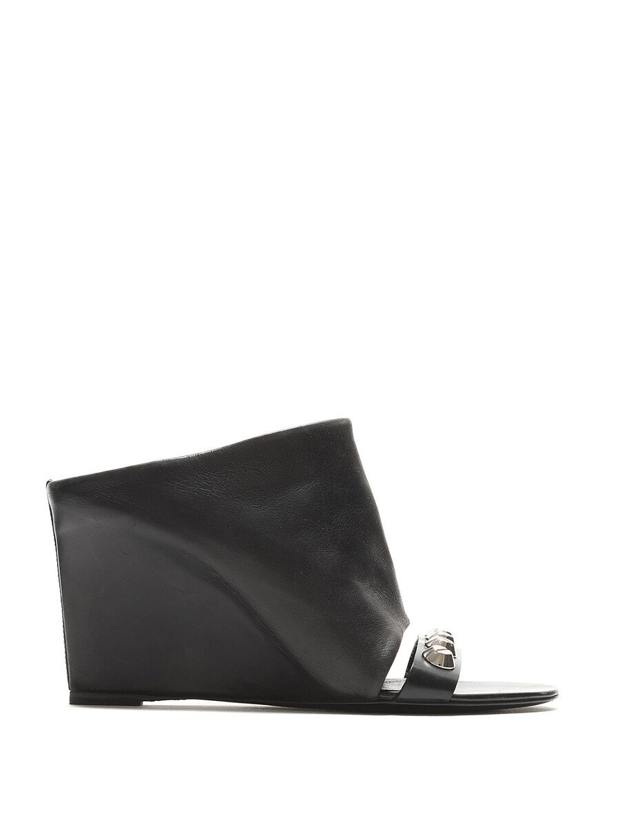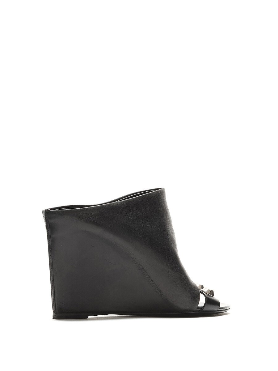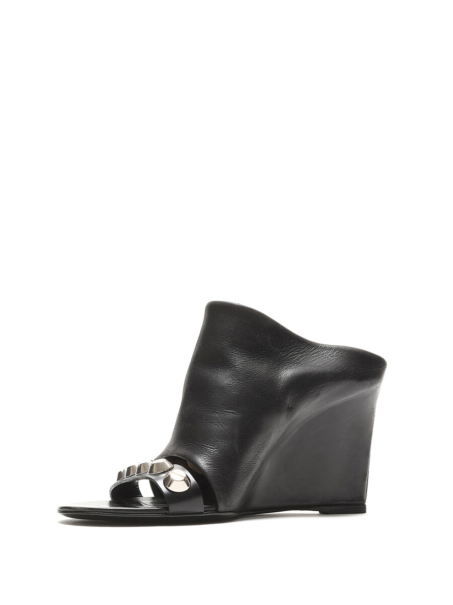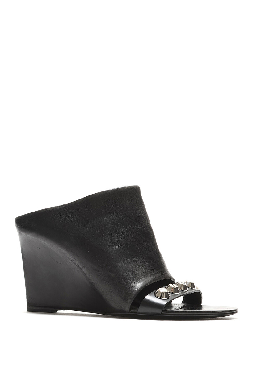 Leather wedge mules featuring a studded strap design in black. Open toe style with a sleek finish. Leather sole.
