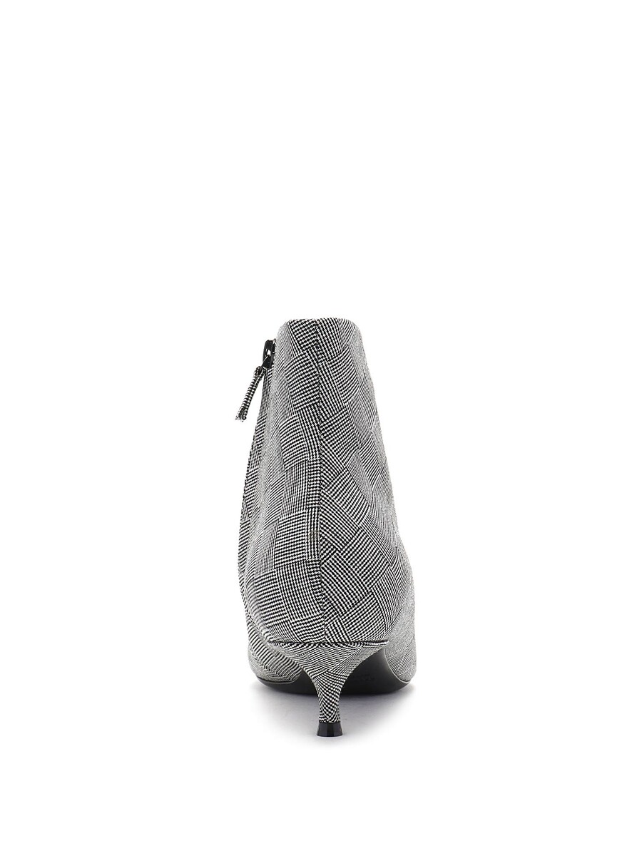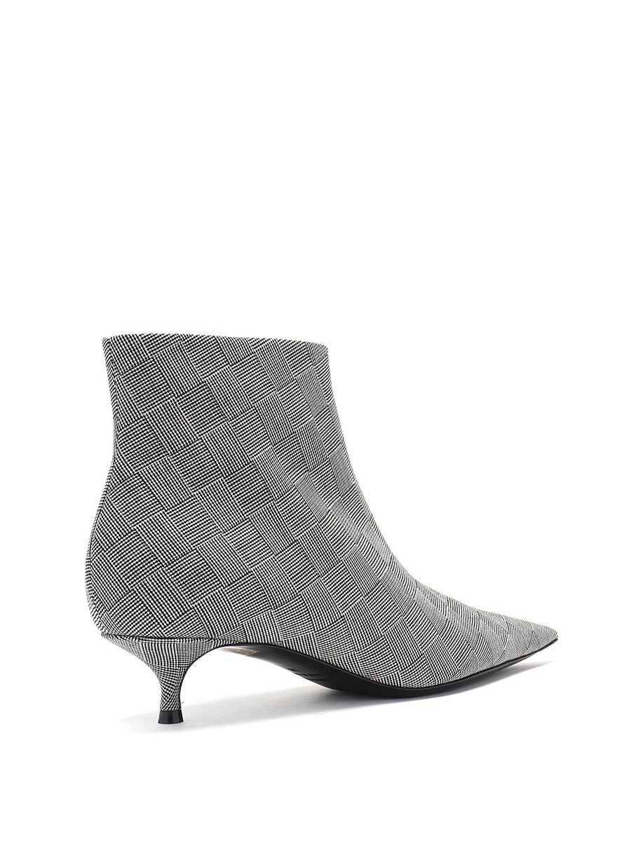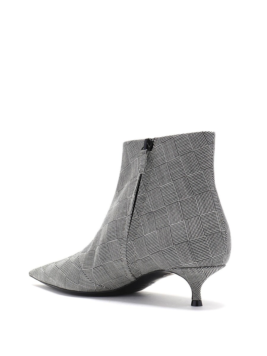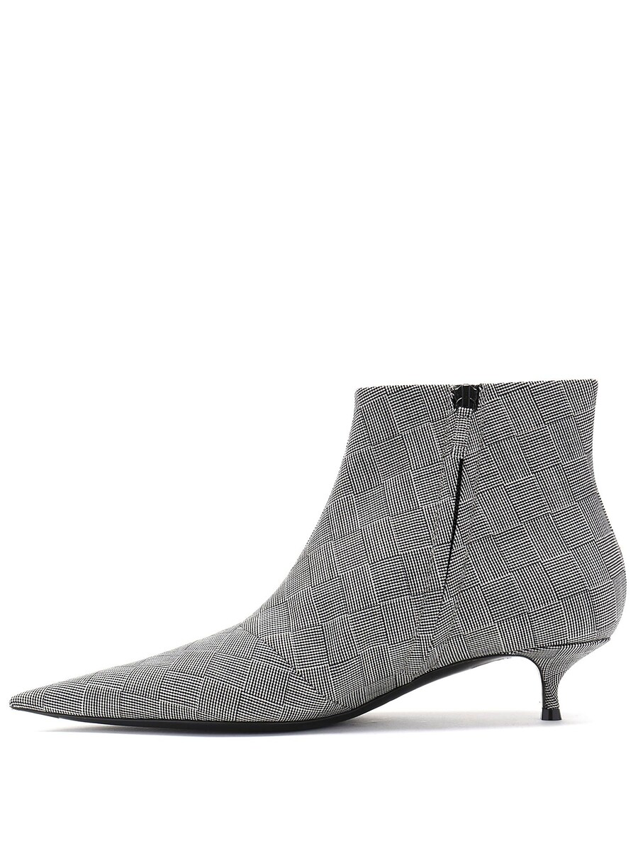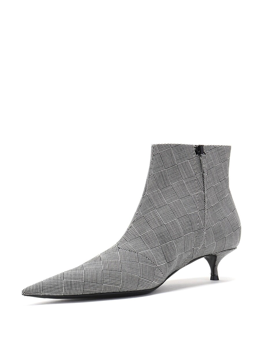 Checkered houndstooth twill kitten heel ankle boots in black and white. Signature pointy ‘Knife’ toe. Zip closure at inner side. With box.