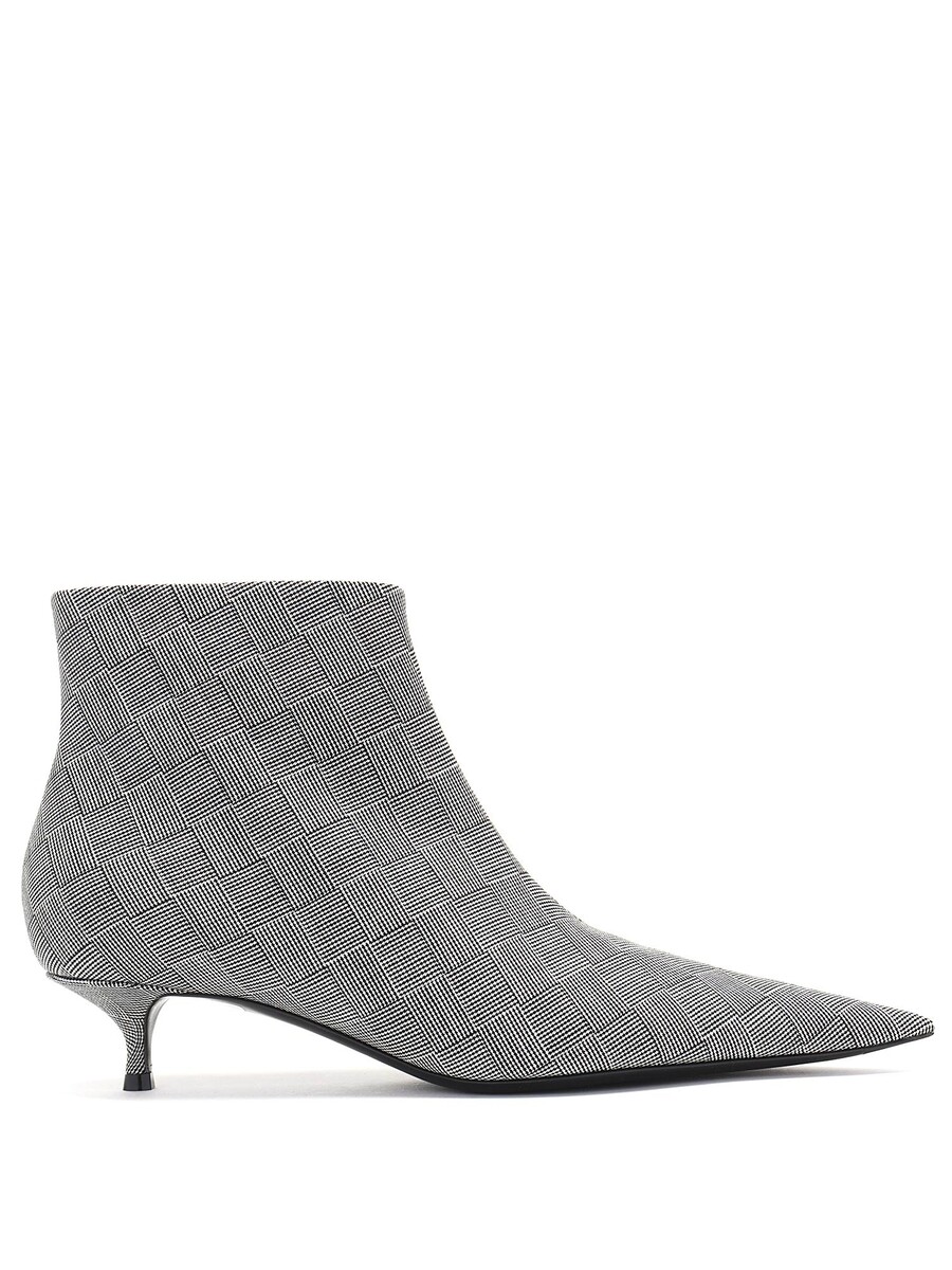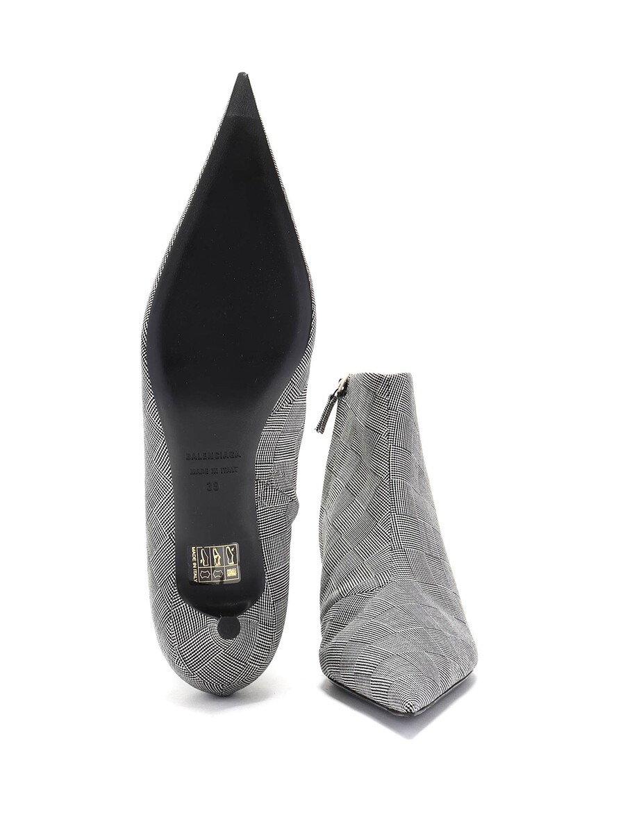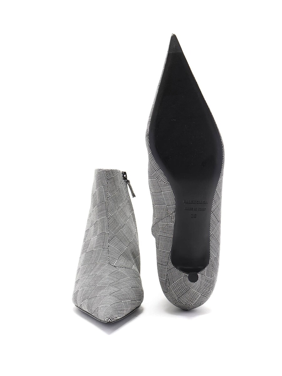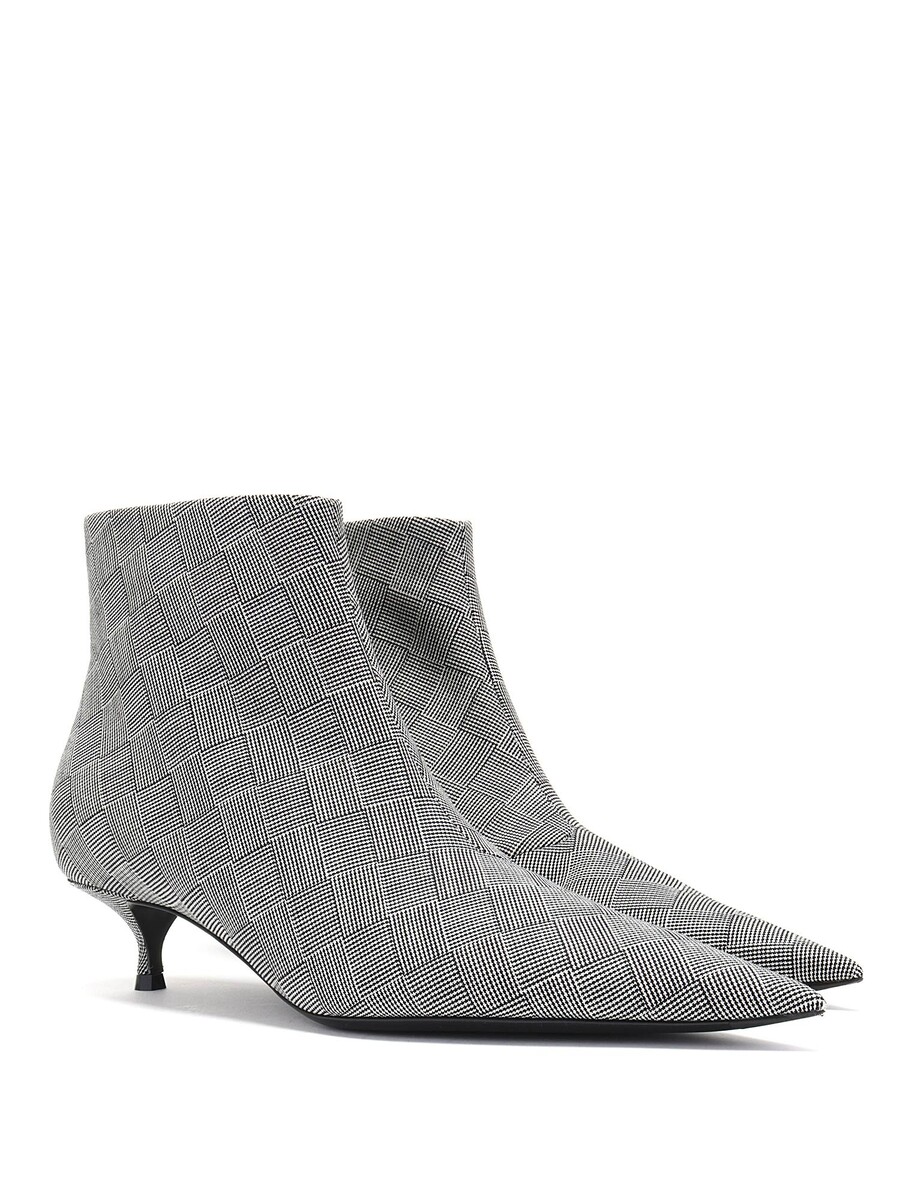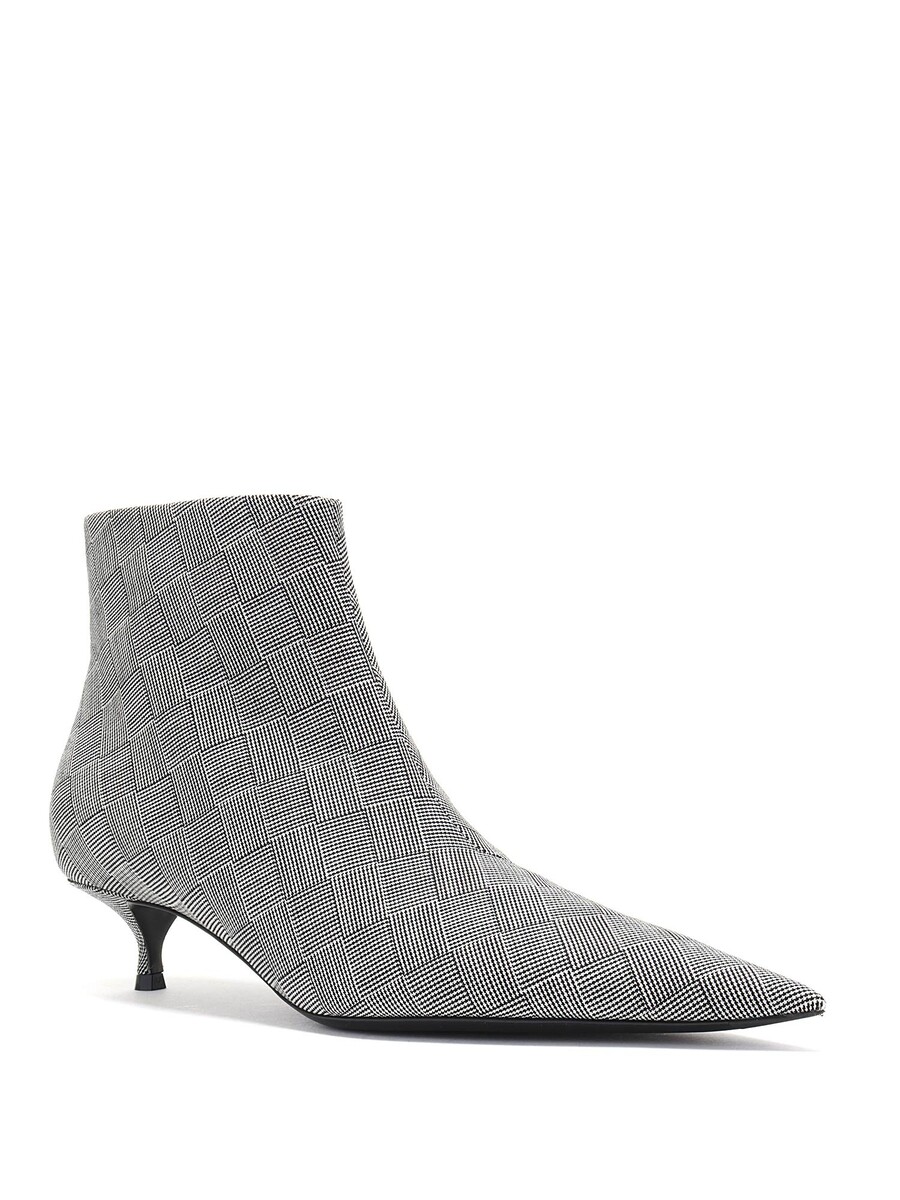 Checkered houndstooth twill kitten heel ankle boots in black and white. Signature pointy ‘Knife’ toe. Zip closure at inner side. With box.