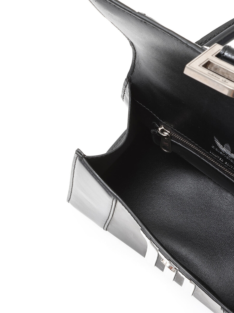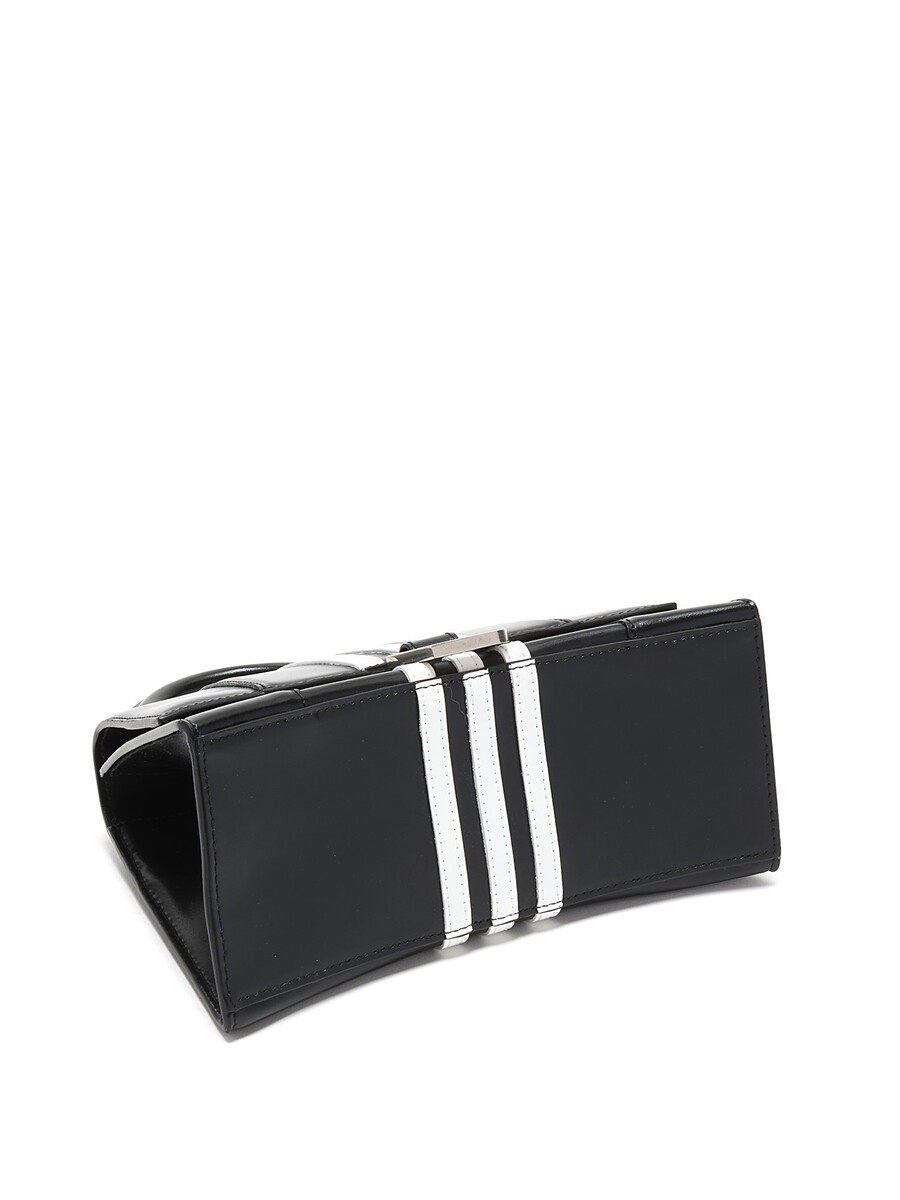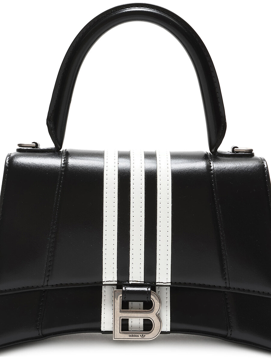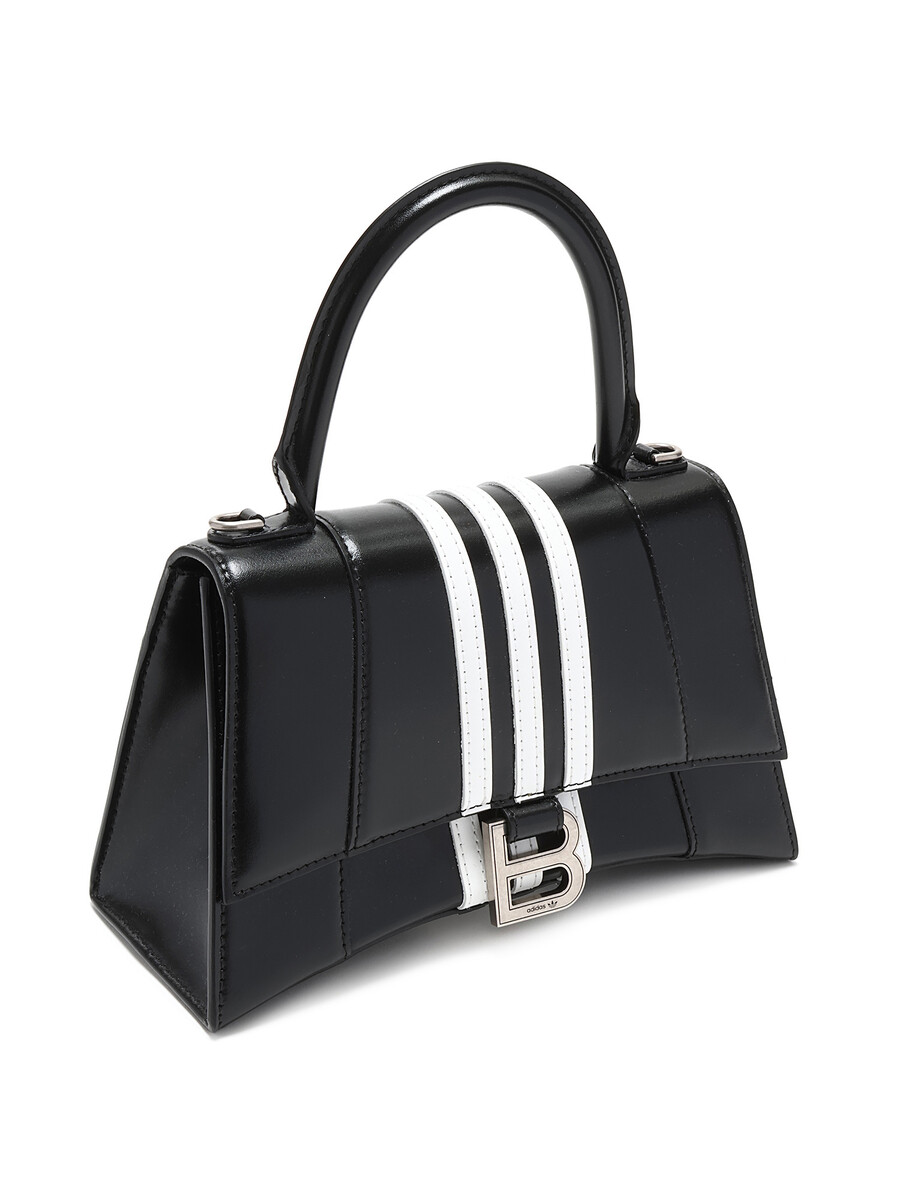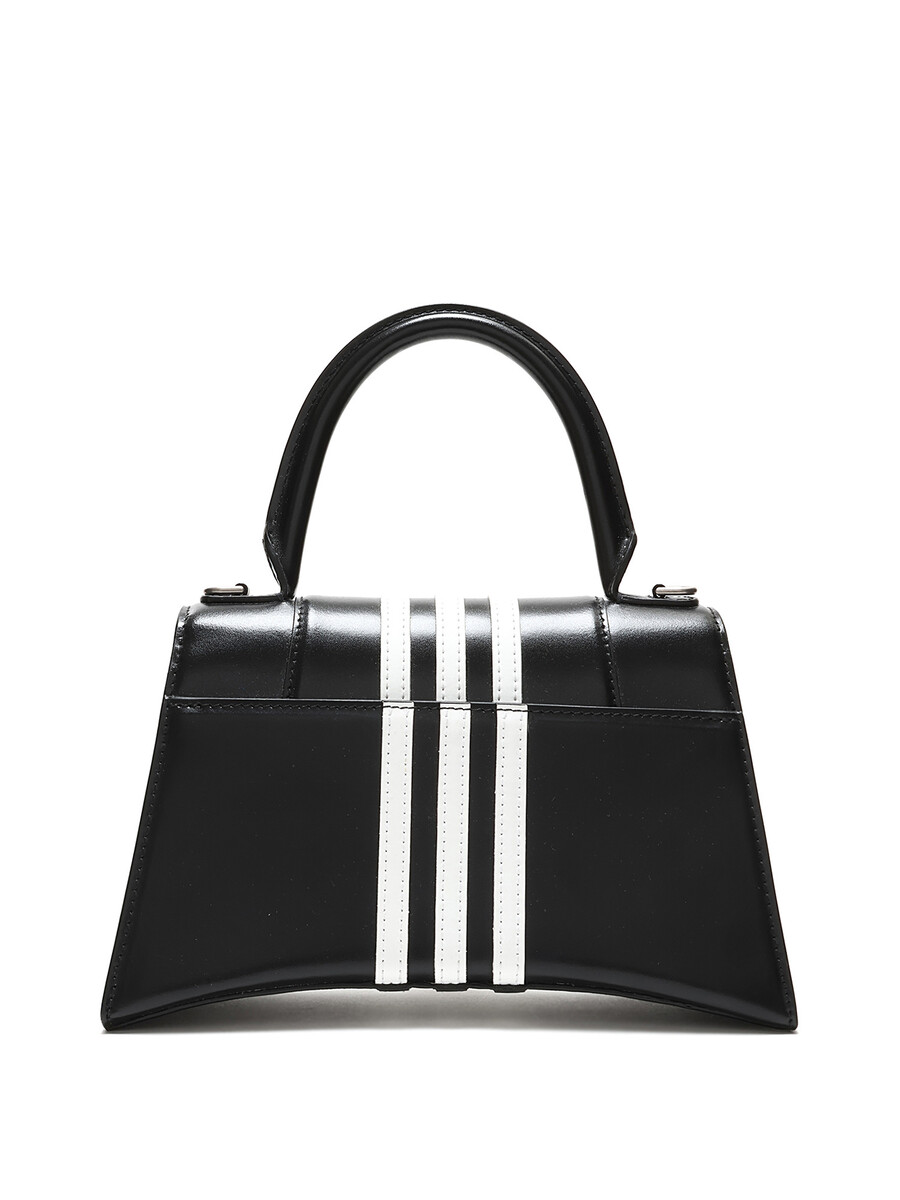 Small hourglass shape top handle bag with black and white stripe pattern. Magnetic snap closure. Dual rolled handles and detachable adjustable shoulder strap in silver-tone hardware. Comes with dust bag.