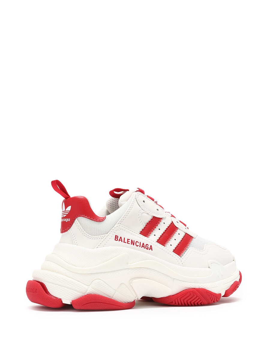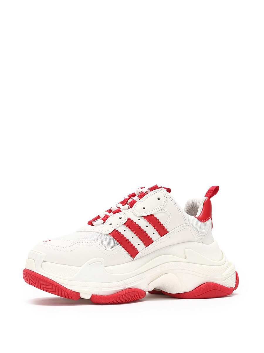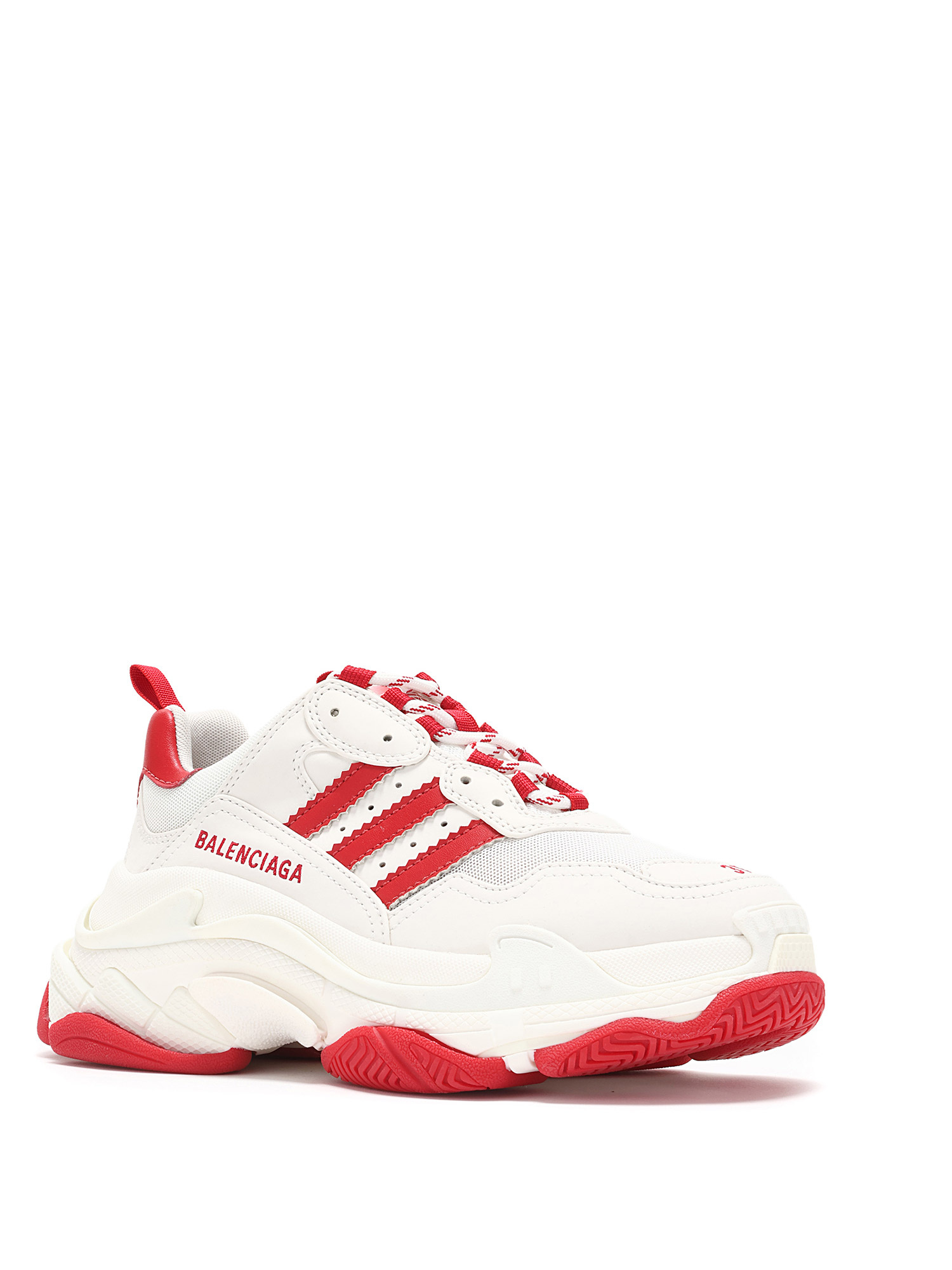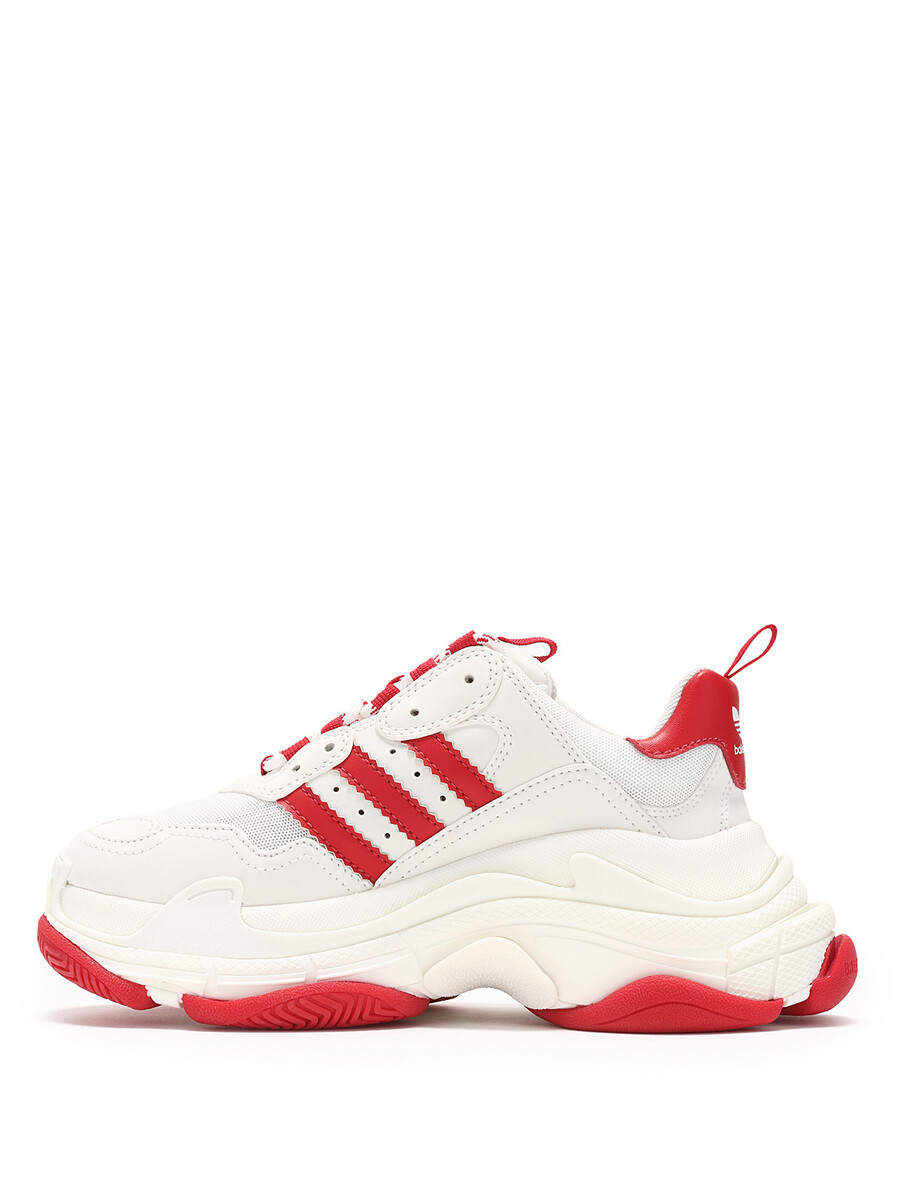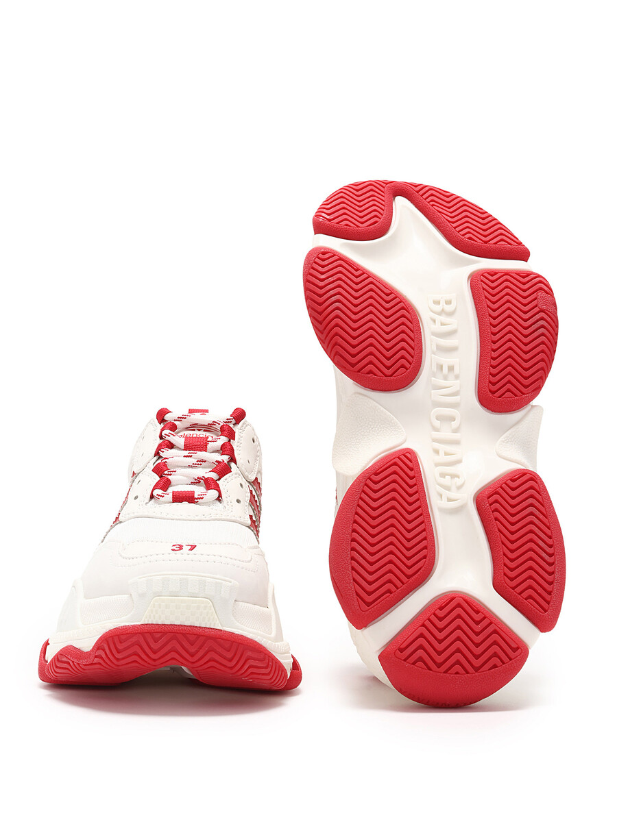 Low-top panelled sneakers in white and red tones. Lace-up closure. Round toe styling. Treaded rubber platform sole. Logo on the side.