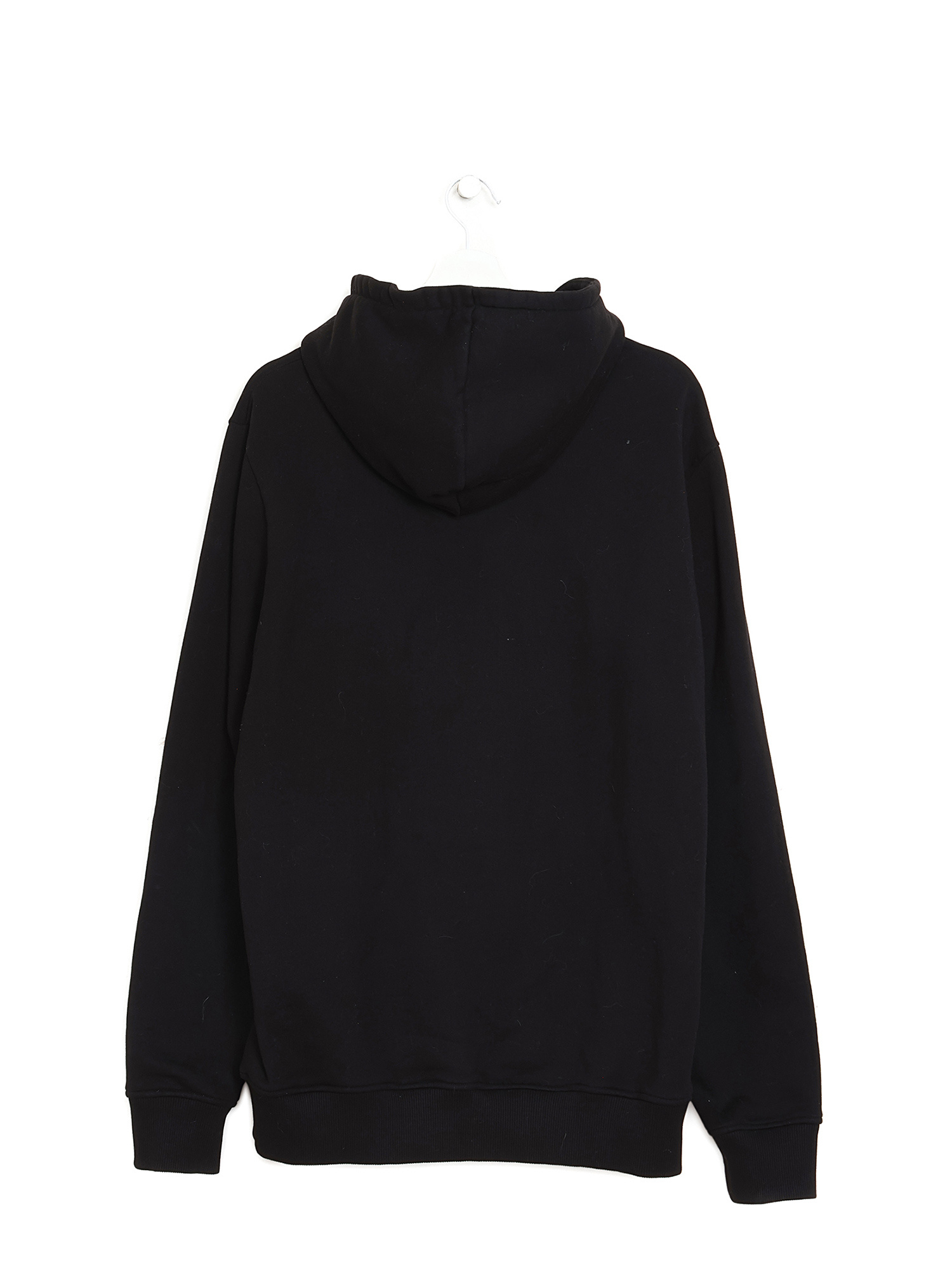 Long sleeve black hoodie with graphic logo. Integrated hood with adjustable drawstrings. Silver-tone metal hardware. Ribbed cuffs and hem.