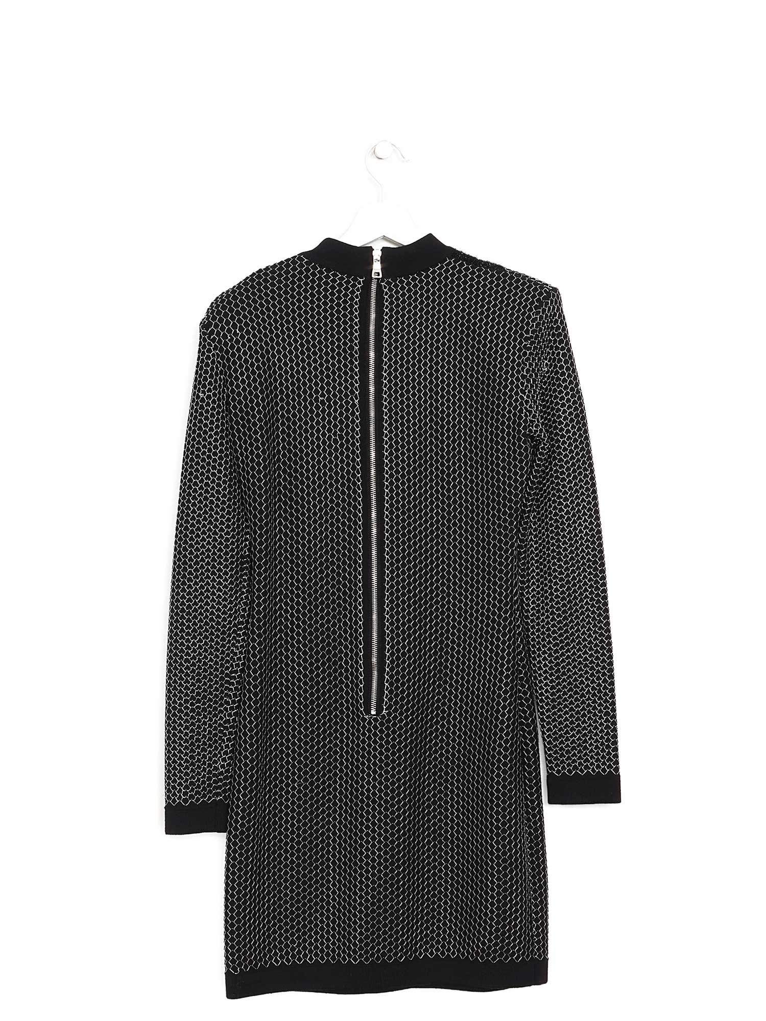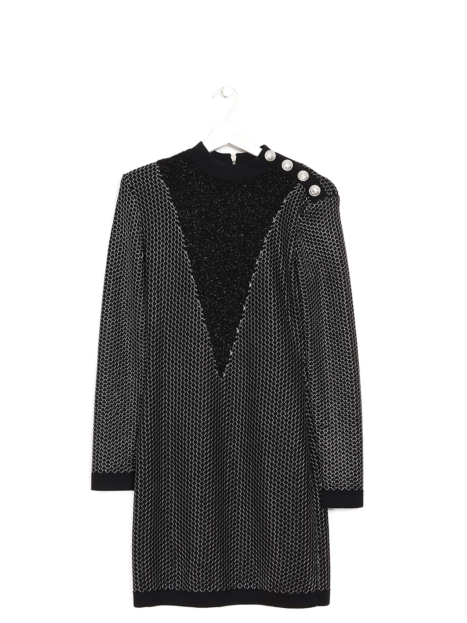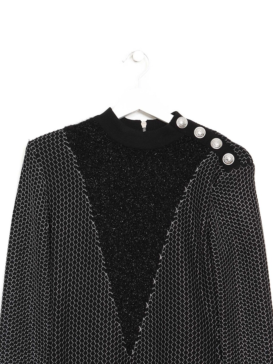 Long sleeve dress in black featuring decorative buttons on the shoulders.