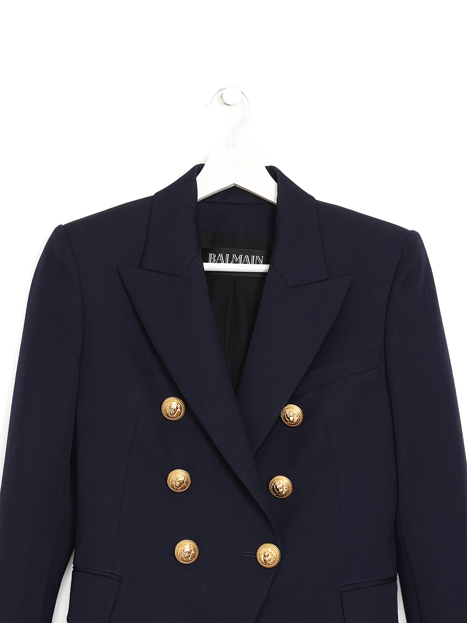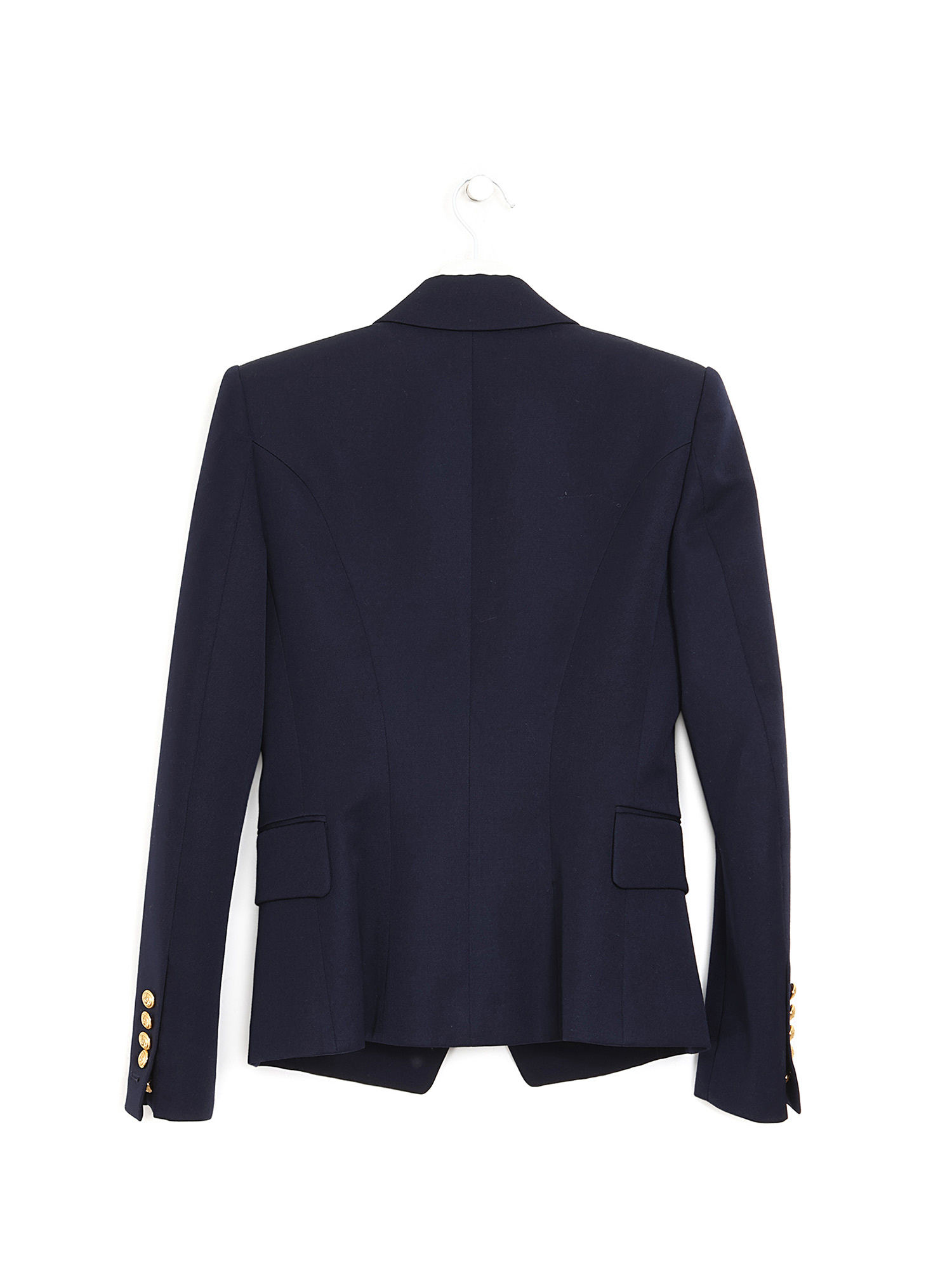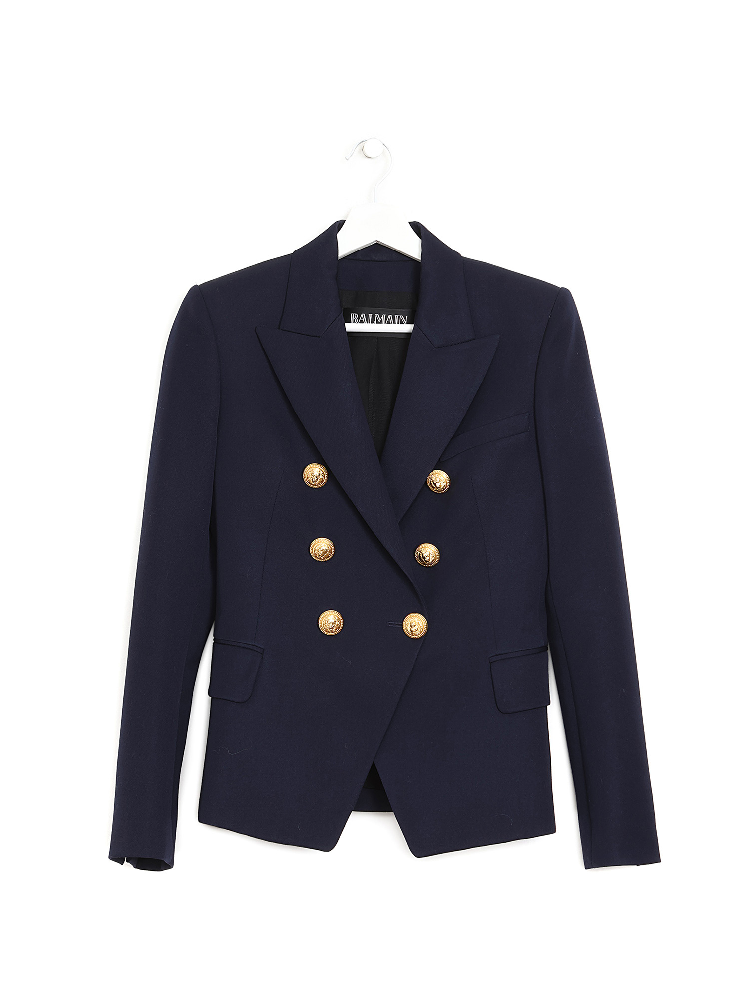 Double-breasted navy wool blazer with gold-tone button closure. Features a notch lapel collar and structured shoulders.