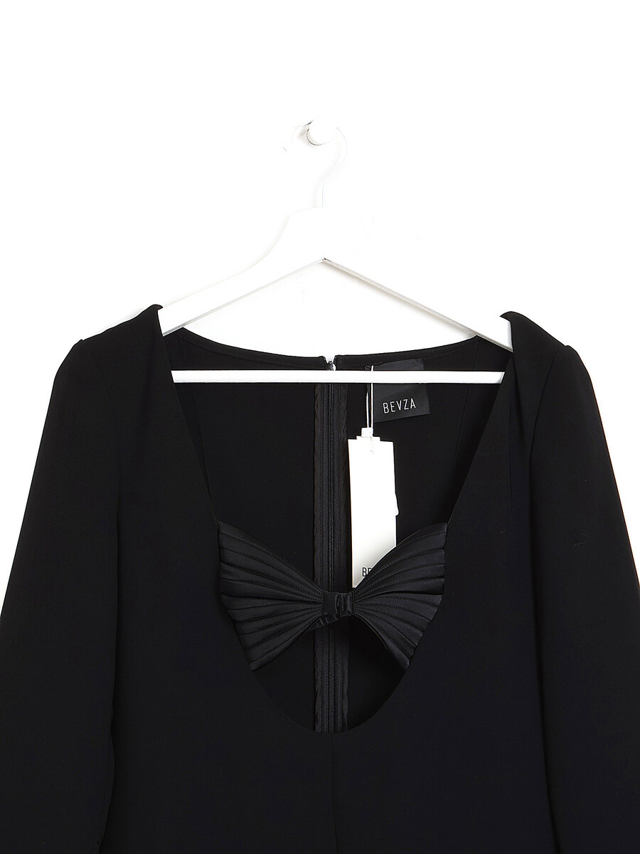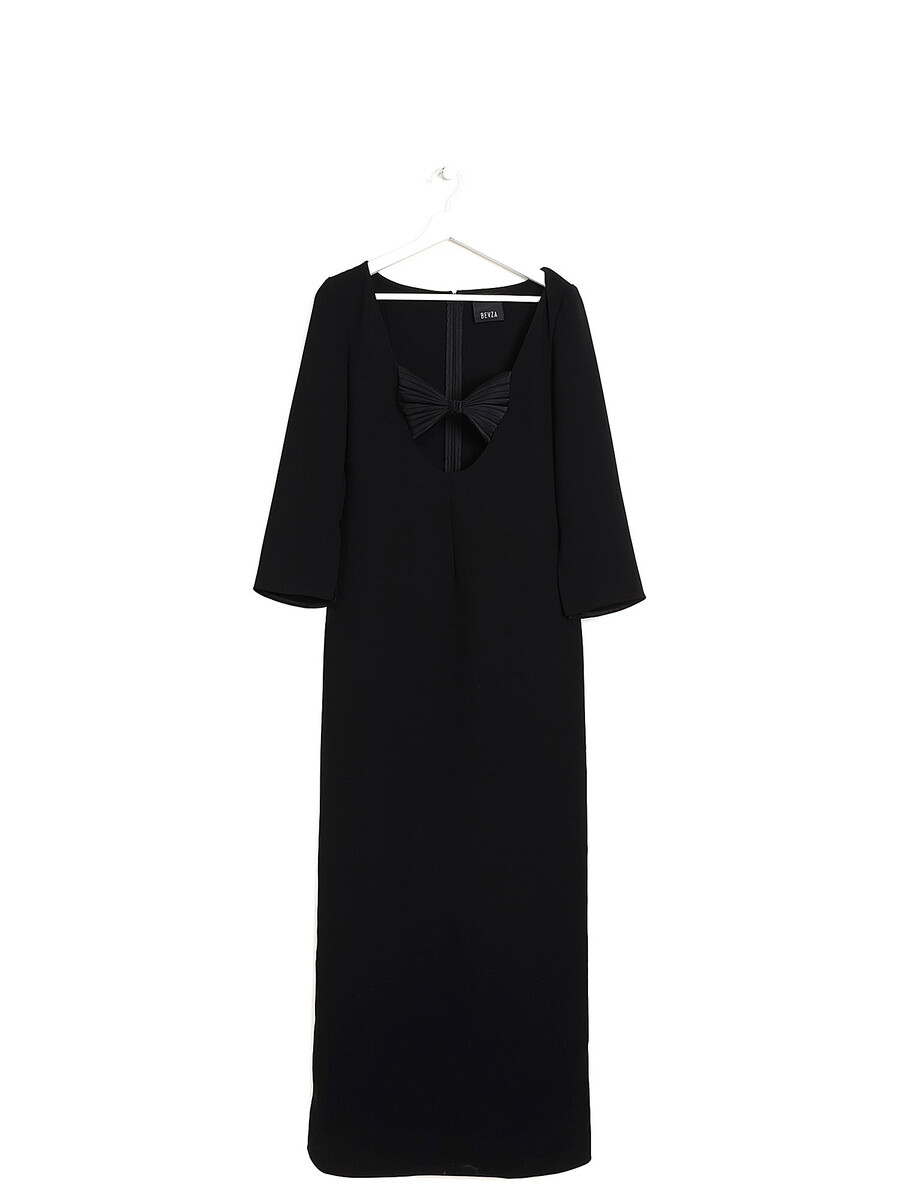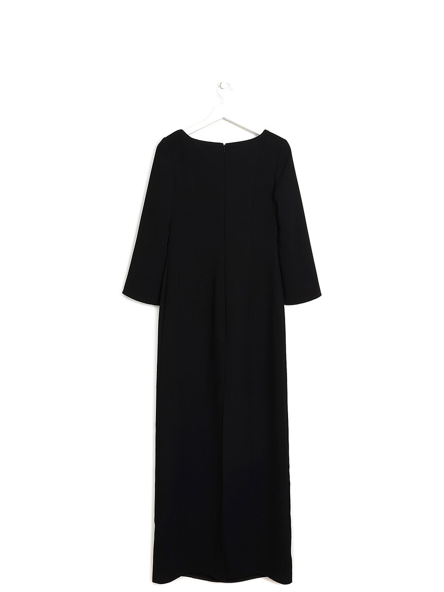 Long sleeve maxi dress in black featuring a unique seashell bra detail. Dissimulated back zip closure. Deep scoop neck with front clasp bra detailing. Slits at cuffs.