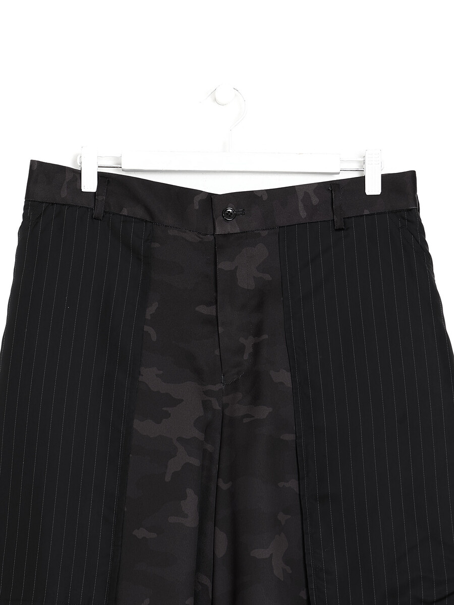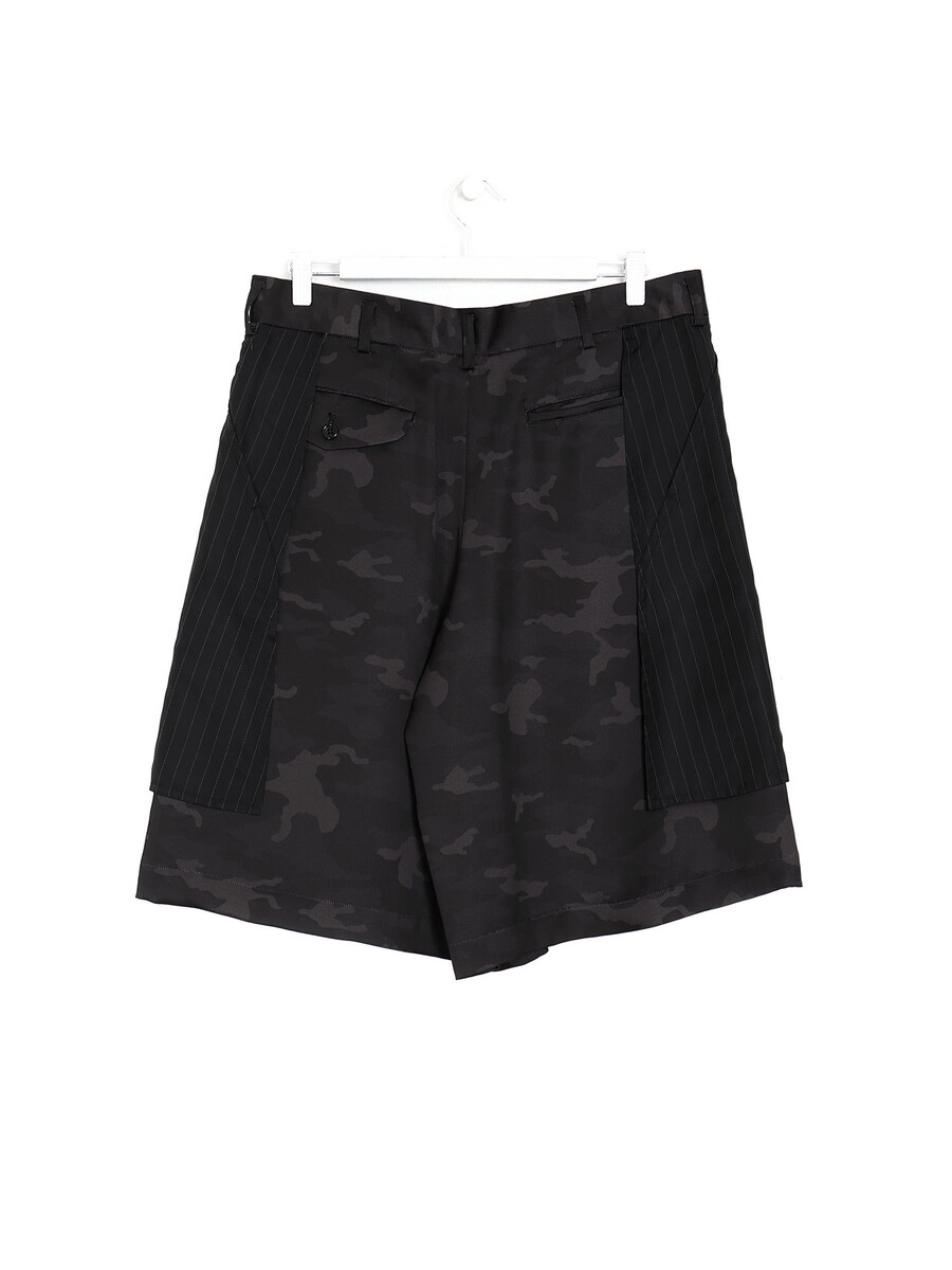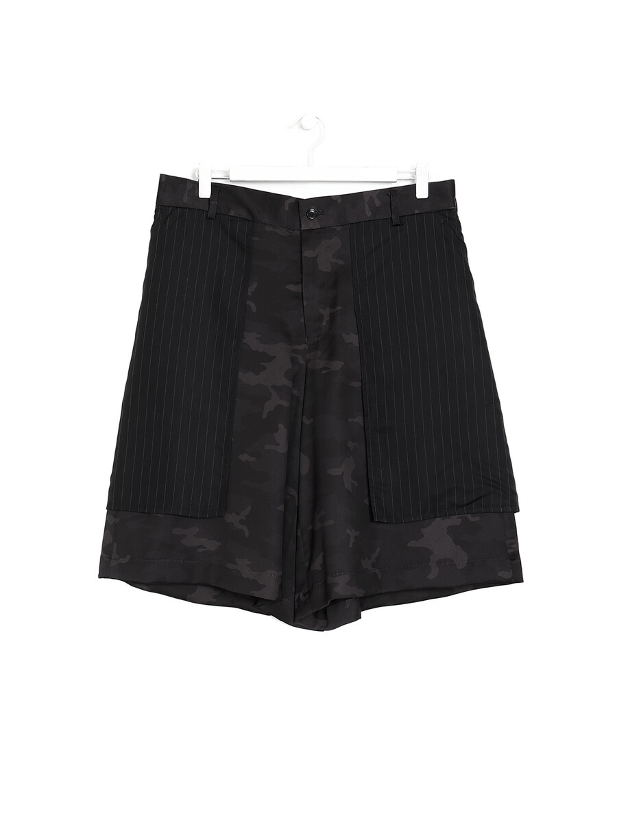Nylon camouflage print shorts in black-tones. Trompe-l’œil pinstriped inside-out effect pocket panelling at face. Belt loops. Zip closure at face. Pockets at back.