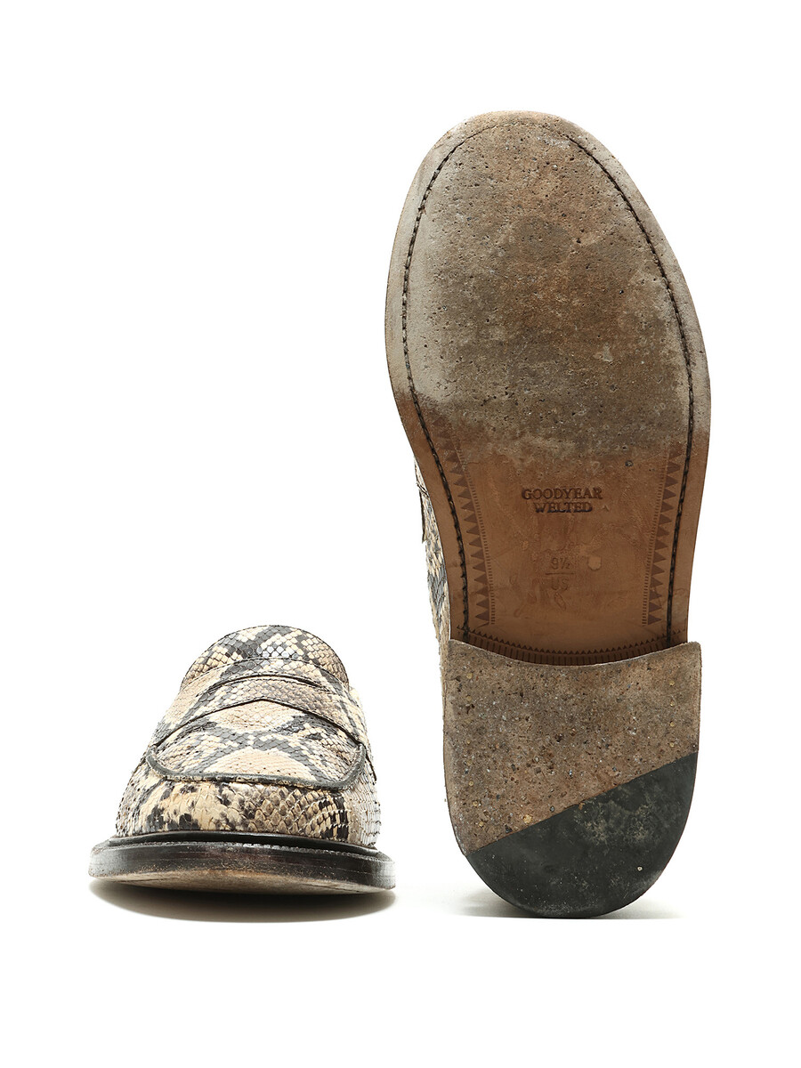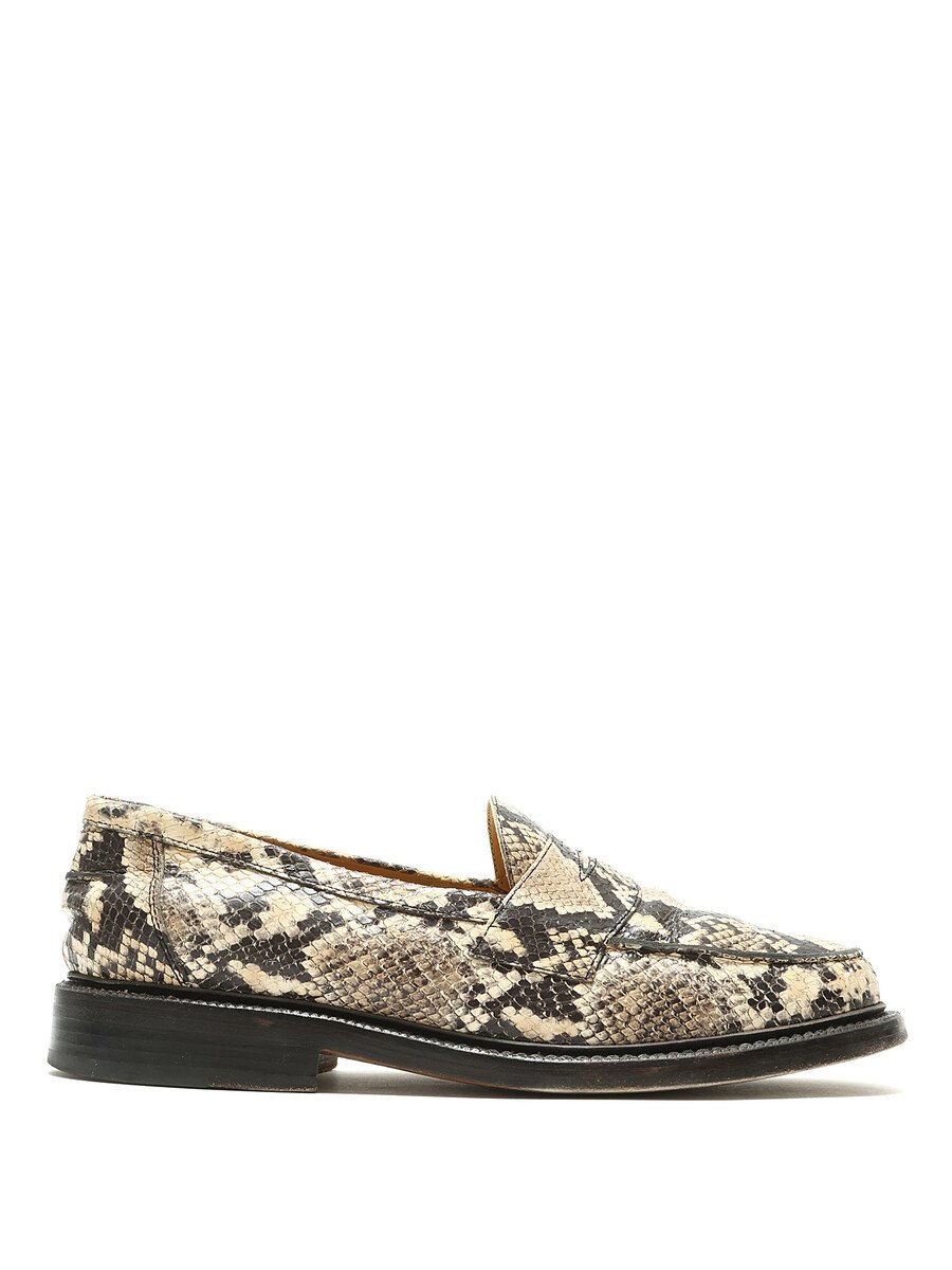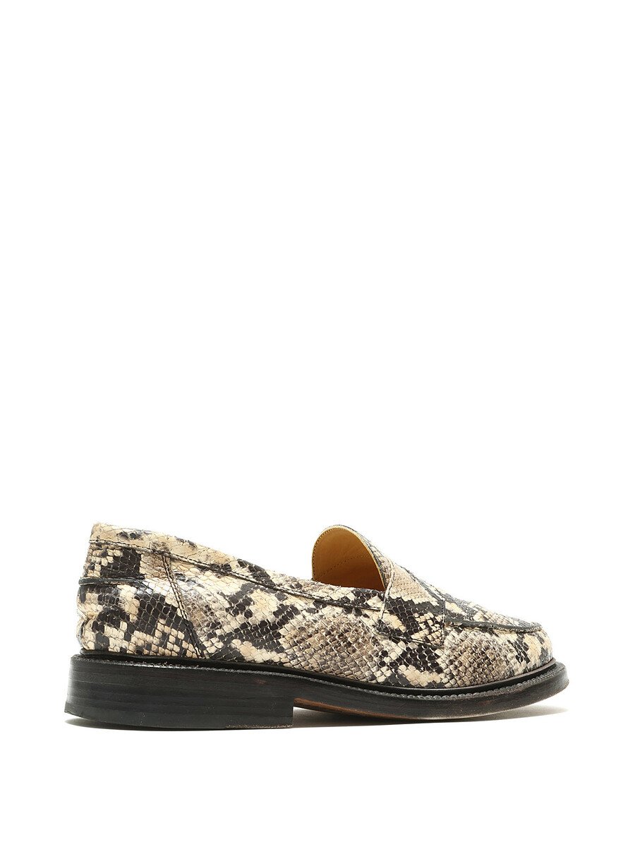 Leather loafers featuring a snakeskin print in beige and black. Slip-on style with a round toe and leather sole.