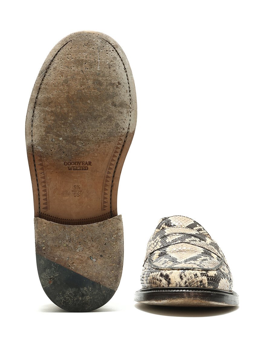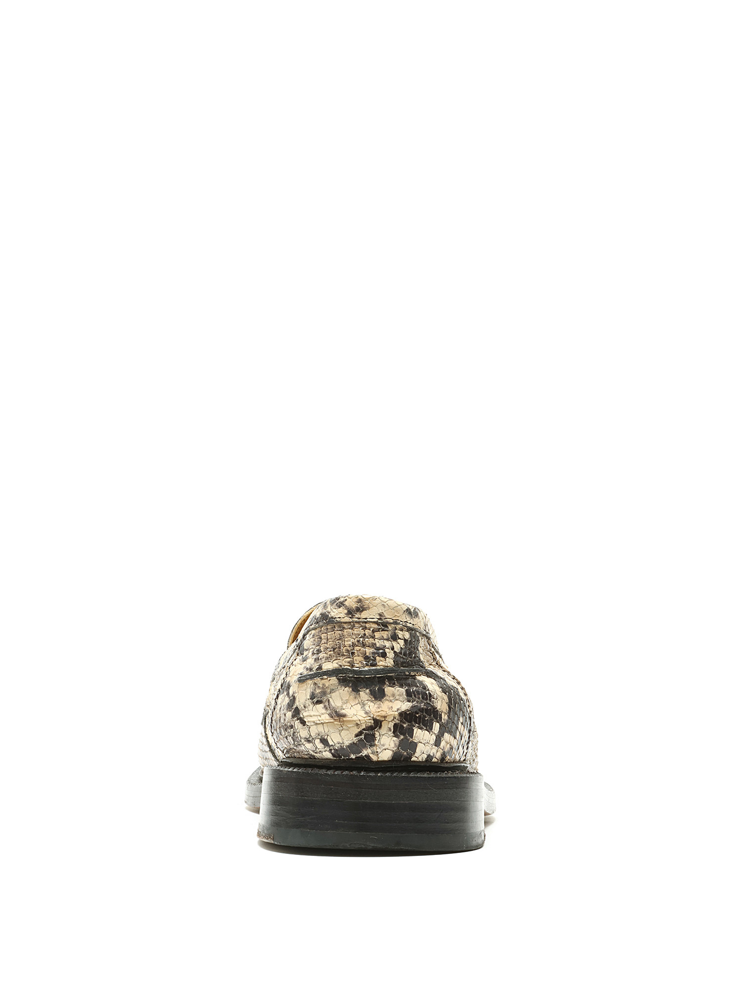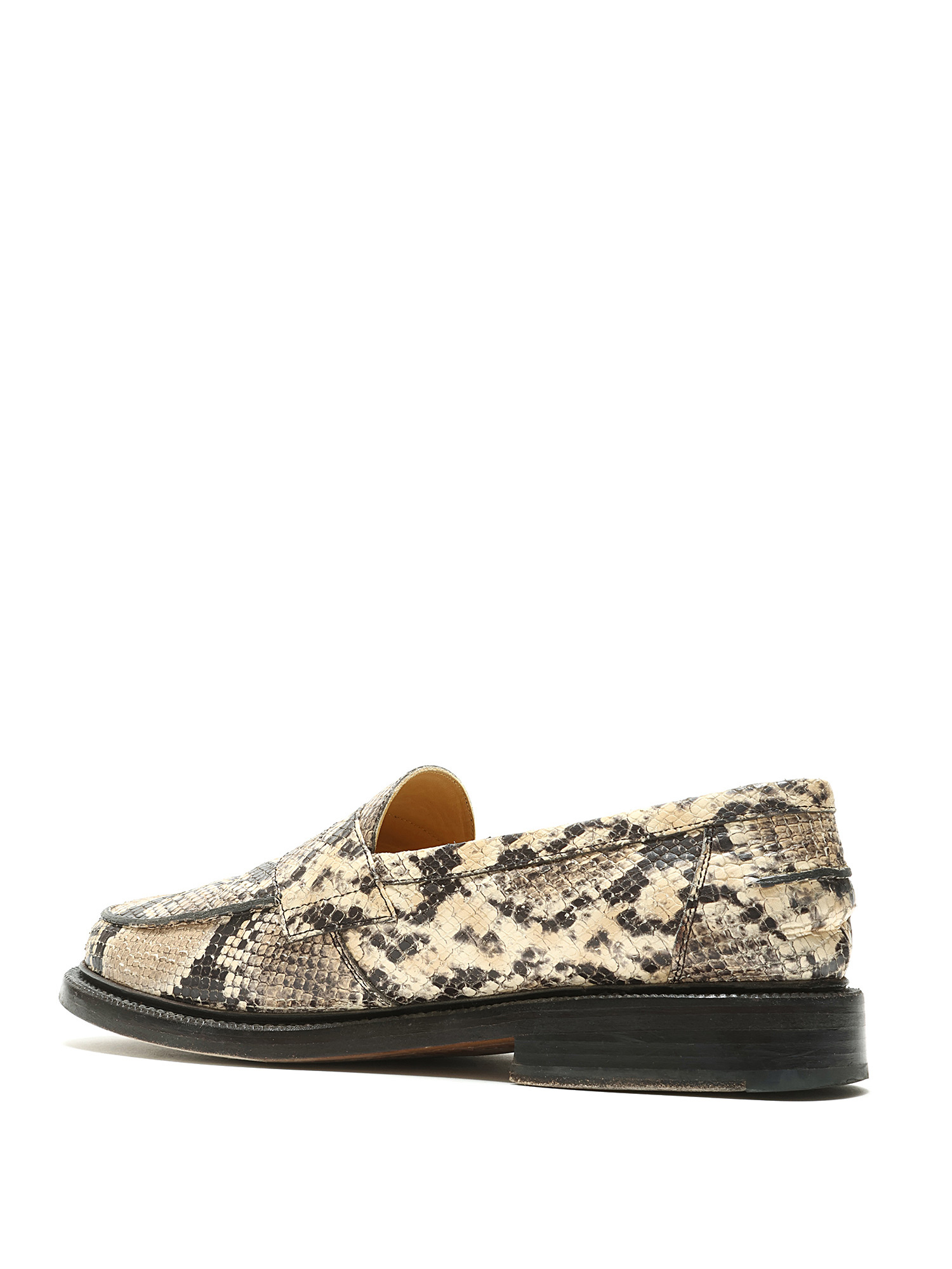 Leather loafers featuring a snakeskin print in beige and black. Slip-on style with a round toe and leather sole.