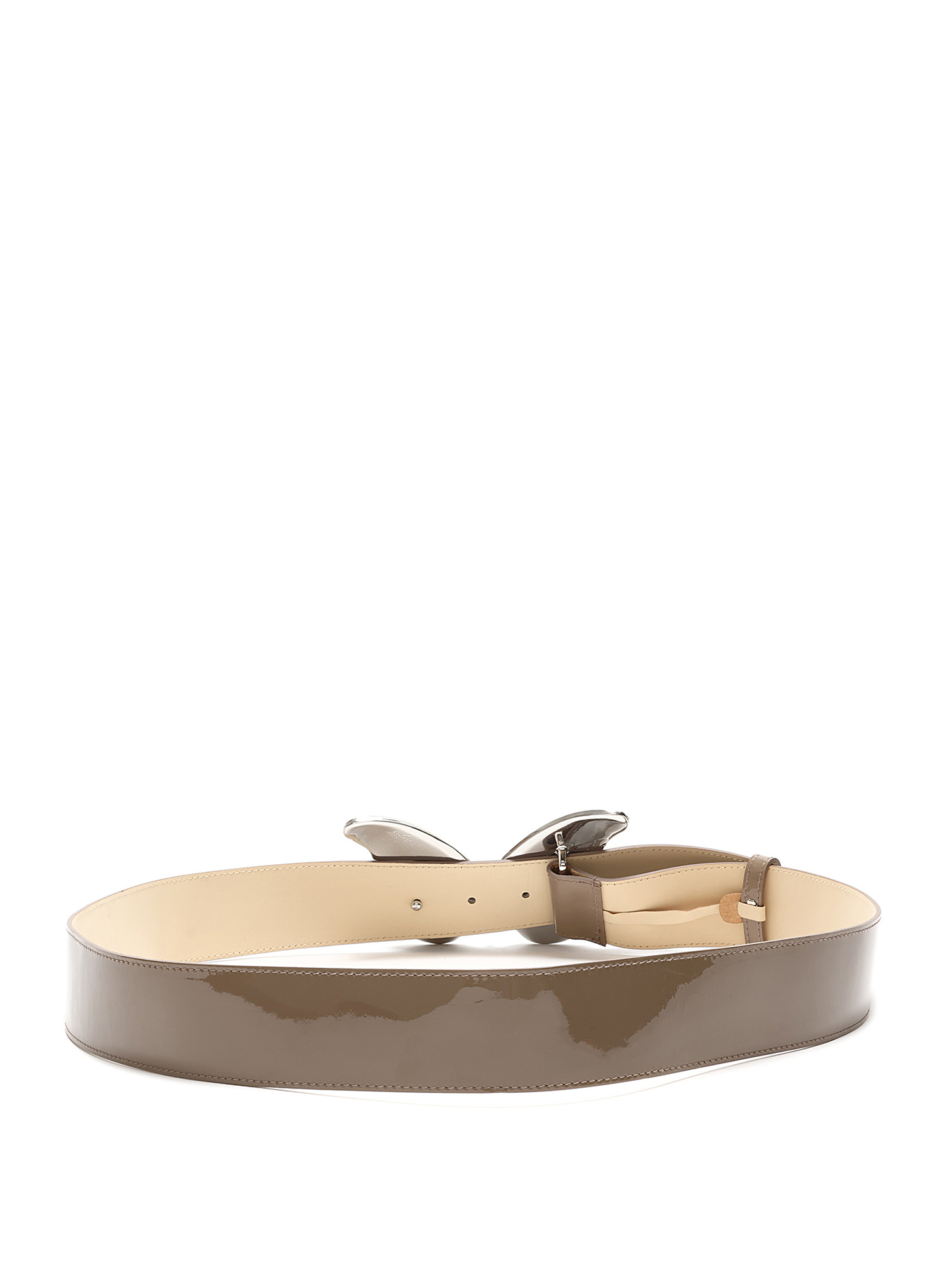 Patent leather belt in beige. Features a metallic butterfly-shaped pin buckle. Adjustable strap closure.