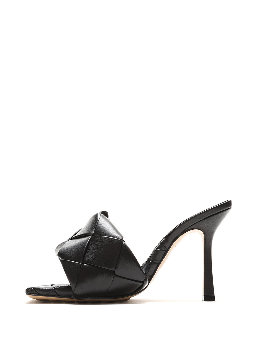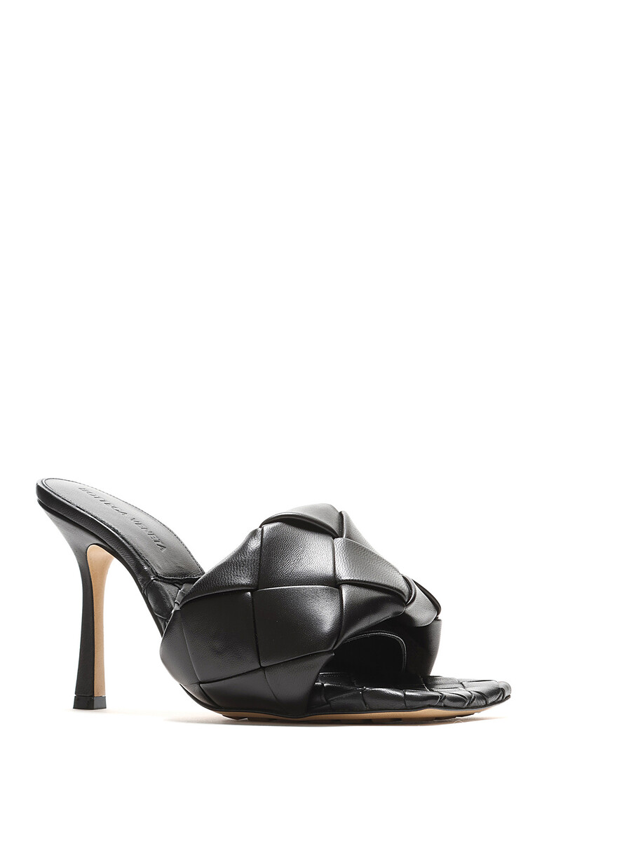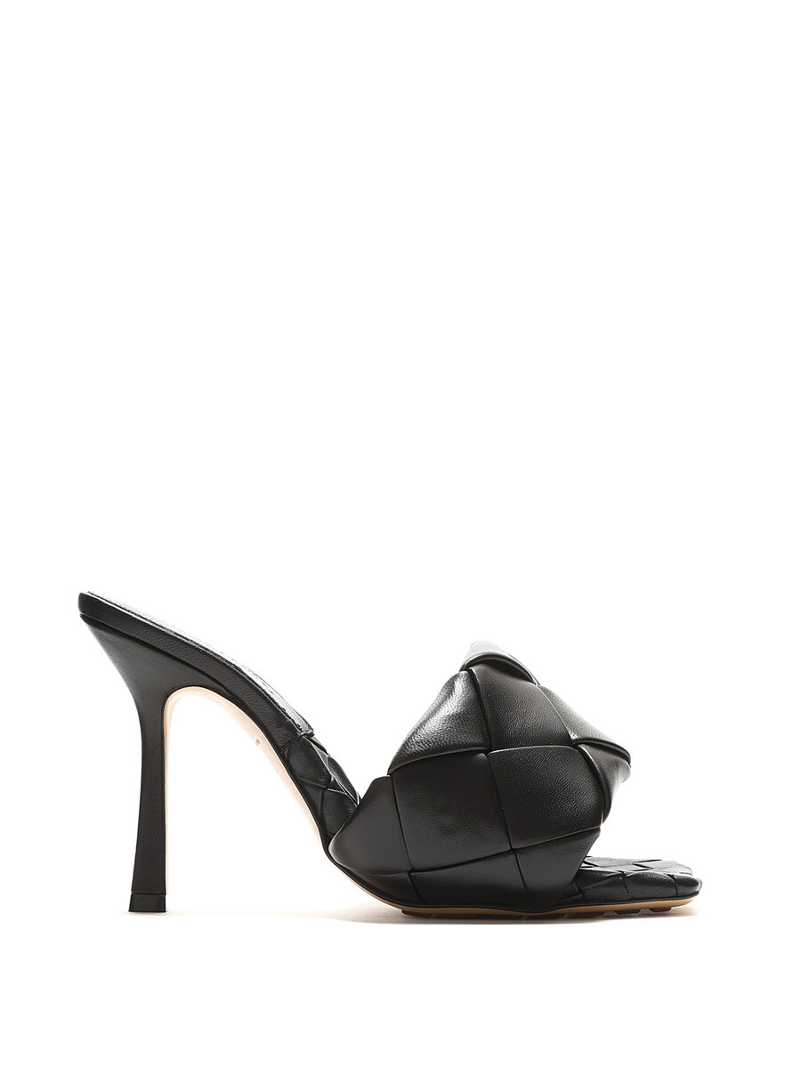 Grained leather high-heel sandals in black with Intrecciato pattern. Square toe. Rubber outsole.