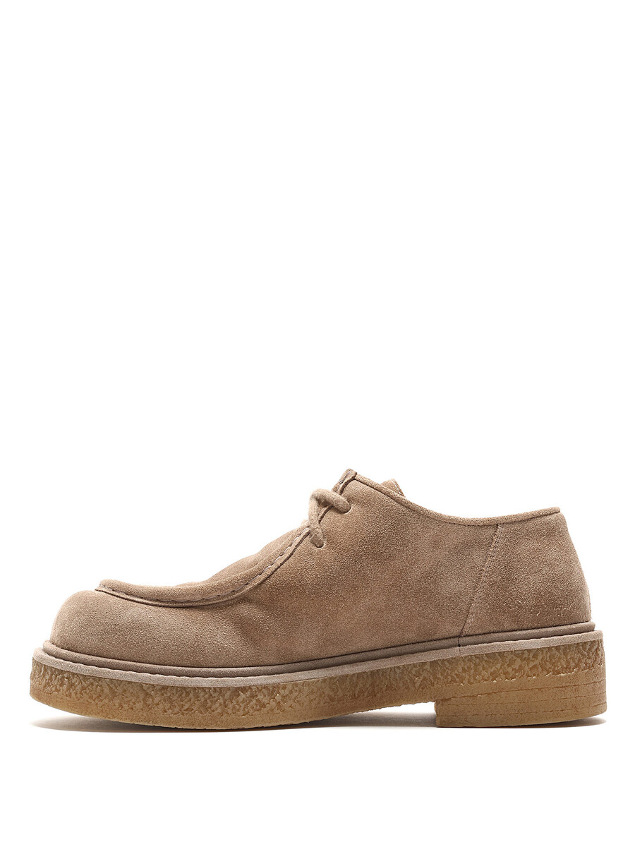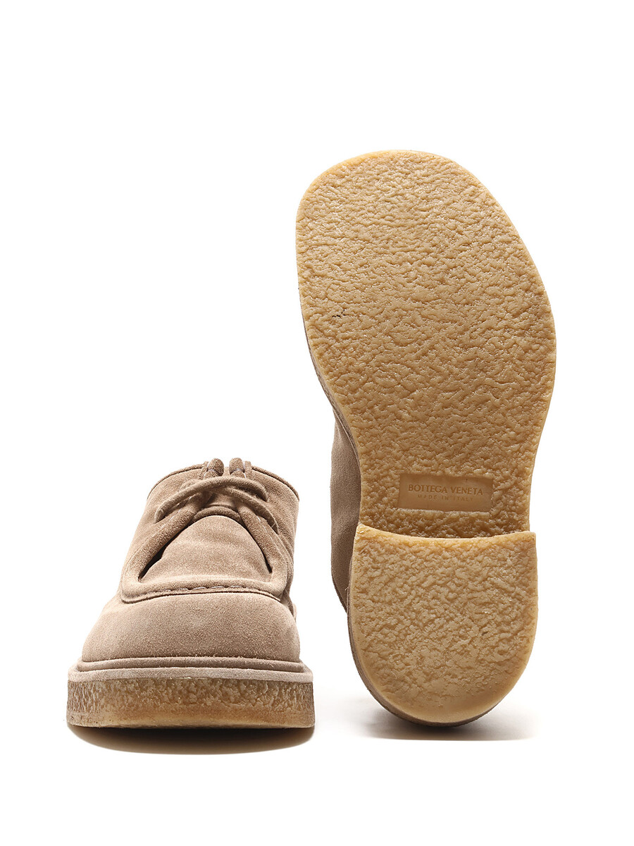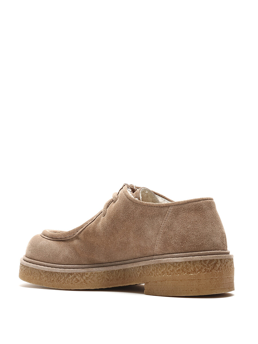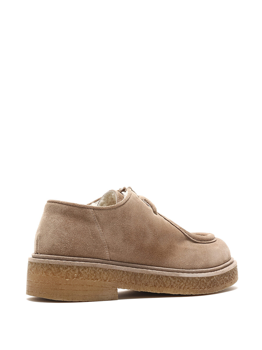 Suede lace-up shoes in light brown featuring shearling lining. Round toe style with rubber sole.