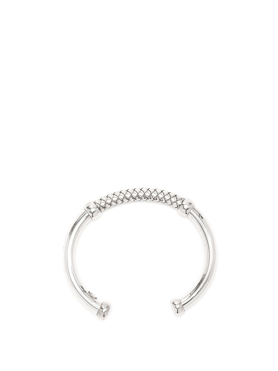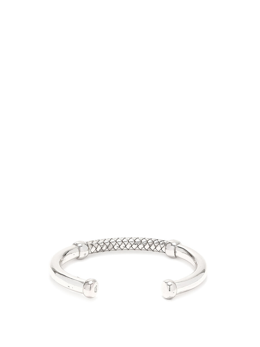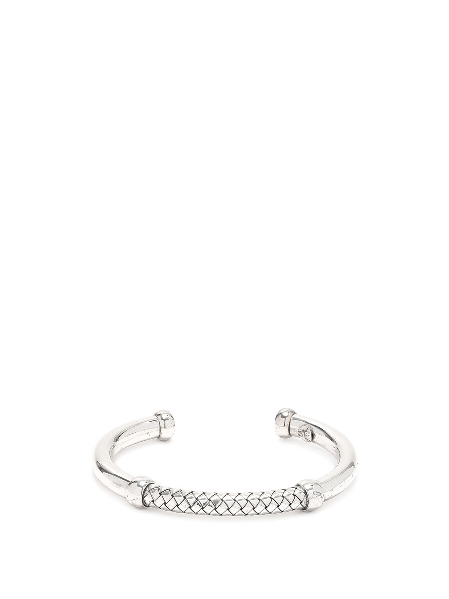 Silver bangle bracelet with signature intrecciato weave design. Polished finish. Slip-on style.