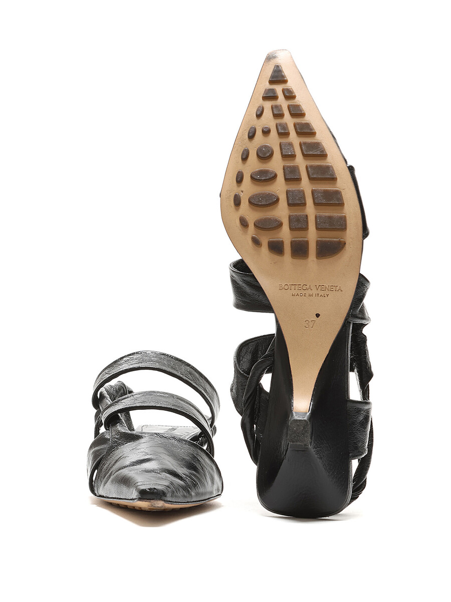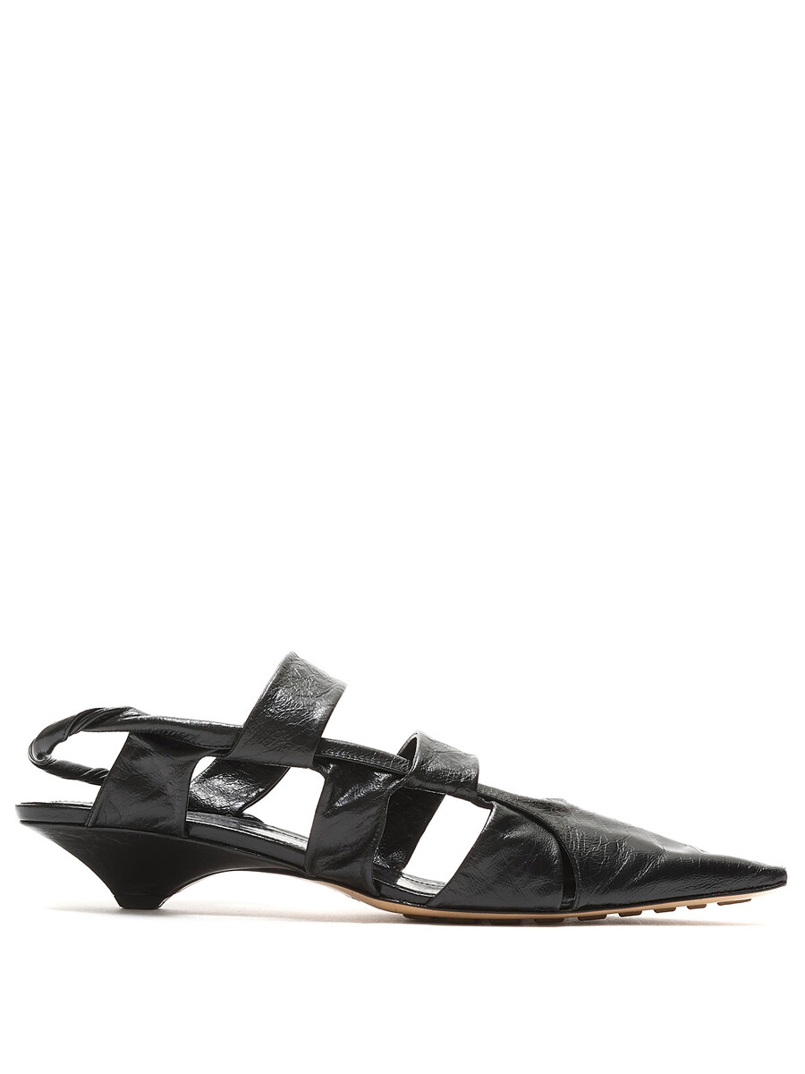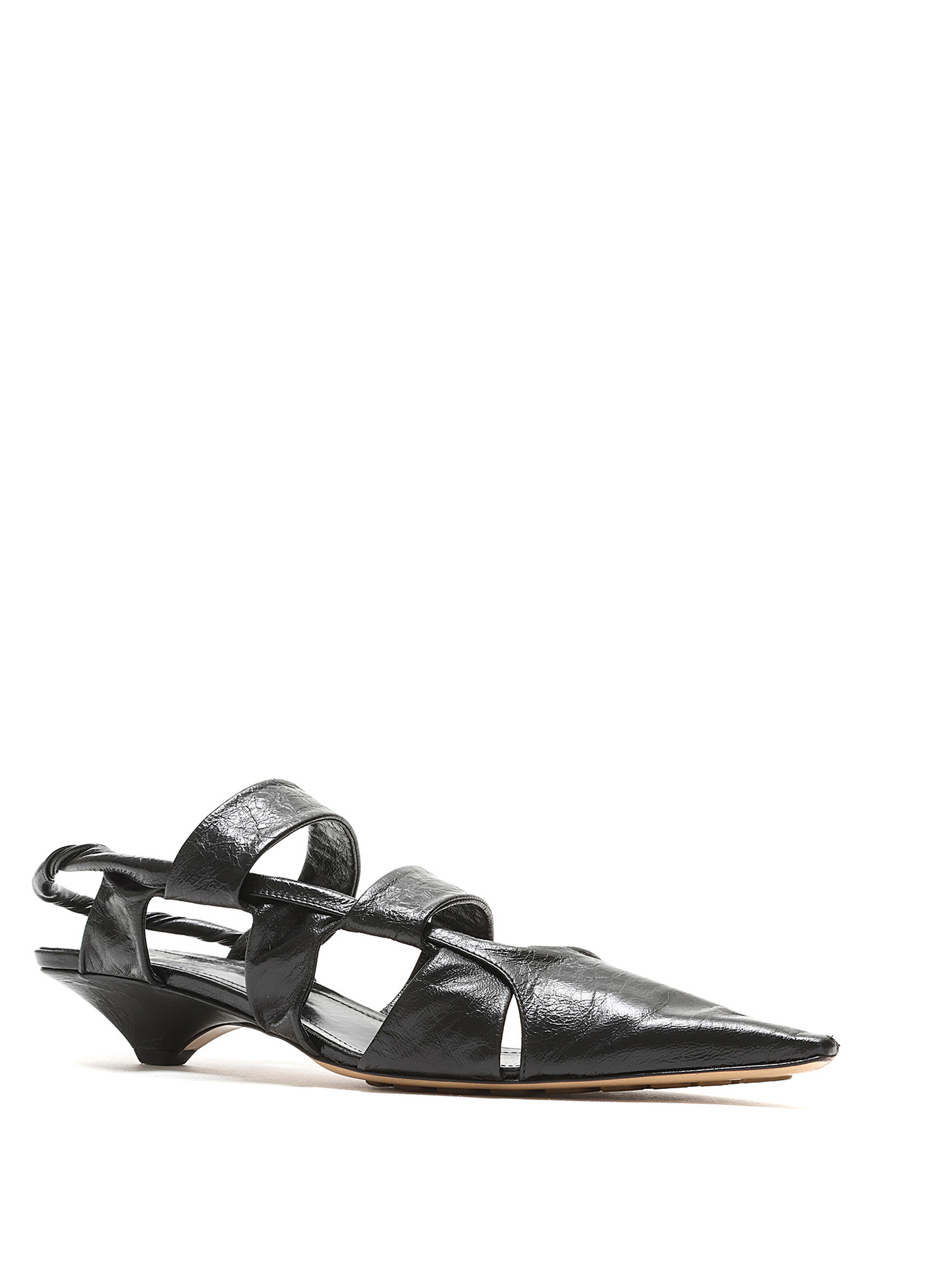 Grained leather pointed-toe high heel pumps in black. Buckle closure. Leather sole.