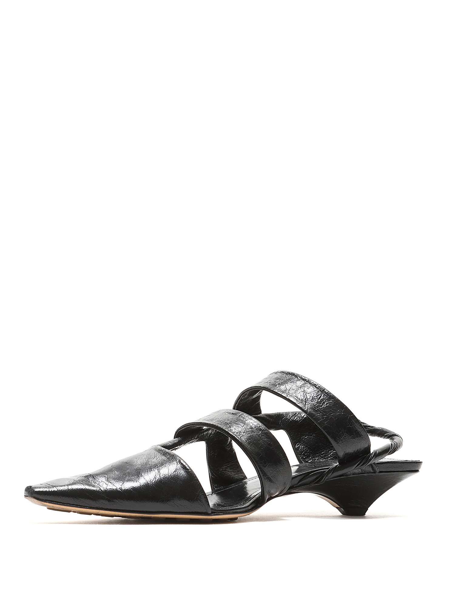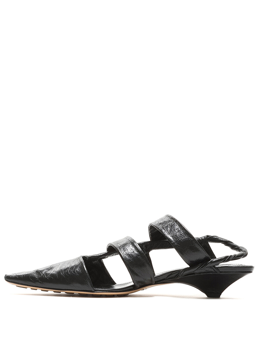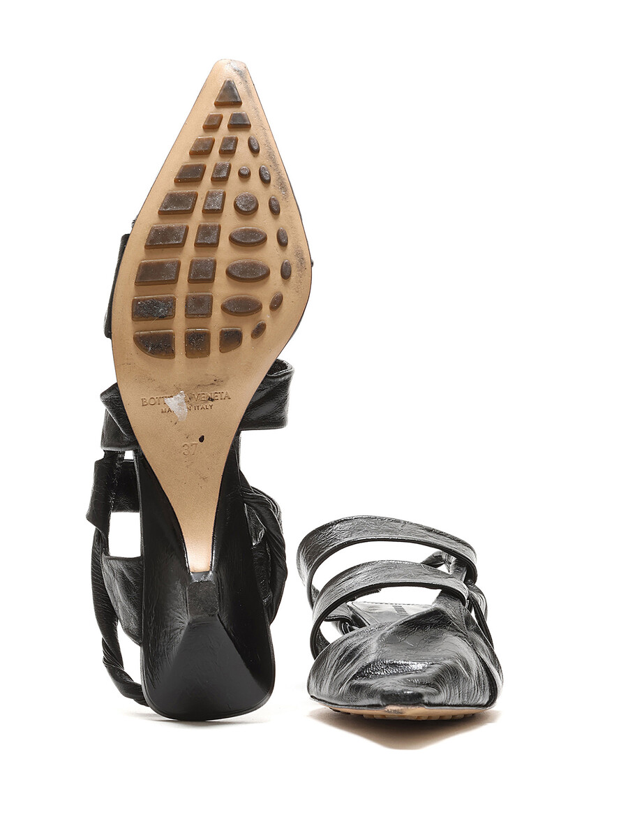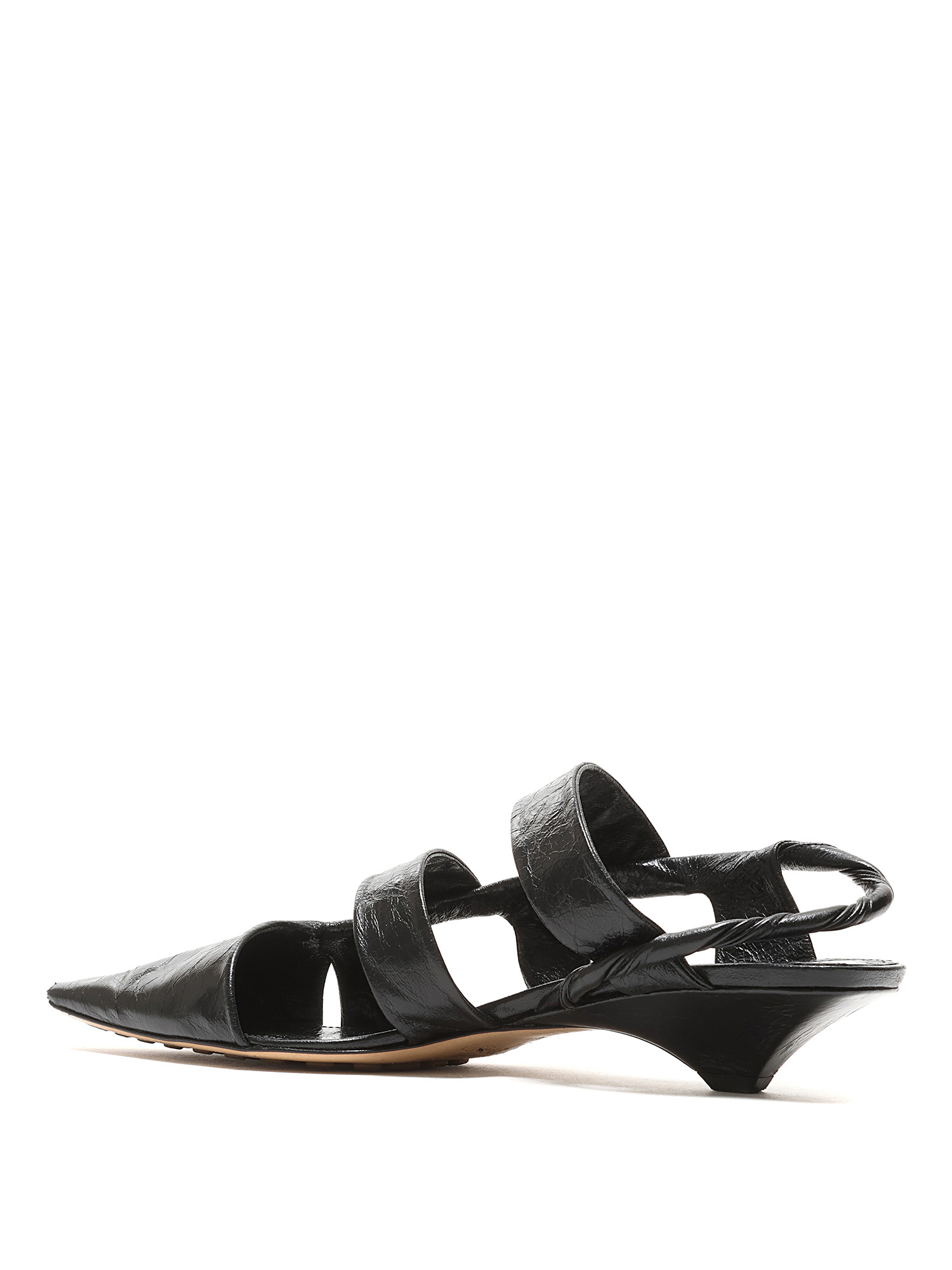 Grained leather pointed-toe high heel pumps in black. Buckle closure. Leather sole.