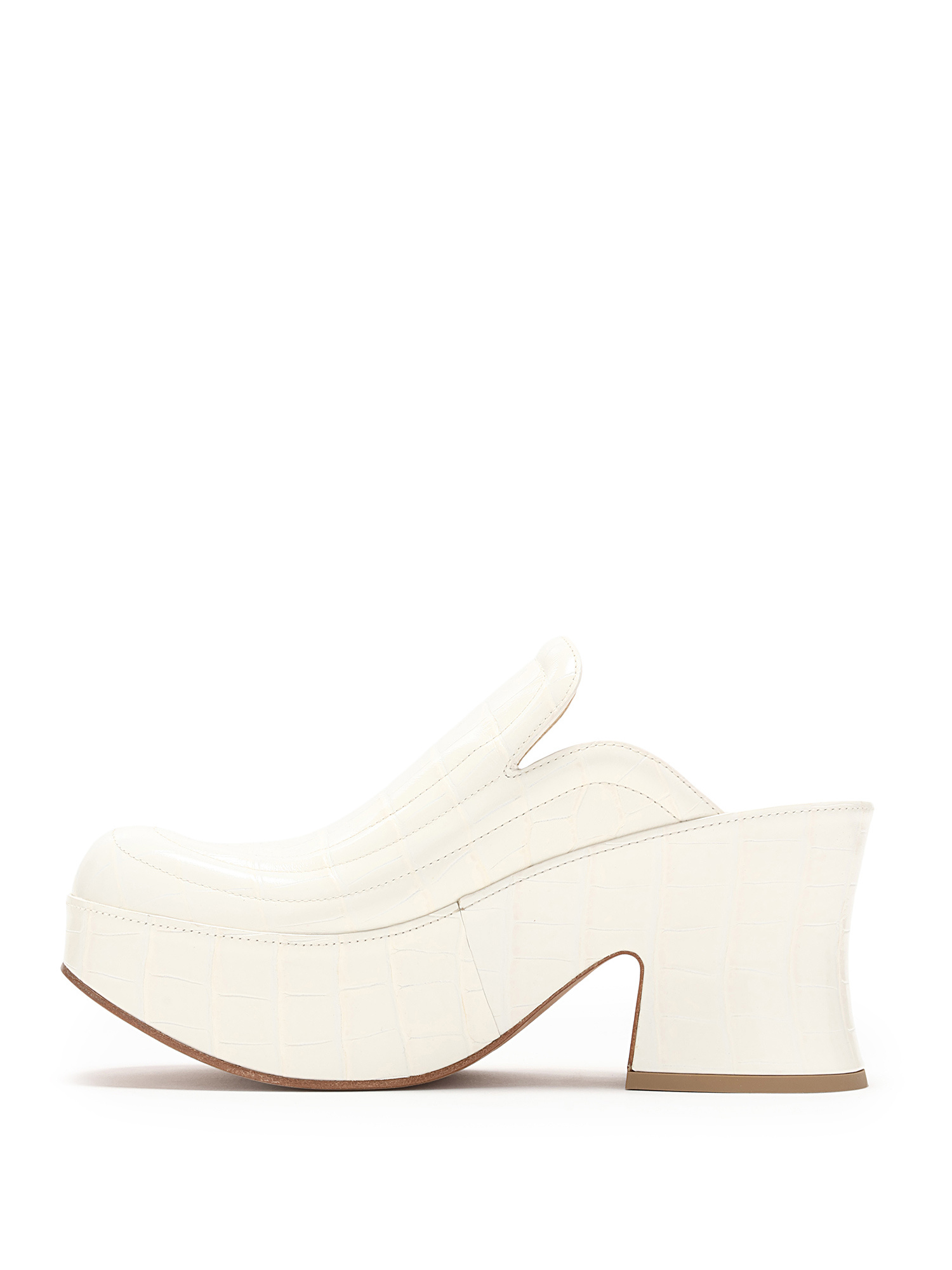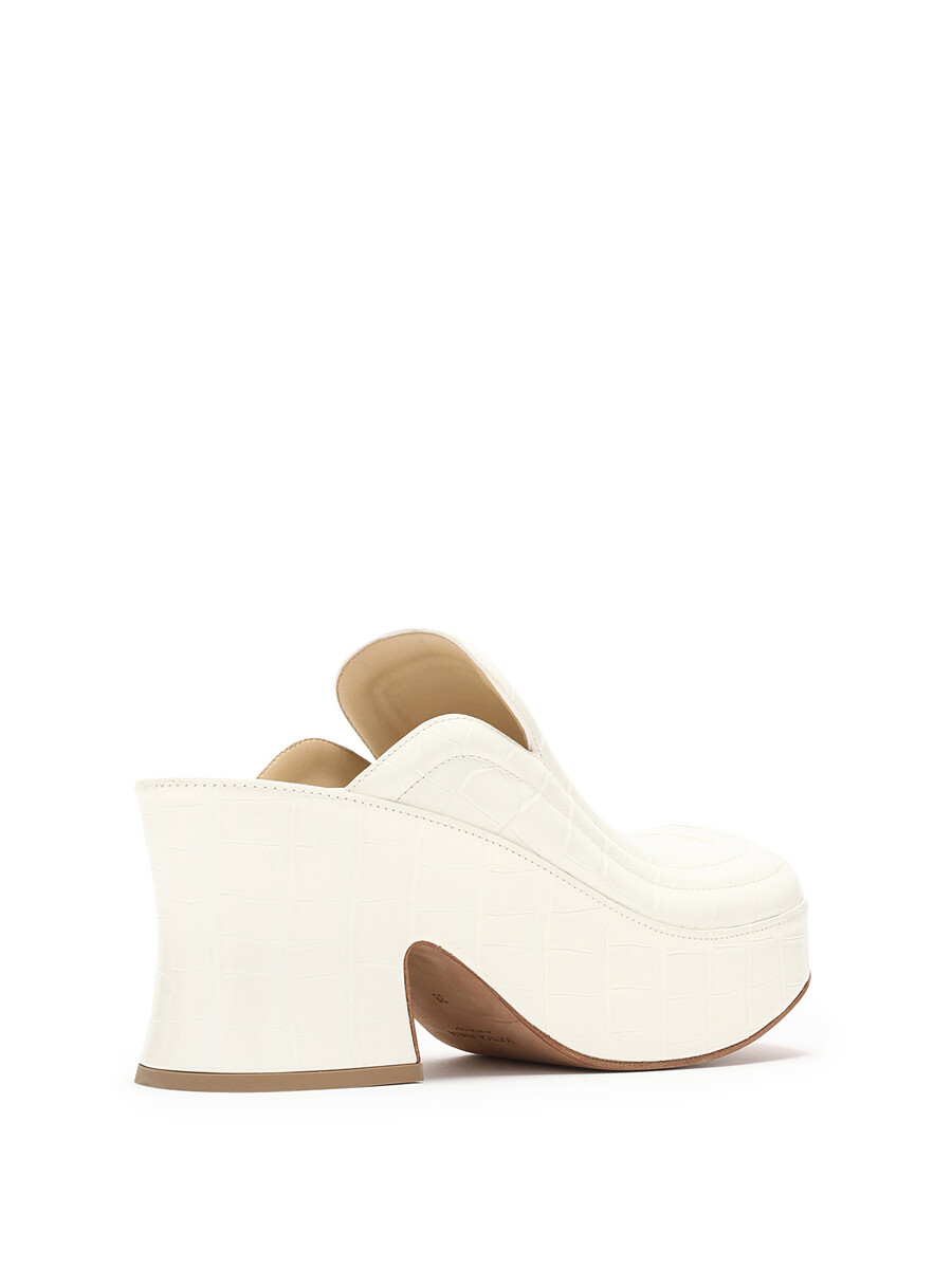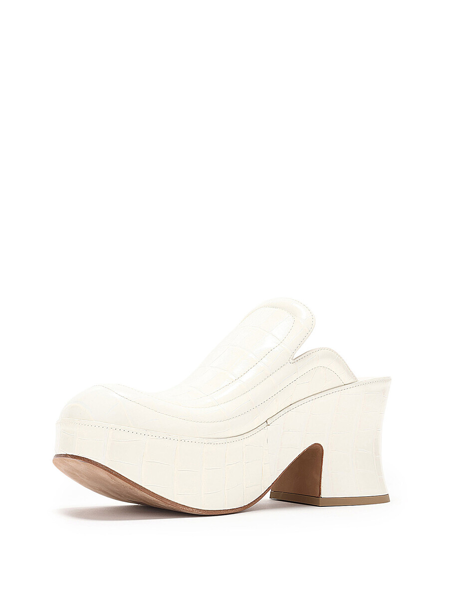 Platform slip-on shoes with a crocodile effect. Round toe and tonal white stitching. Leather platform sole.
