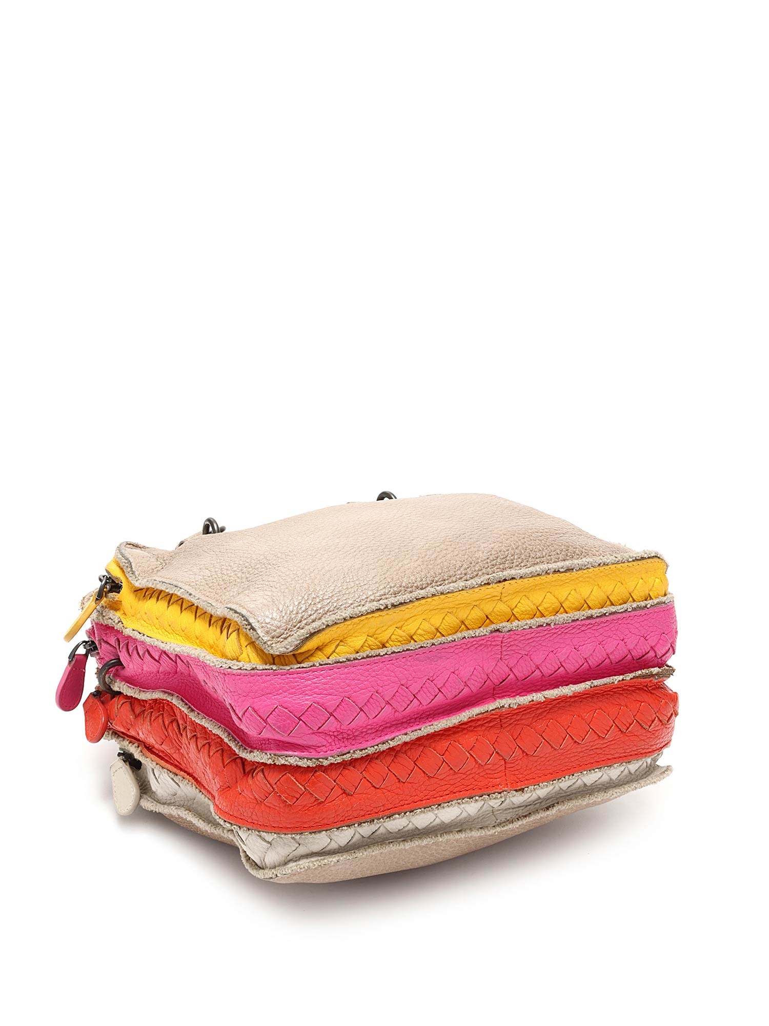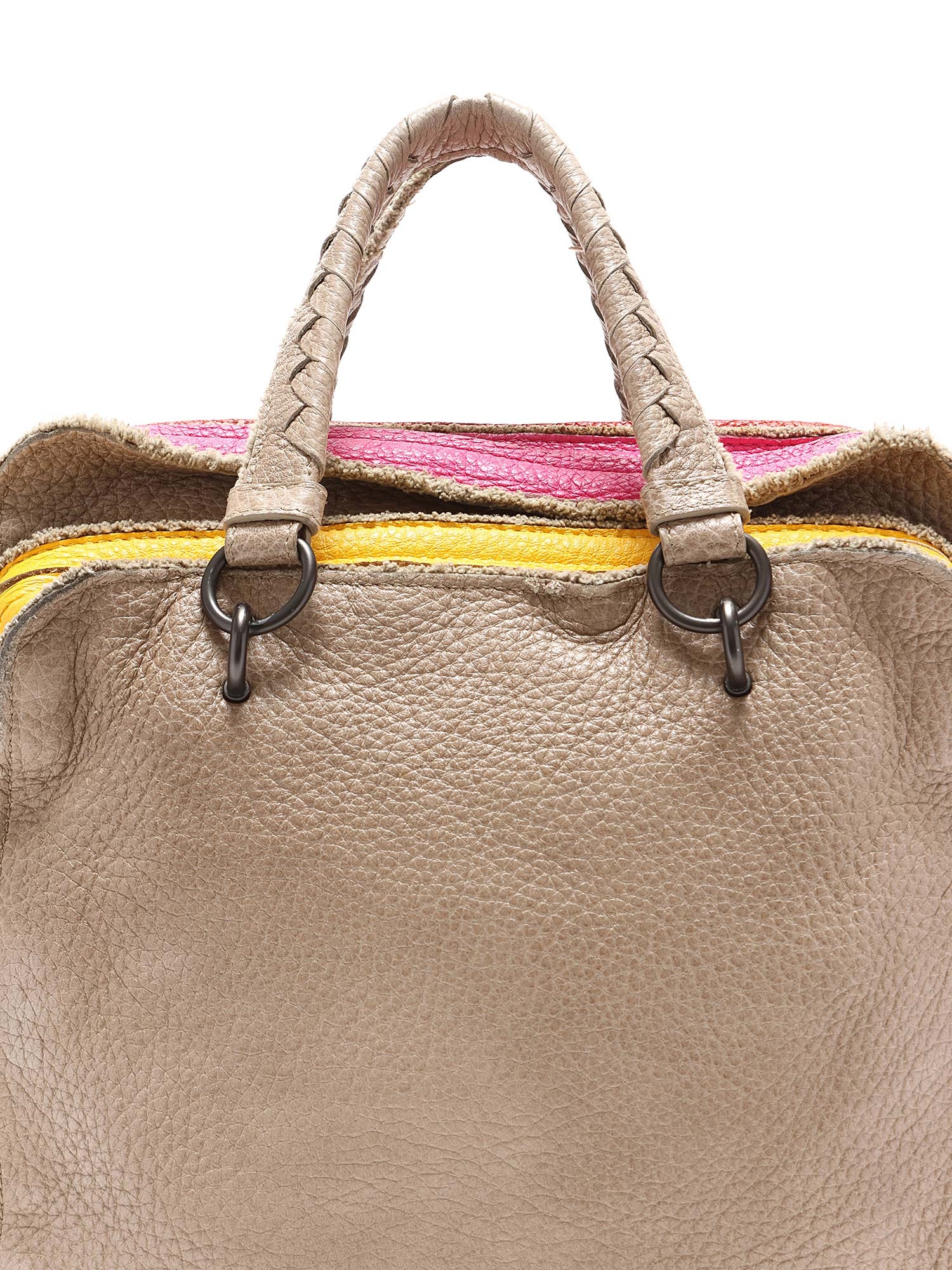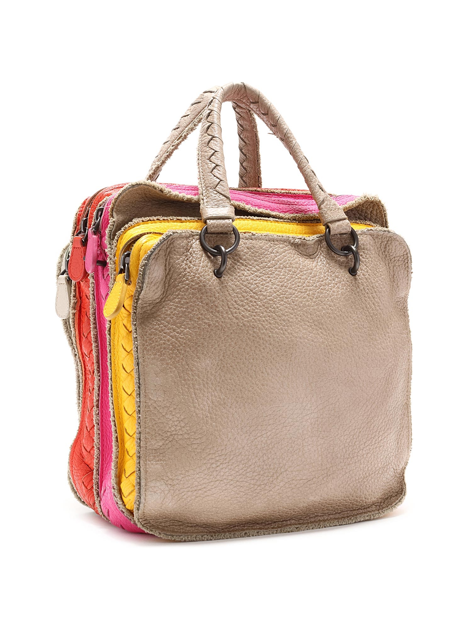 Intrecciato multicolor satchel in taupe with pink, orange, and yellow accents. Featuring woven pattern, leather trims, leather handles, and adjustable shoulder strap.