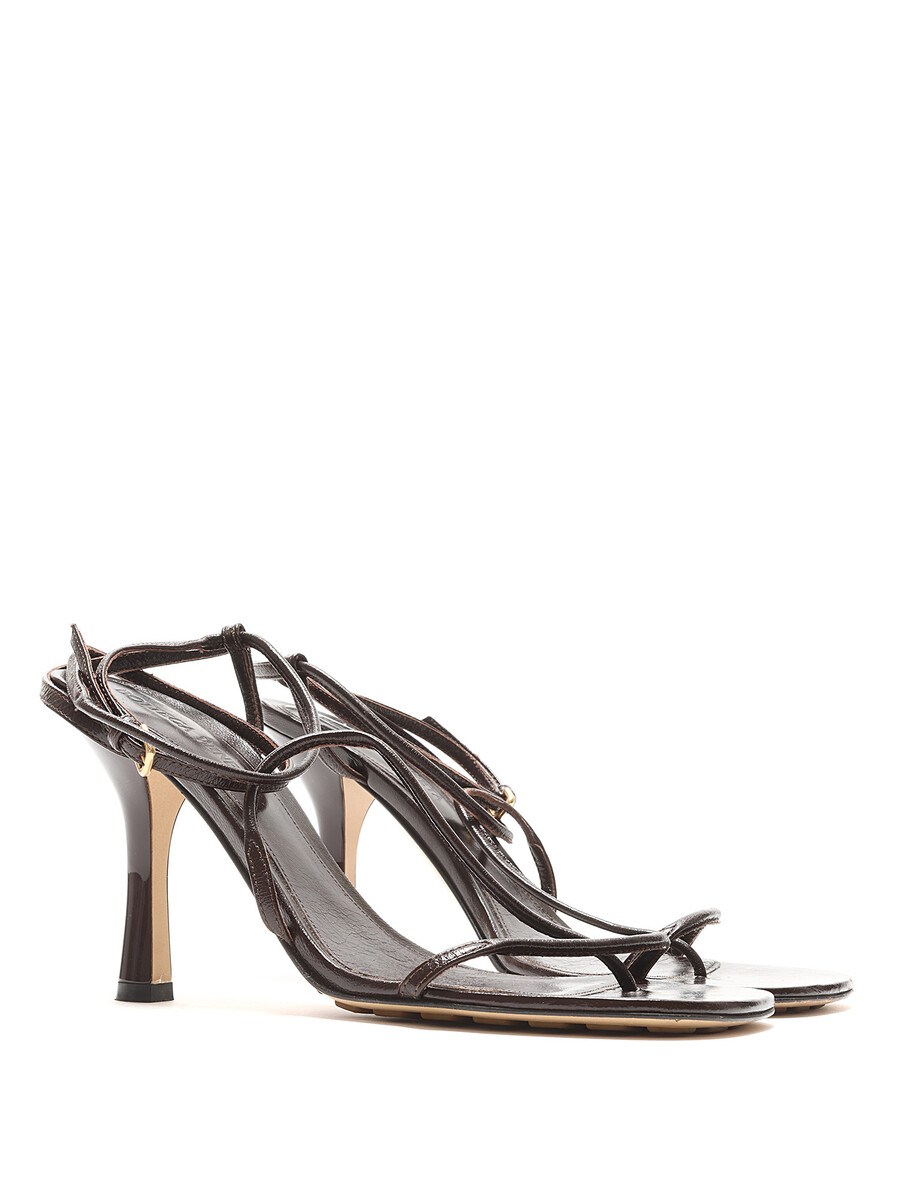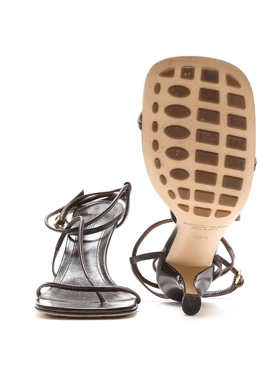 Strappy sandals in dark brown with crisscross laces. Square toe style. Gold metal buckle closure. Rubber sole. With box.